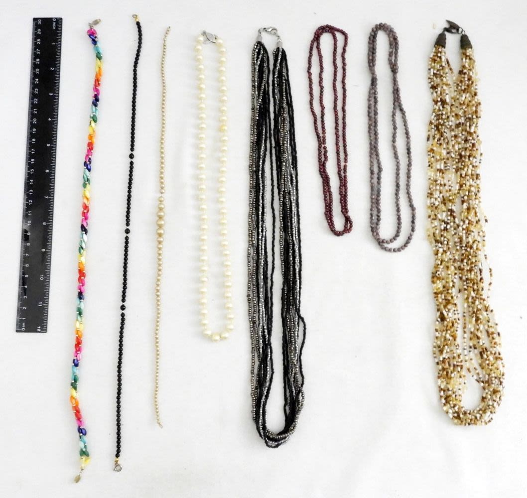 FAUX PEARLS & MULTI COLORED BEADS – LENGTHS VARY 15″-36″; (1) CLASP IS BROKEN
