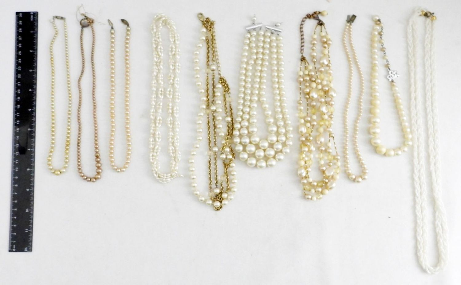 LARGE & SMALL FAUX PEARL OF DIFFERENT COLOR SHADES, CLEAR / AMBER COLOR STONES – LENGTHS VARY 14″-54″; (1- CLASP IS BROKEN)