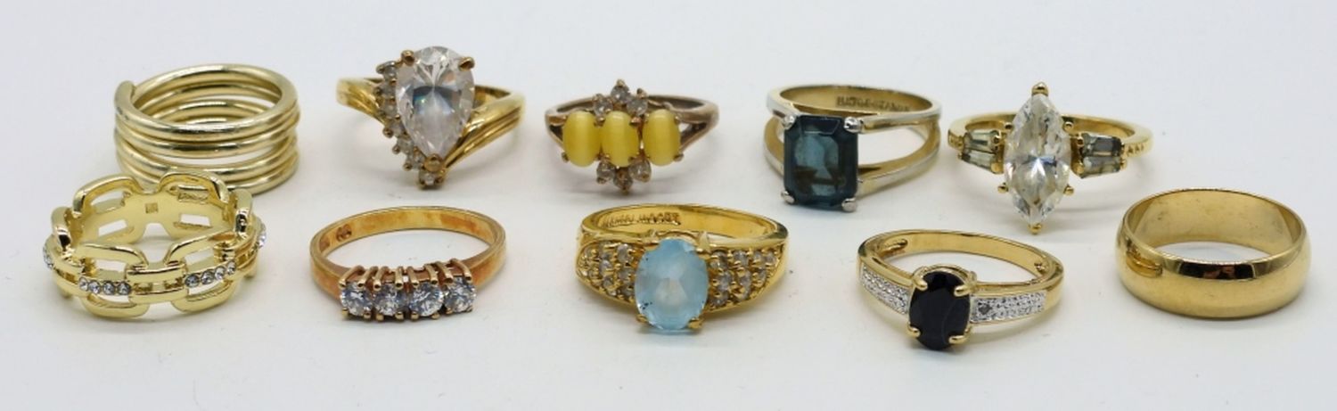 One gold tone plain band, one gold tone spiral band, one yellow cat’s eye and white rhinestone ring, one gold tone square cut blue stone ring, one gold tone pear shaped white rhinestone ring, one gold tone white rhinestone chain link ring, one marquise shaped white stone and baguette side stones ring, one gold tone dark blue stone ring, one gold tone white rhinestone ring, and one gold tone light blue oval stone ring.