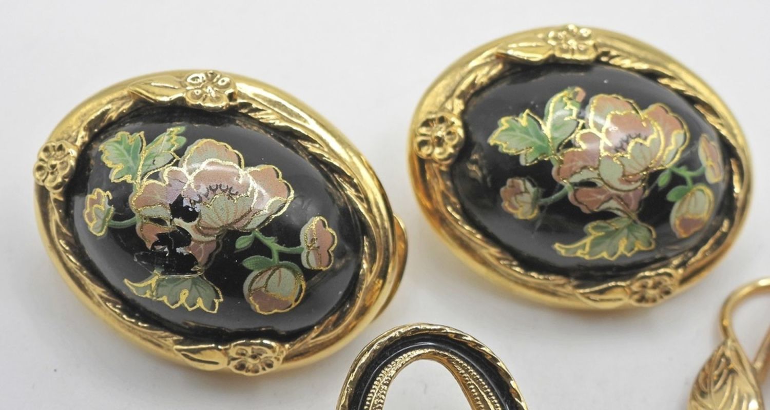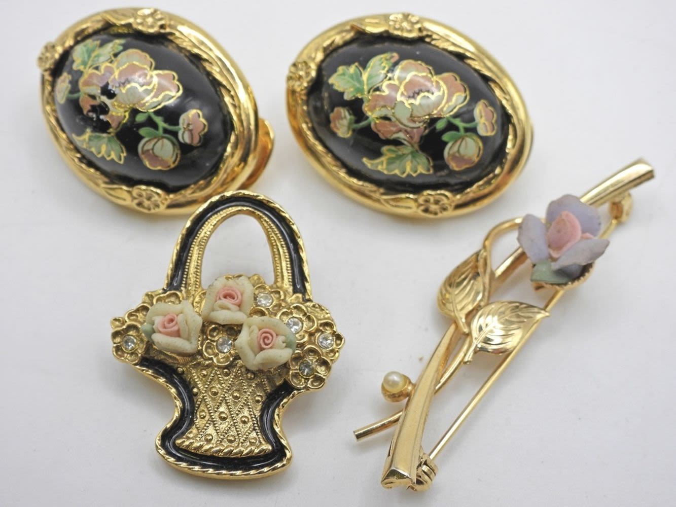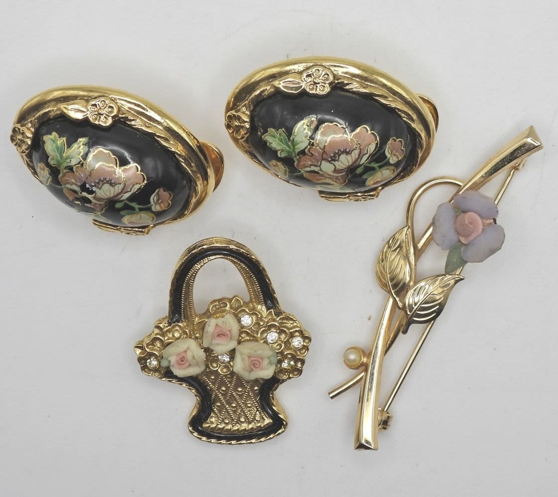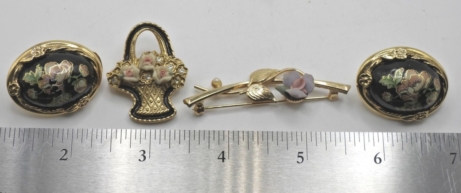 (2) PINS & (1) GOLD ETCHED FLOWER EARRINGS