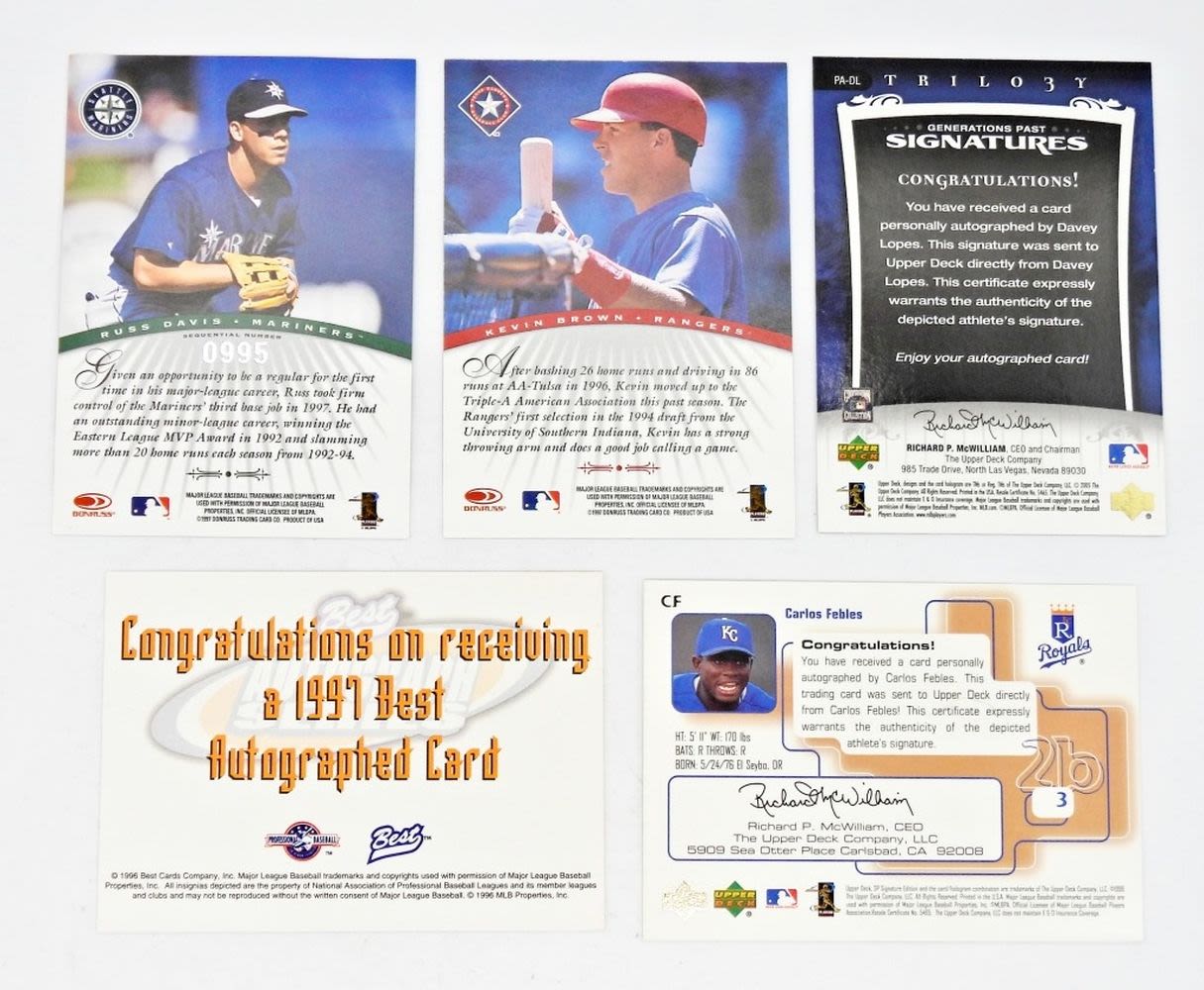 DONRUSS SIGNATURE SERIES – RUSS DAVIS, KEVIN BROWN; UPPER DECK SIGNATURES – DAVEY LOPES, CARLOS FEBLES; BEST CARDS – RANDY WINN; VERY NICE CONDITION