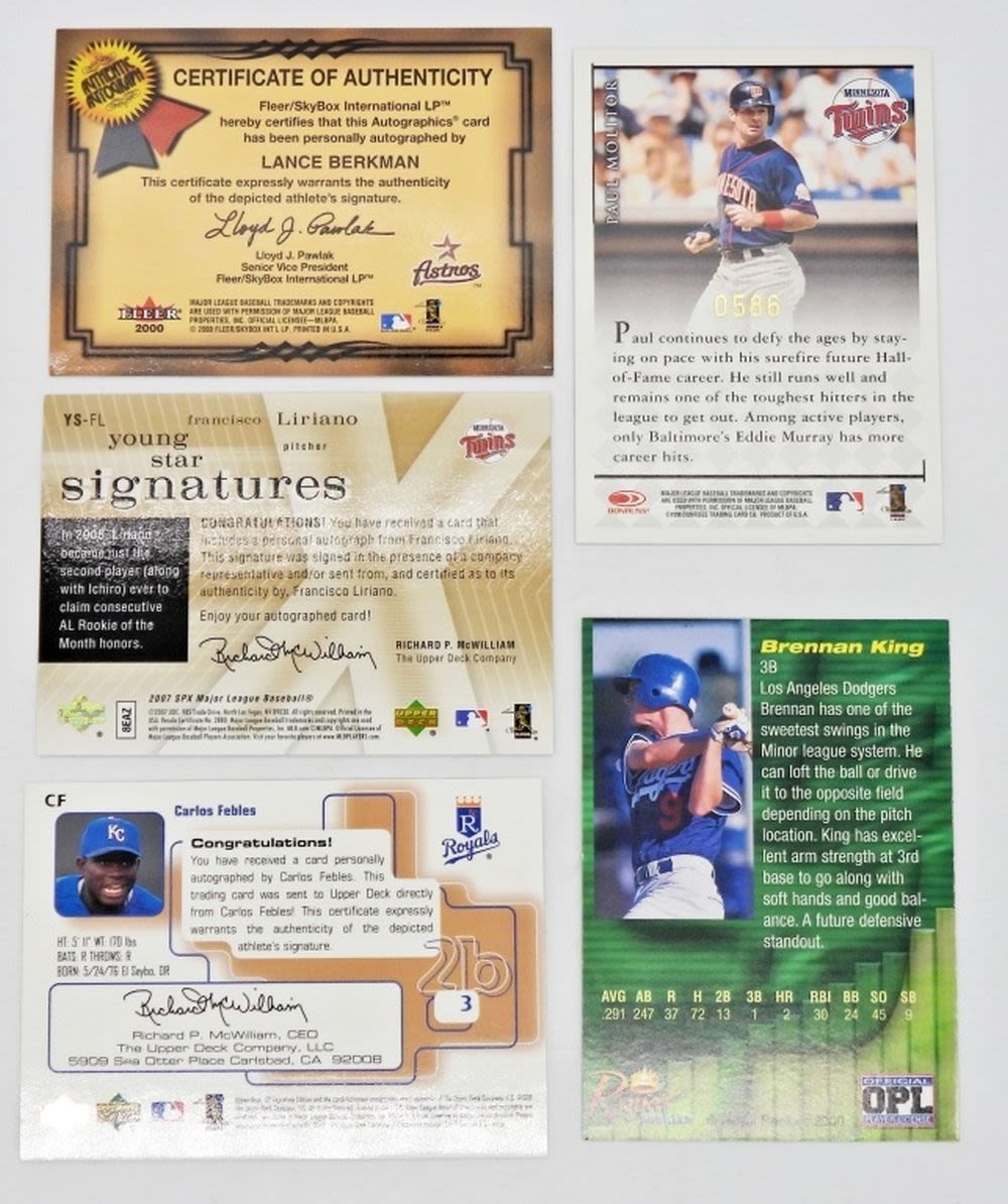 ROYAL ROOKIES – BRENNAN KING; FLEER AUTOGRAPHICS – LANCE BERKMAN; DONRUSS SIGNATURE SERIES – PAUL MOLITOR; UPPER DECK SIGNATURE EDITION – CARLOS FEBLES, FRANCISCO LIRIANO