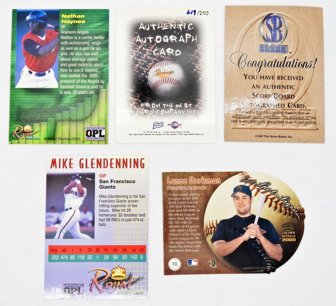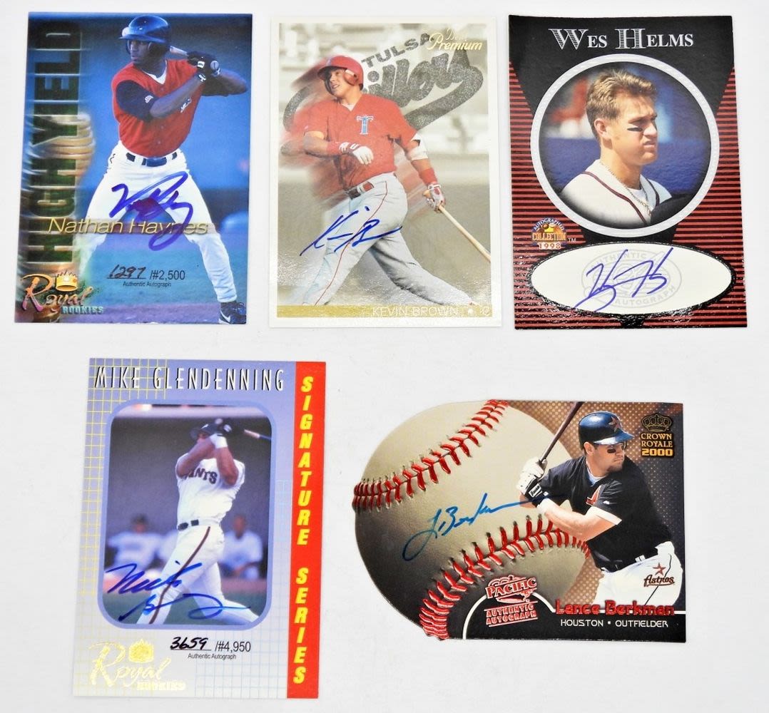 ROYAL ROOKIES – NATHAN HAYNES & MIKE GLENDENNING; SCORE BOARD AUTOGRAPHED COLLECTION – WES HELMS; PACIFIC AUTHENTIC AUTOGRAPH – LANCE BERKMAN; BEST CARDS – KEVIN BROWN; VERY NICE CONDITION