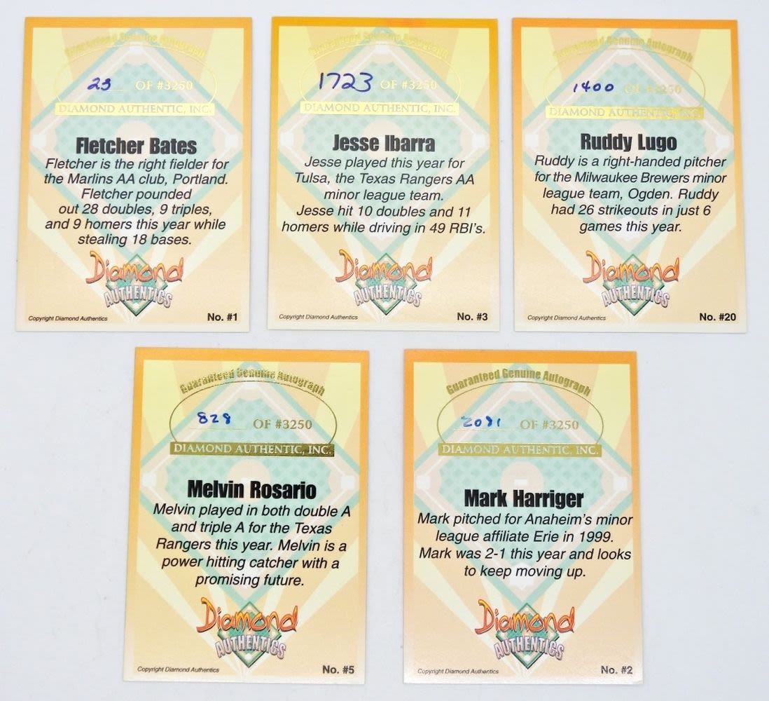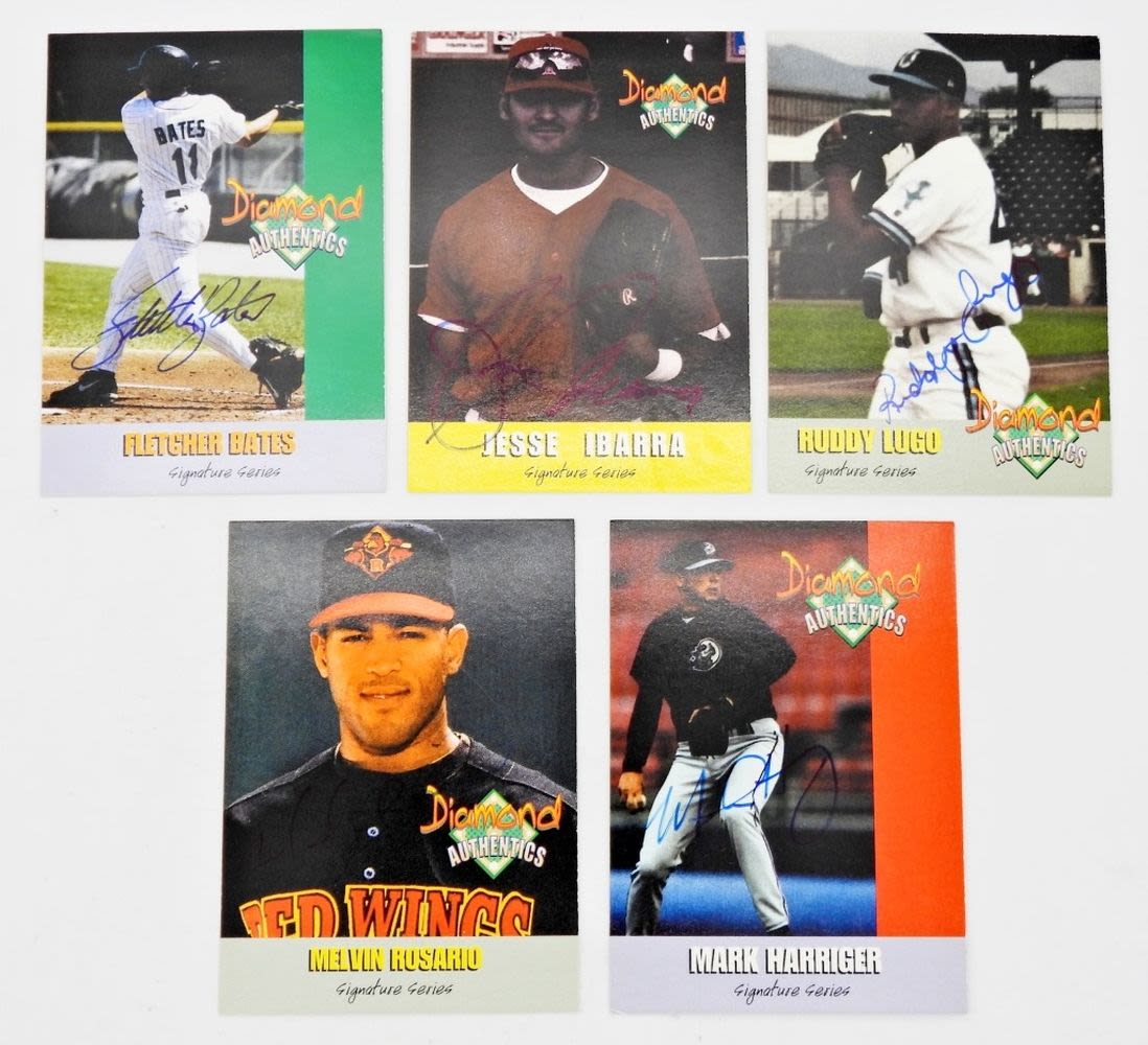 DIAMOND AUTHENTICS AUTOGRAPHED BASEBALL CARDS INCLUDING: MELVIN ROSARIO, FLETCHER BATES, JESSE IBARRA, MARK HARRINGER, & RUDDY LUGO; VERY NICE CONDITION