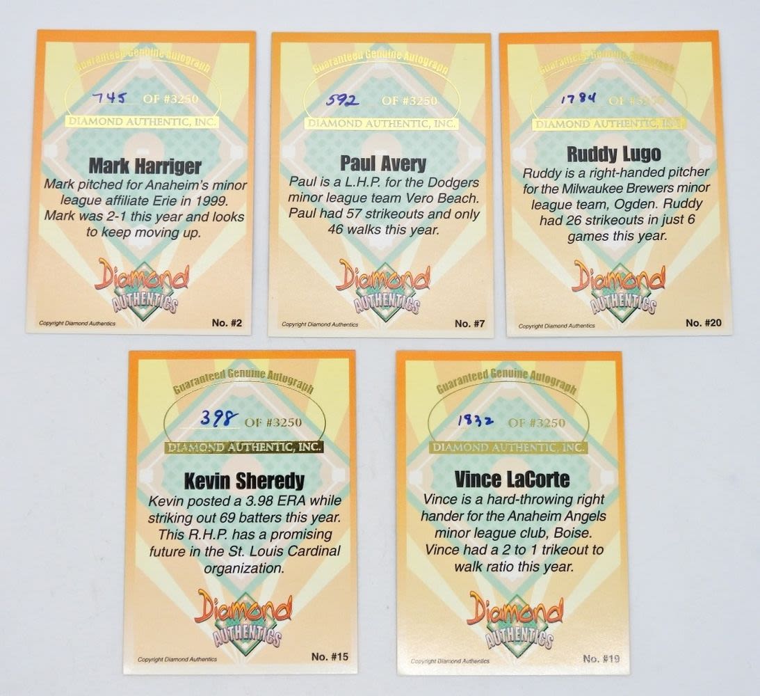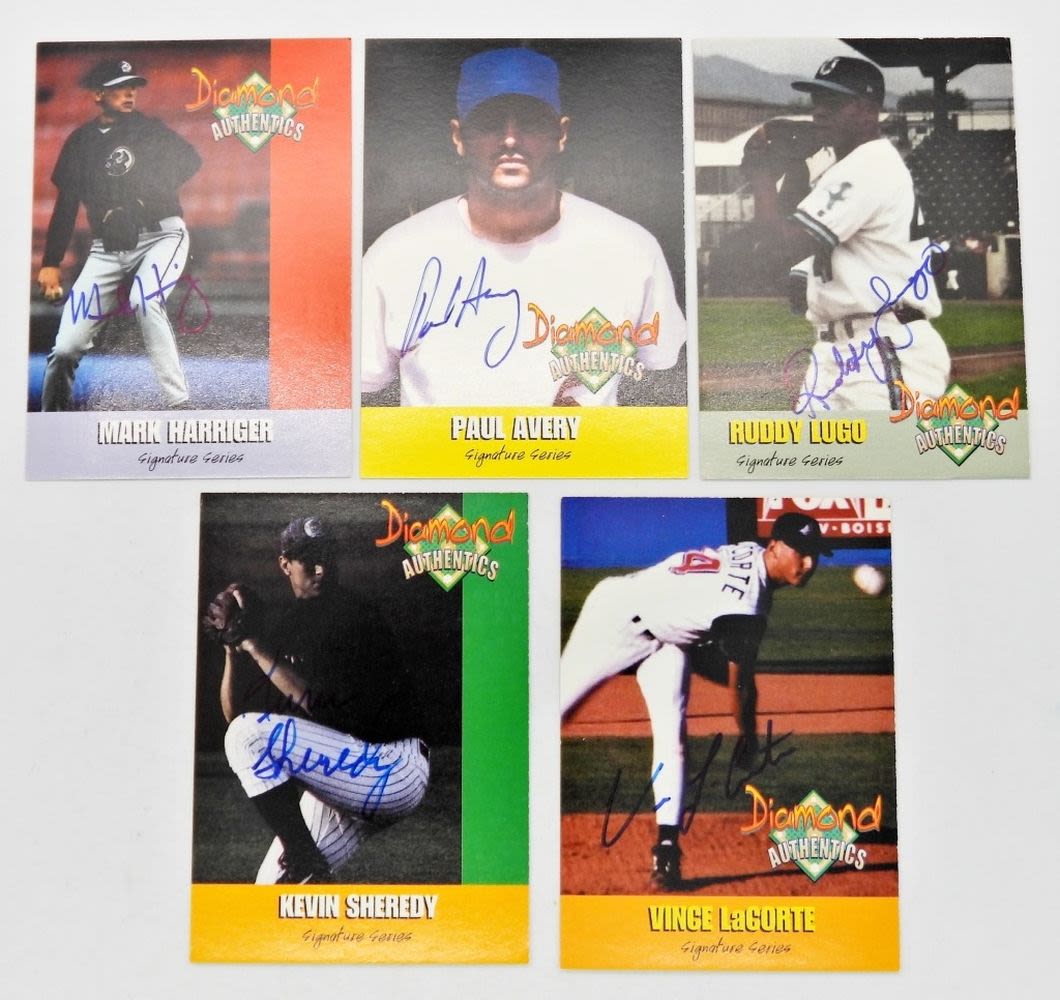 DIAMOND AUTHENTICS AUTOGRAPHED BASEBALL CARDS INCLUDING: KEVIN SHEREDY, PAUL AVERY, VINCE LaCORTE, MARK HARRINGER & RUDDY LUGO; VERY NICE CONDITION