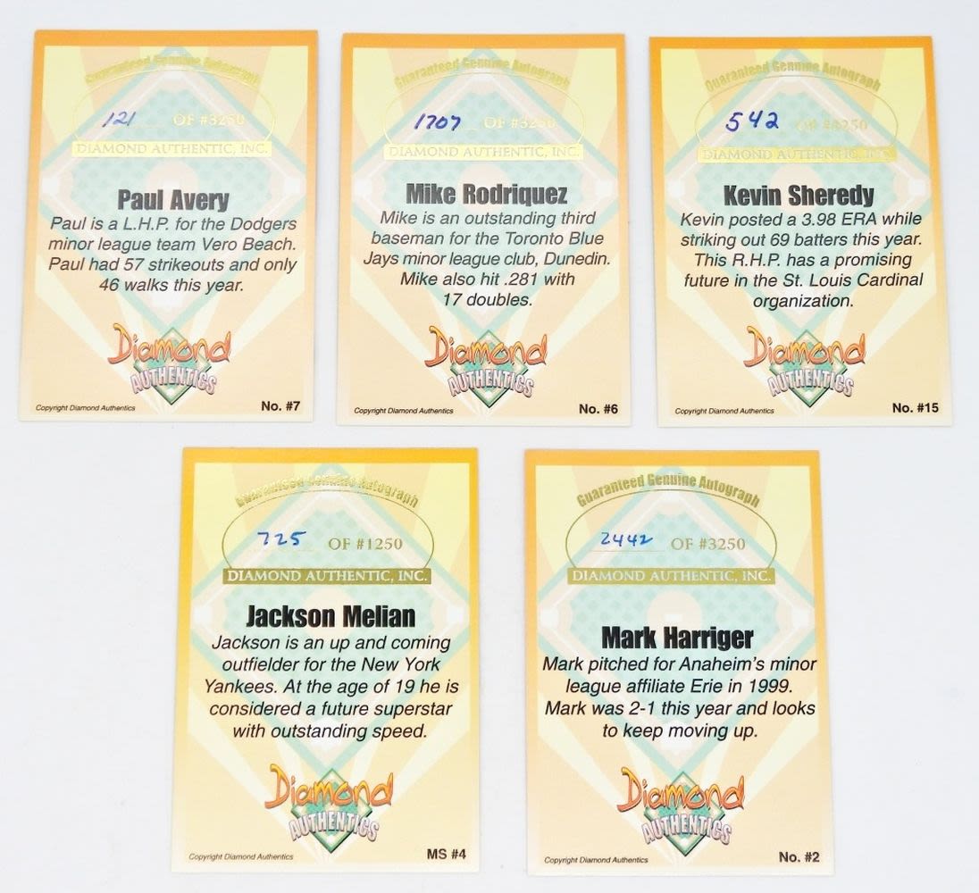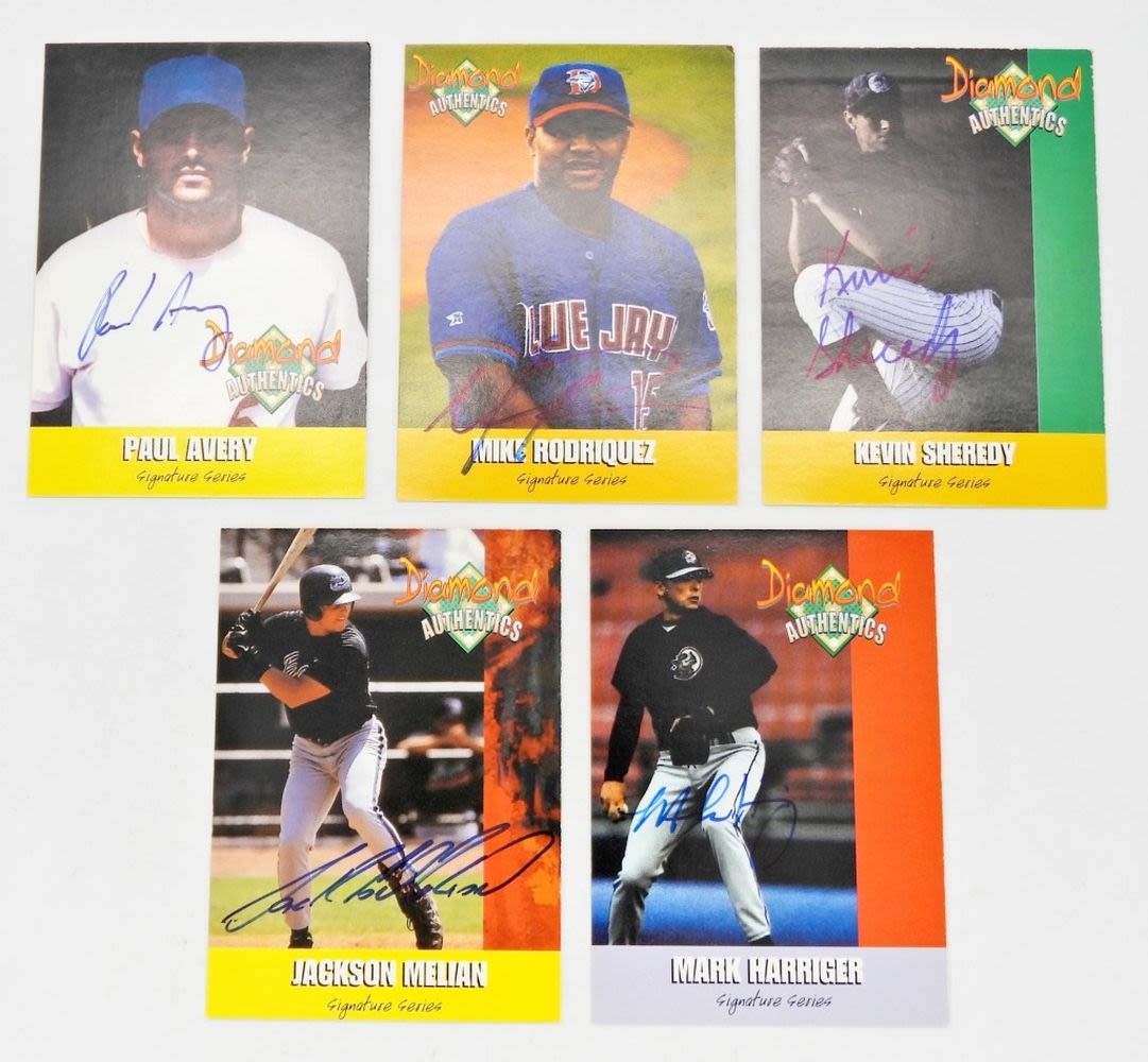 DIAMOND AUTHENTICS AUTOGRAPHED BASEBALL CARDS INCLUDING: JACKSON MELIAN, MIKE RODRIGUEZ, PAUL AVERY, MARK HARRINGER, & KEVIN SHEREDY; VERY NICE CONDITION
