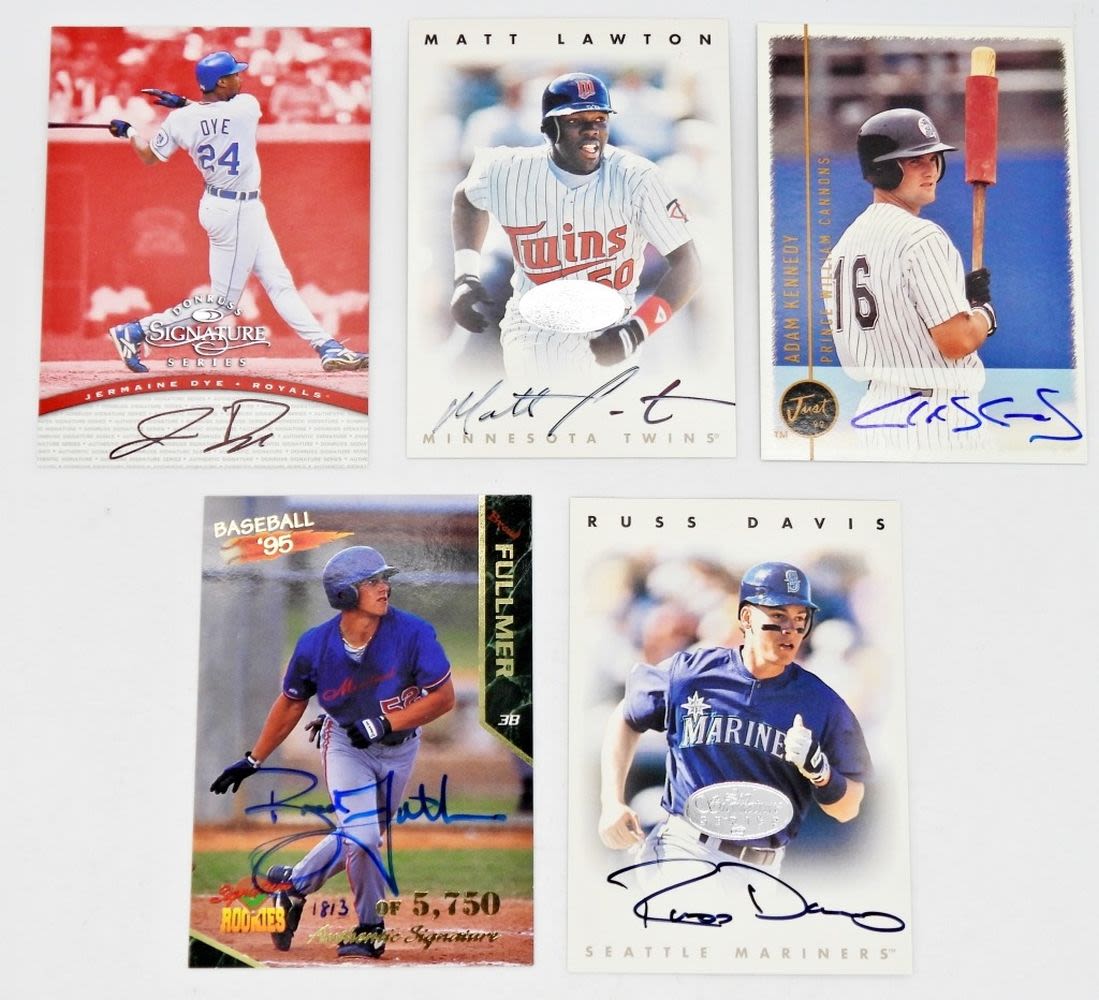 LEAF SIGNATURE SERIES – RUSS DAVIS & MATT LAWTON, DONRUSS SIGNATURE SERIES – JERMAINE DYE, SIGNATURE ROOKIES – BRAD FULLMER, JUST MINORS – ADAM KENNEDY; VERY NICE CONDITION