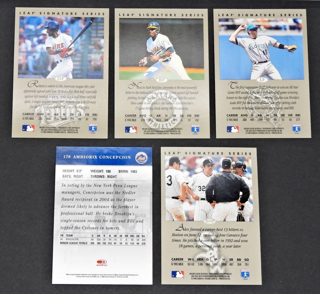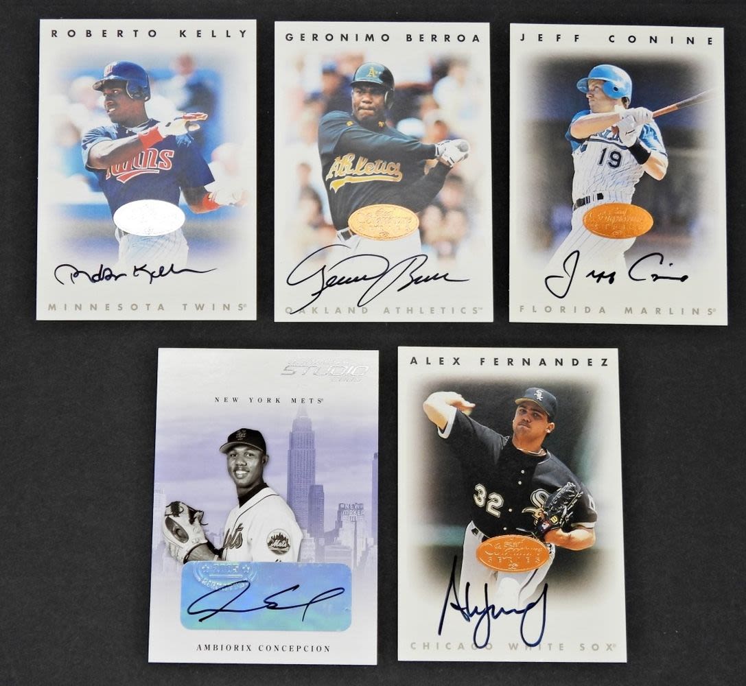 DONRUSS STUDIO 2005 – AMBIORIX CONCEPCION; LEAF SIGNATURE SERIES – GERONIMO BERROA, ROBERTO KELLY, ALEX FERNANDEZ, & JEFF CONINE; VERY NICE CONDITION