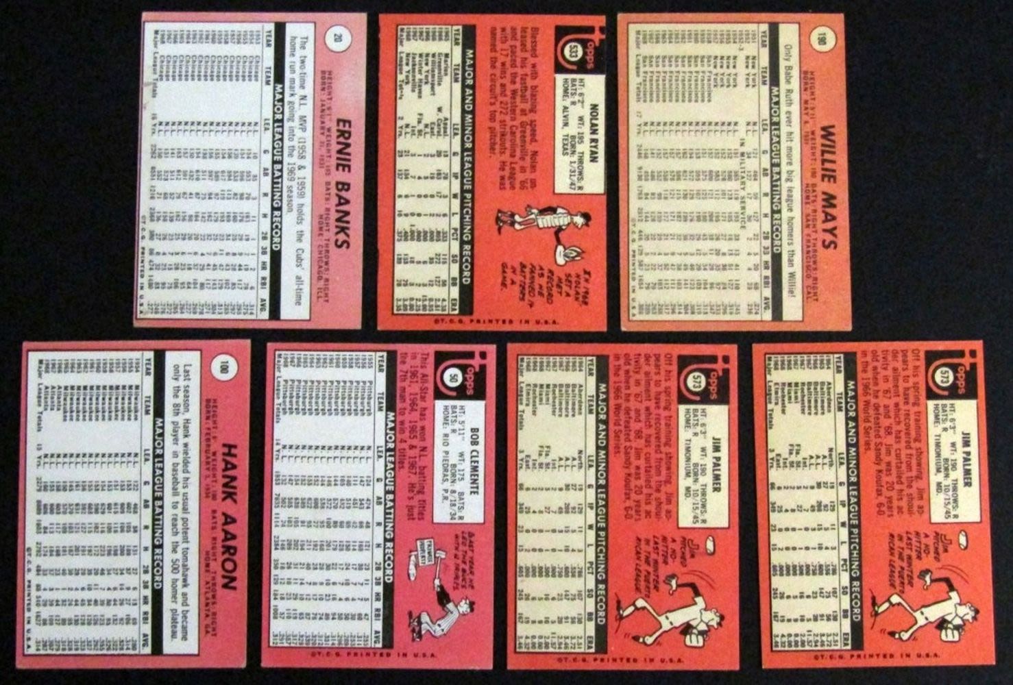 ERNIE BANKS, NOLAN RYAN, WILLIE MAYS, HANK AARON, ROBERTO CLEMENTE, (2) JIM PALMER – ALL VERY NICE EX/EM – GREAT COLOR & GLOSS