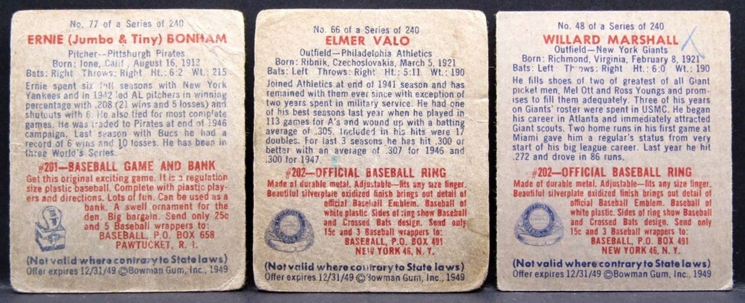 1949 #48 WILLARD MARSHALL, #66 ELMER VALO, #77 ERNIE BONHAM moslty GOOD/VG & 1950 BOWMAN #26 GRADY HATTON NICE EM/NM