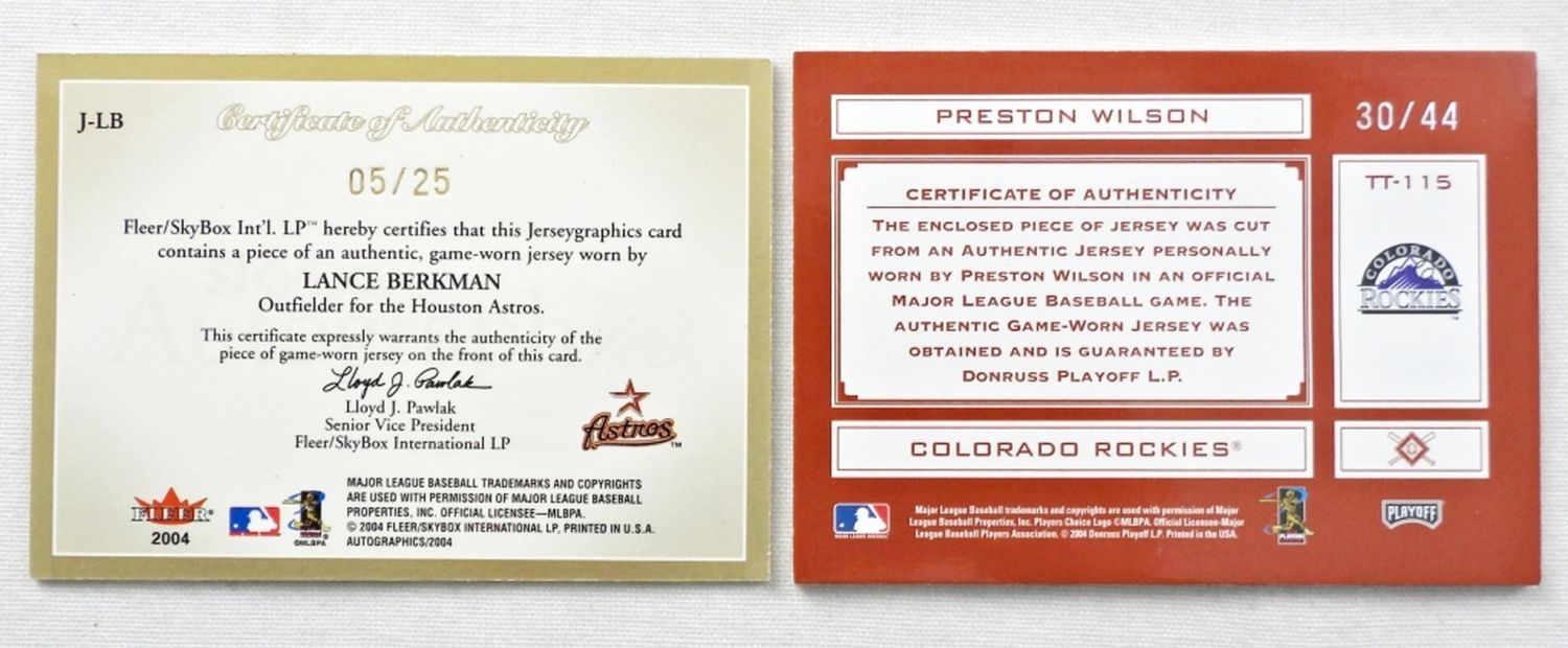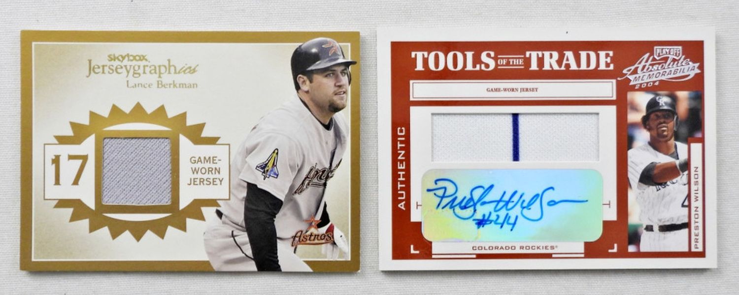 ABSOLUTE MEMORABILIA PRESTON WILSON AUTOGRAPHED GAME-WORN JERSEY PATCH CARD; SKYBOX JERSEYGRAPHICS LANCE BERKMAN GAME-WORN JERSEY PATCH CARD