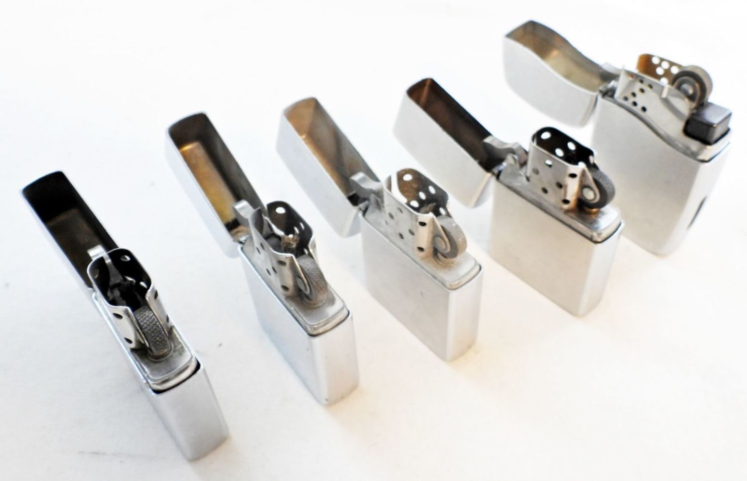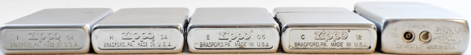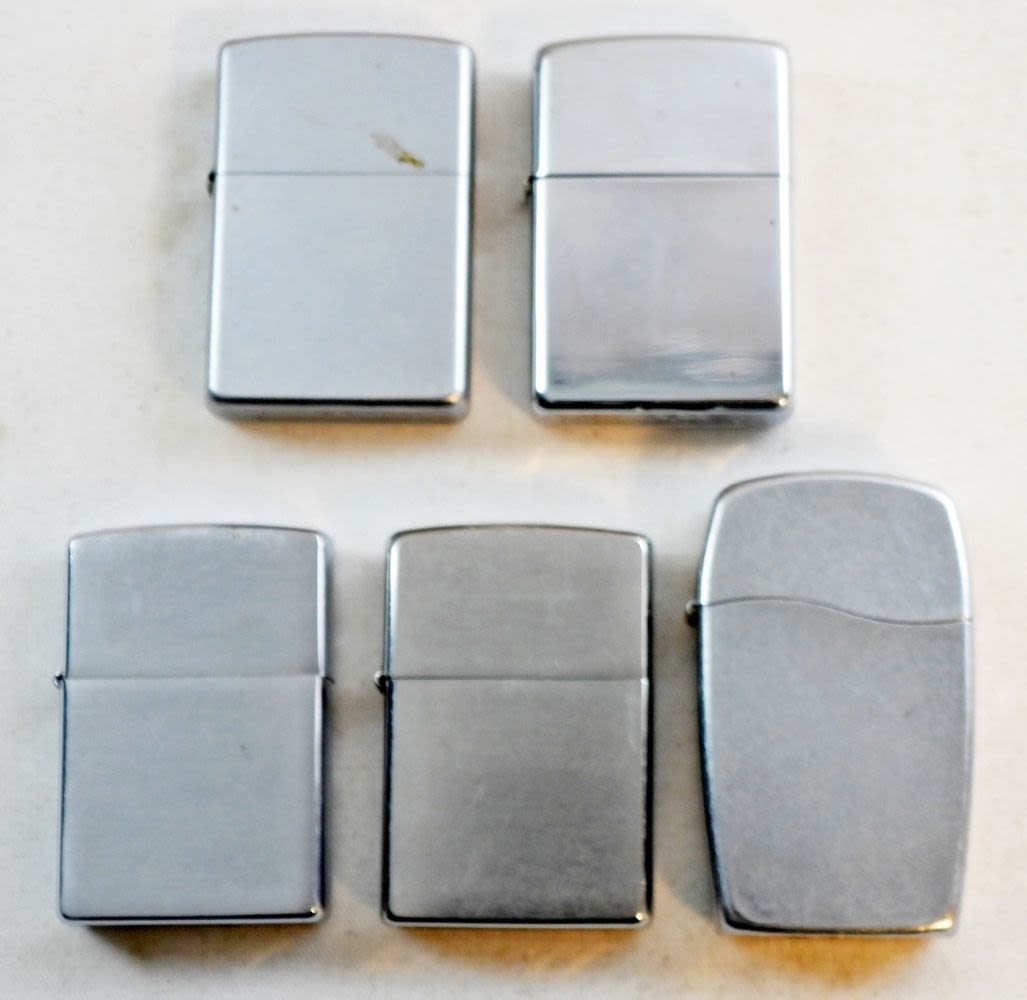 BRUSHED CHROME SILVER TONE ZIPPO LIGHTERS; (2) 2004, (2) 2005, & 2012; USED CONDITION