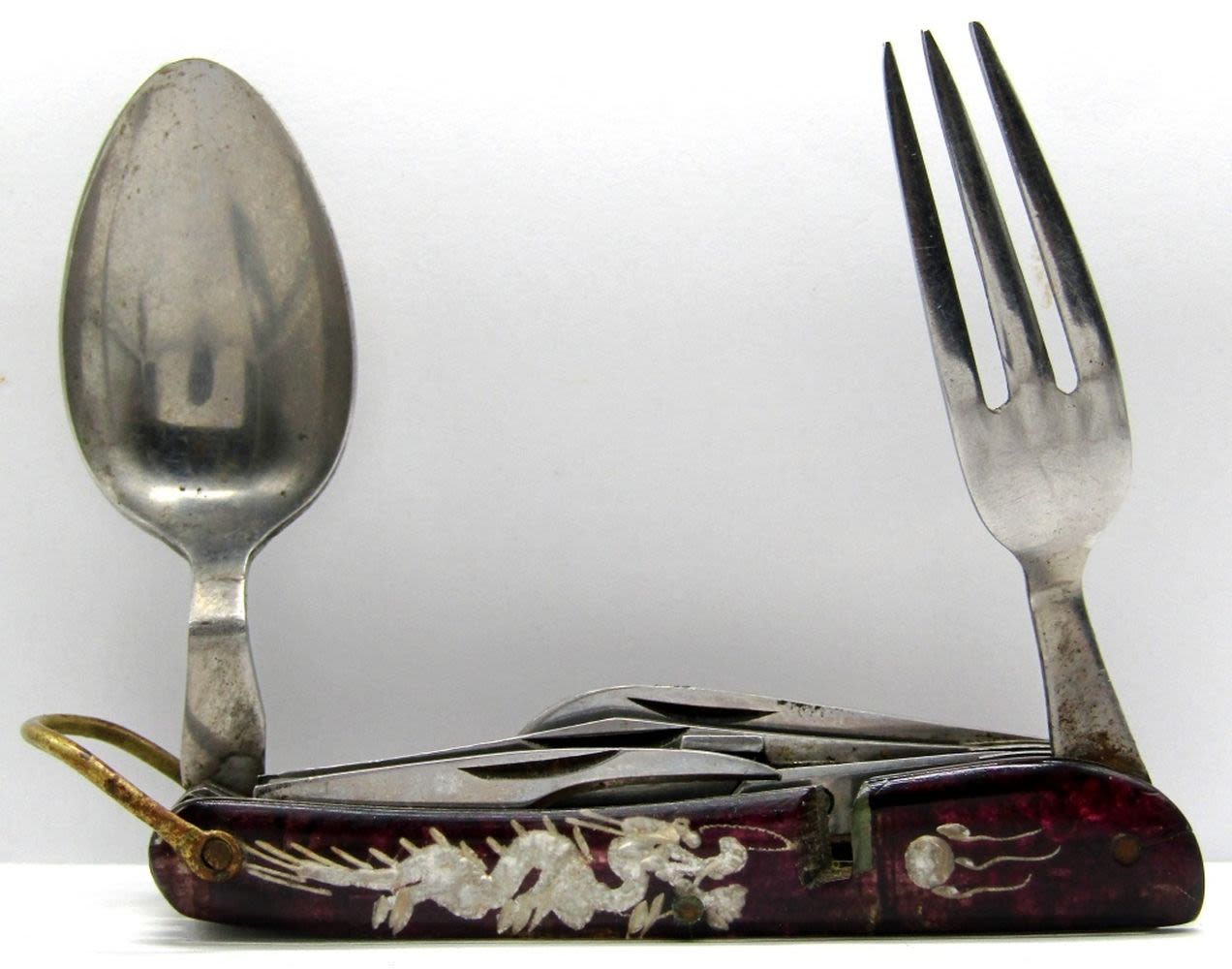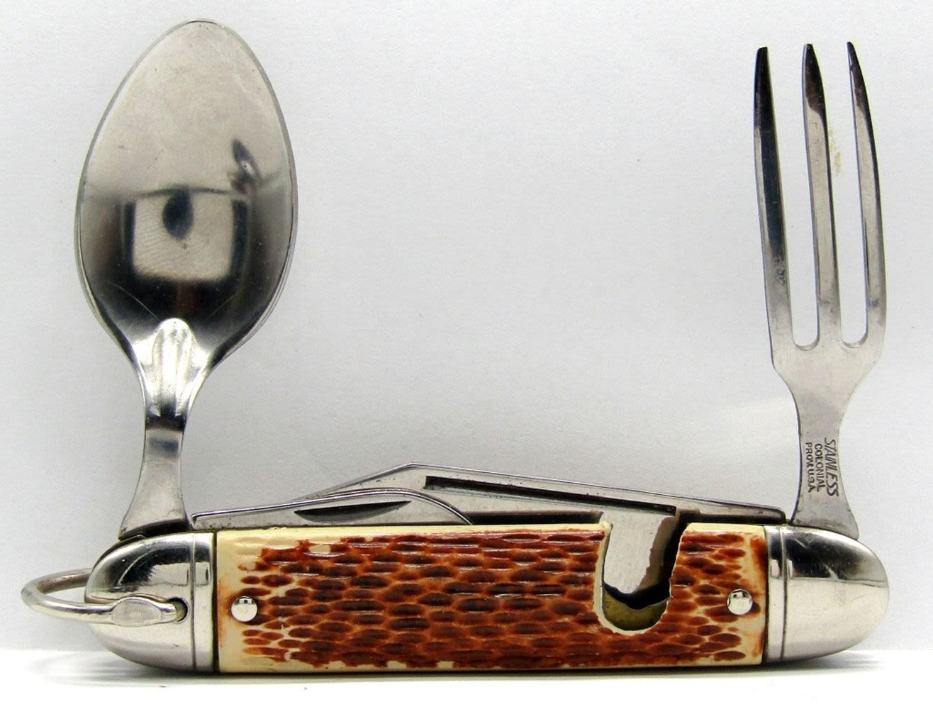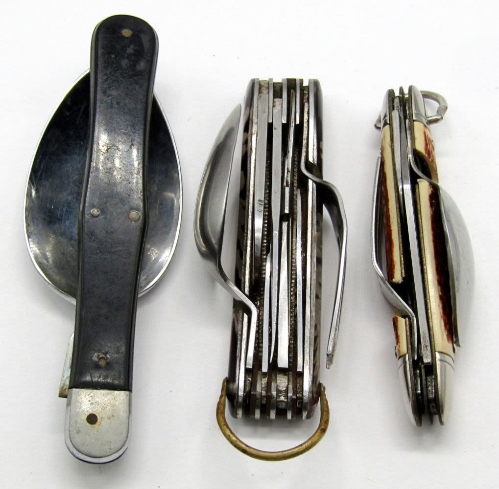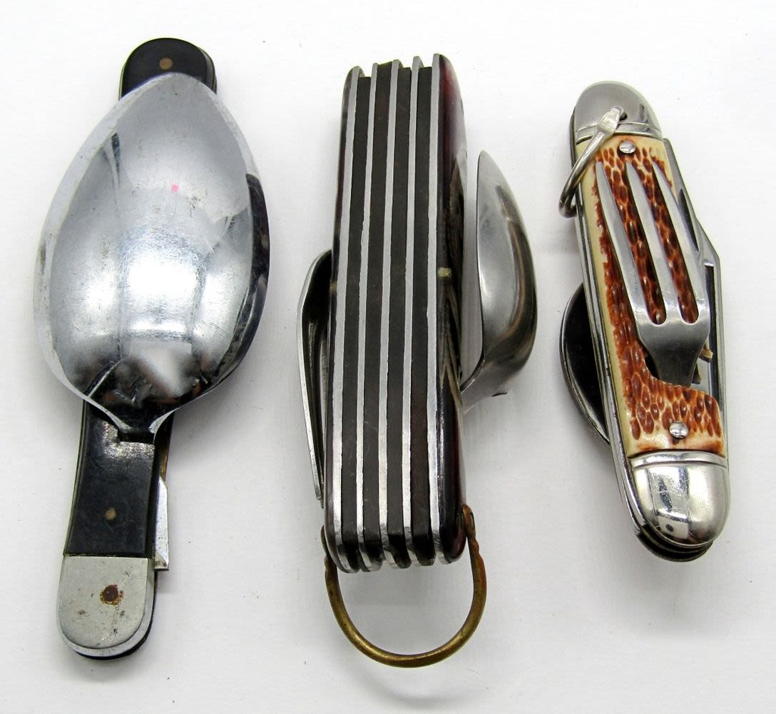 Colonial Prov. RI Knife, Spoon, Fork; Single Spoon Unmarked; Multi-Tool/Hobo Knife Set – Unmarked; Used.