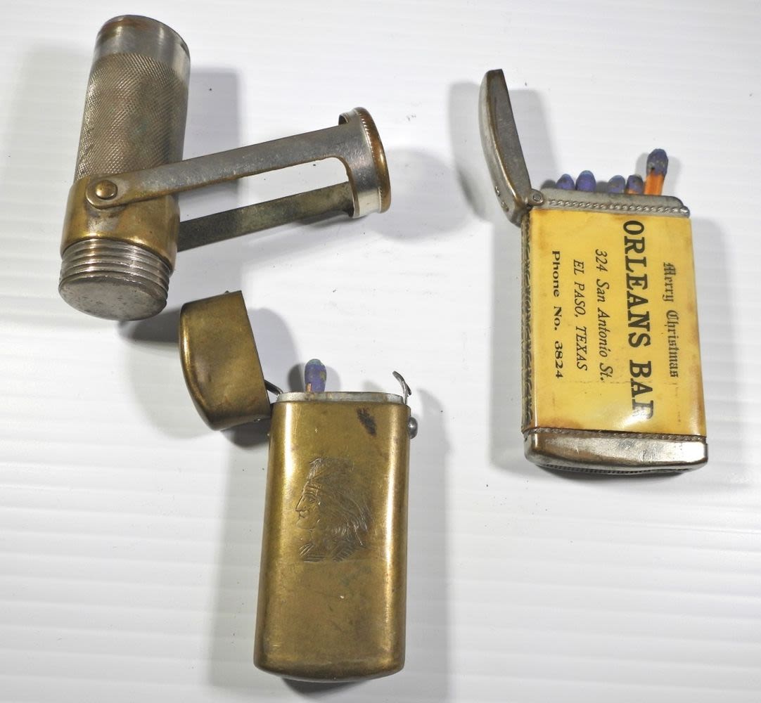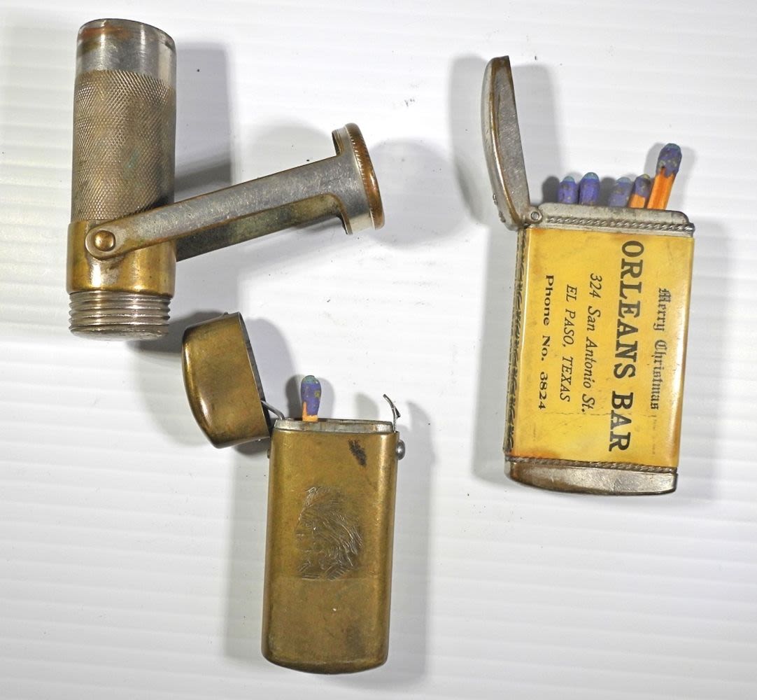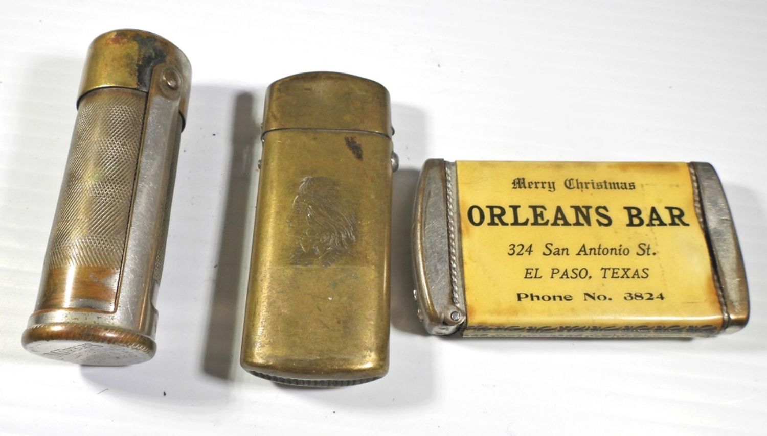 MARBLE’S GLADSTONE TUBE STYLE, BRASS INDIAN CHIEF PUSH BUTTON CASE & ORLEANS BAR EL PASO TX ADVERTISEMENT CASE w/LADY