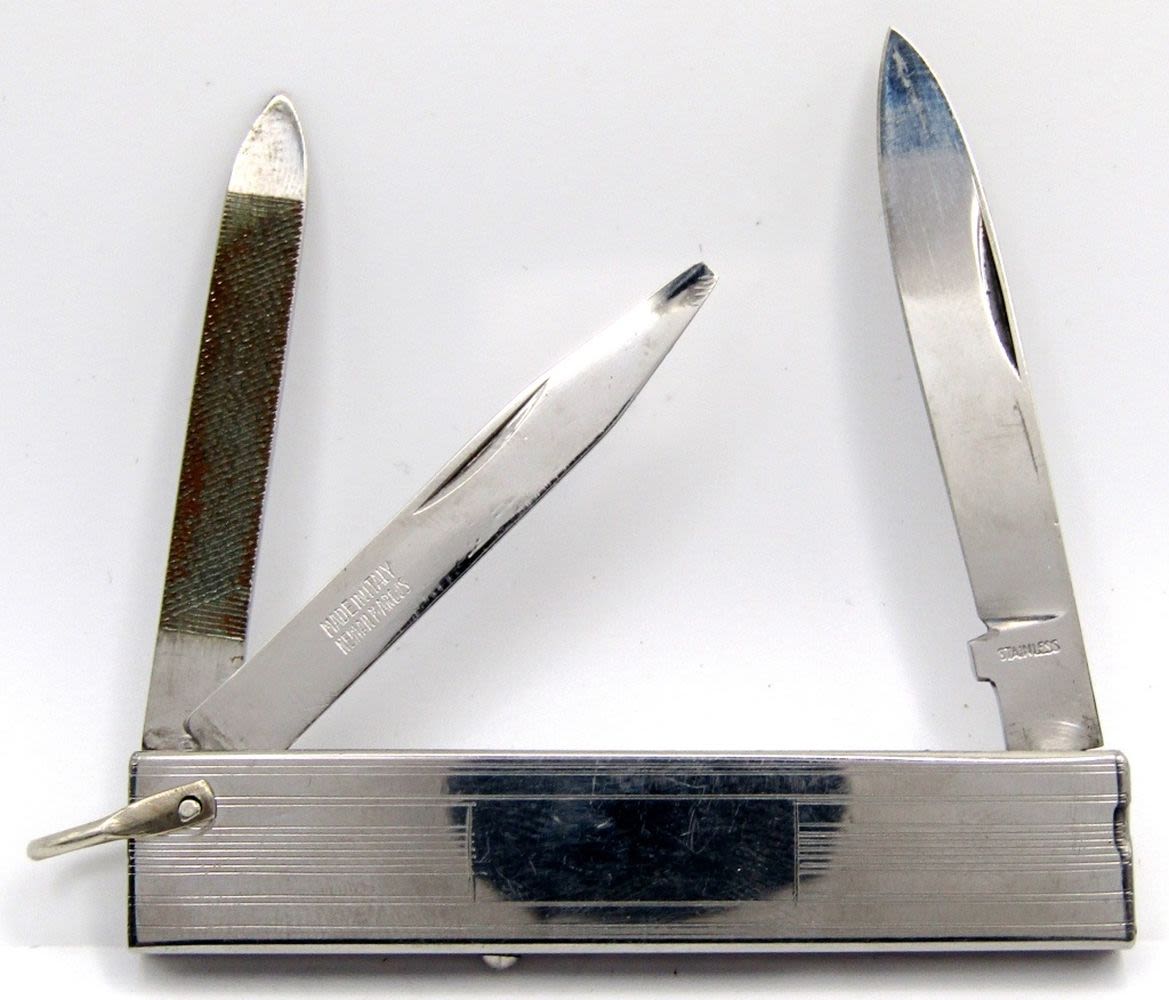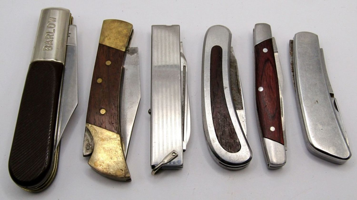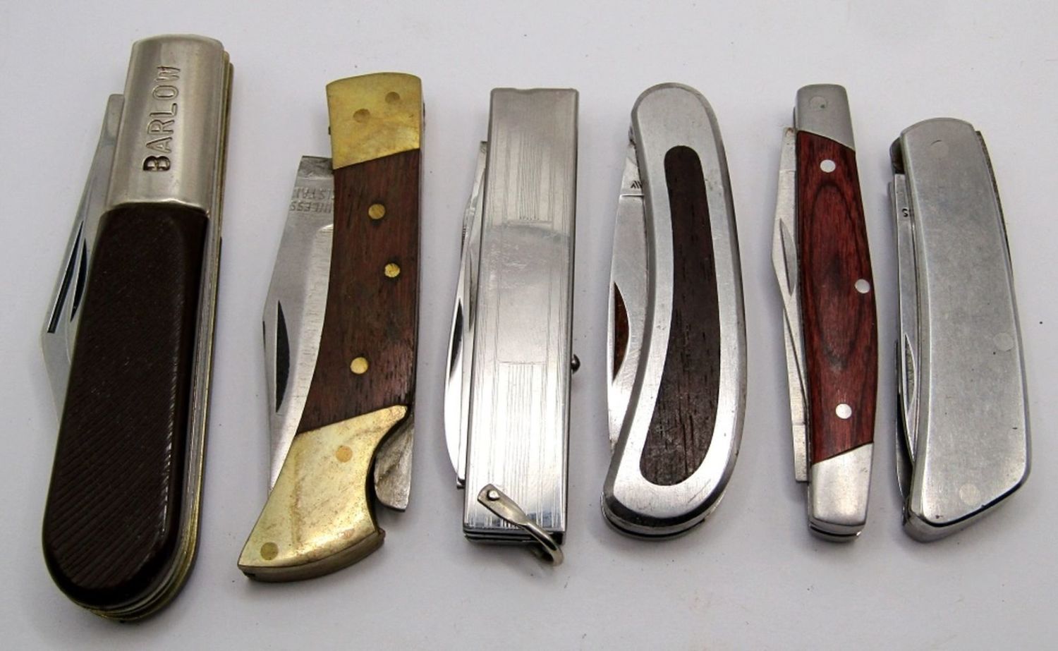 2-Blade Barlow Sabre 603, Single Blade Stainless Pakistan, 2-Blade Kershaw 2001, 2-Blade Winchester, Multi-Blade/Tool Stainless, 3-Blade Made in Italy Neiman Marcus; Used.