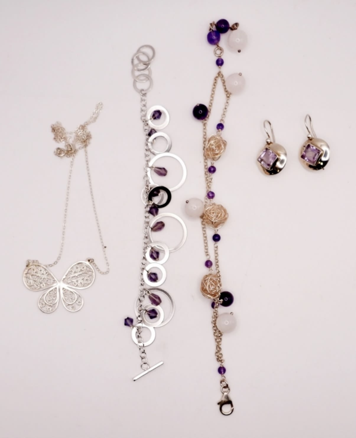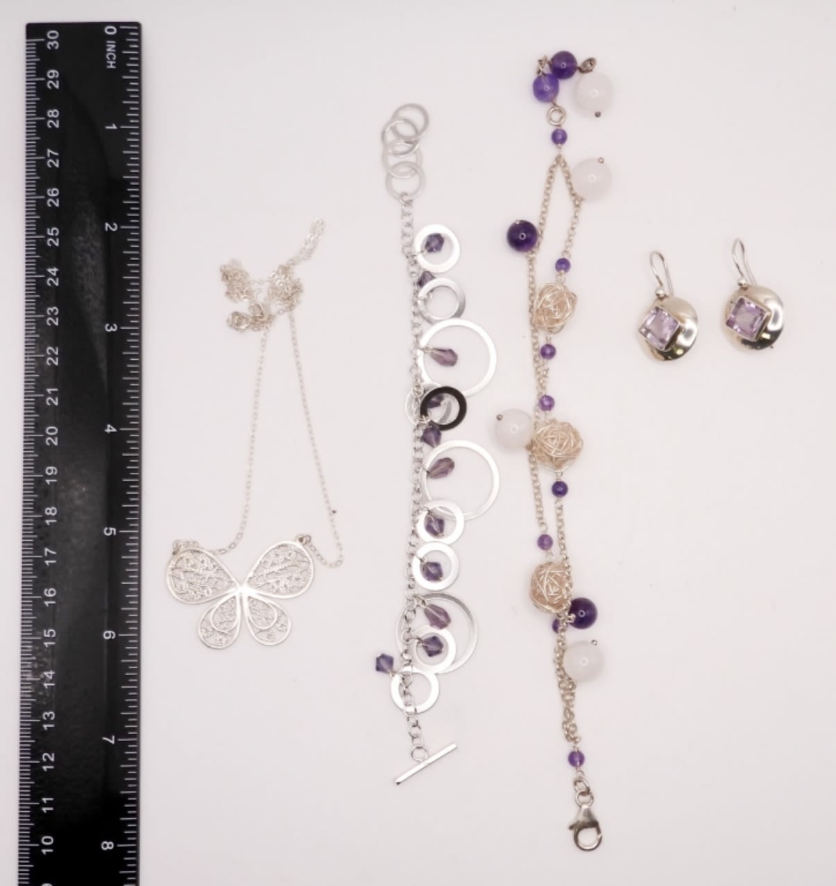 Two 7 inches bracelets with purple stones. Earrings measure 1 inch. Butterfly necklace is 18 inches. Very cute! (DWT 24.1