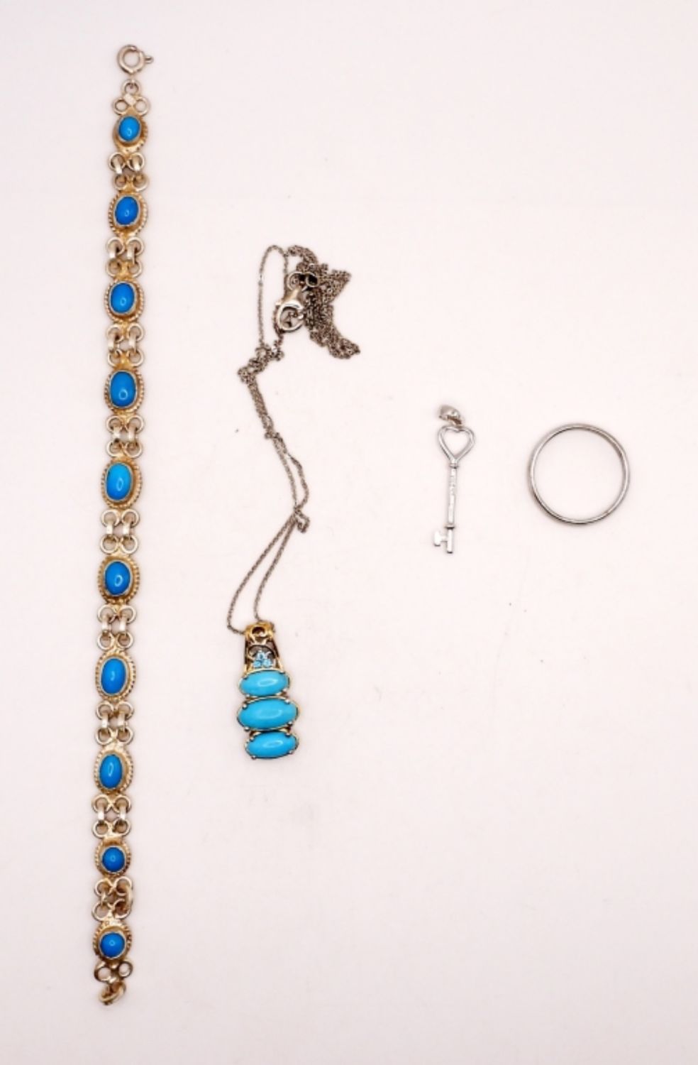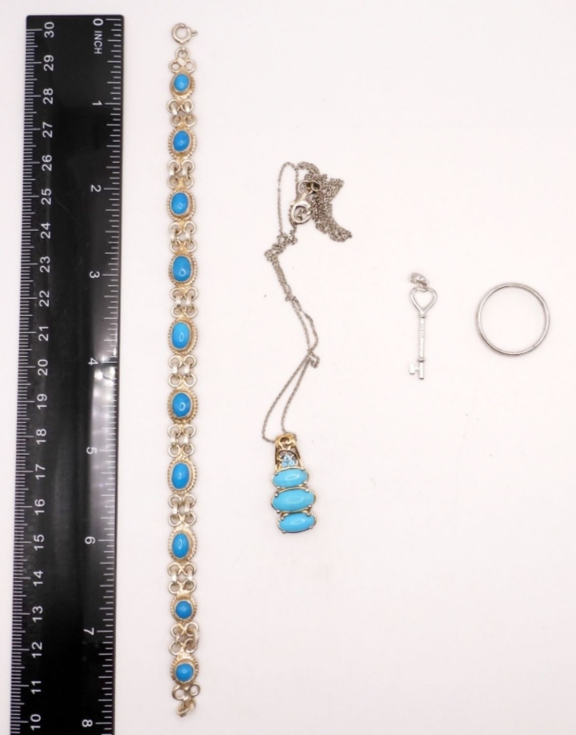 Bracelet 7inches, necklace 19 inches, ring size 9, plus 1 inch key pendant. Adorable! (DWT 15.2)