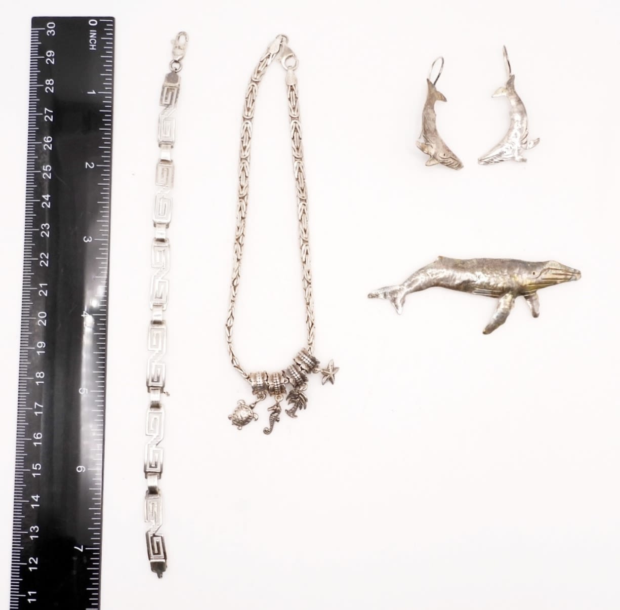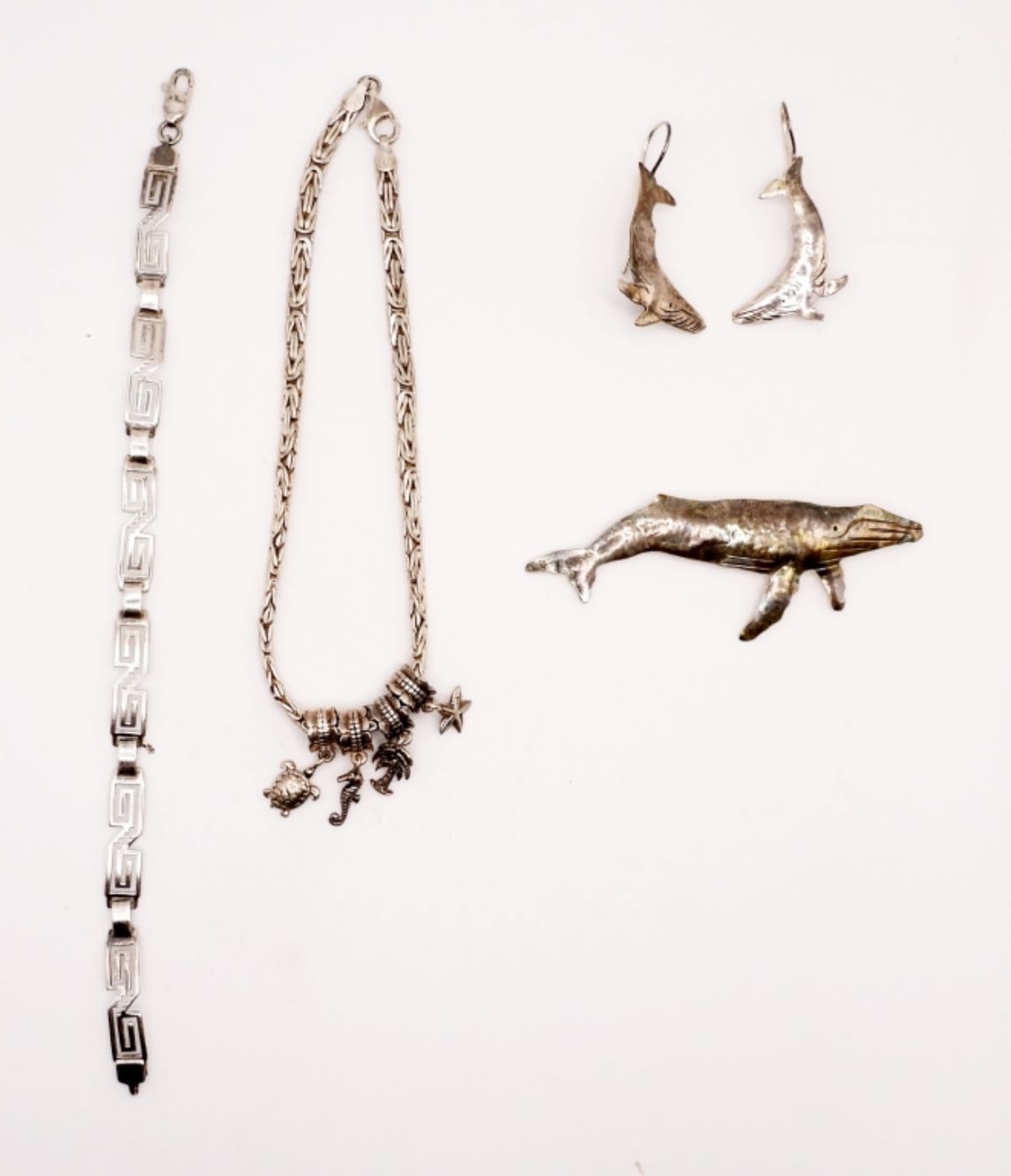 One 10 inch anklet with removable charms, Whale pin and matching earrings, and Greek key bracelet. Adorable set! (DWT 22.2)