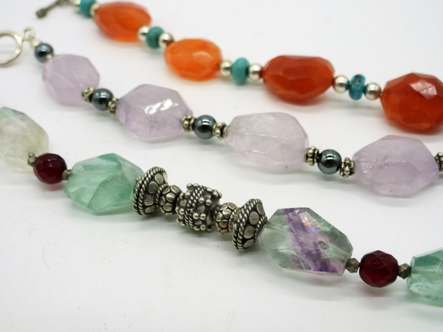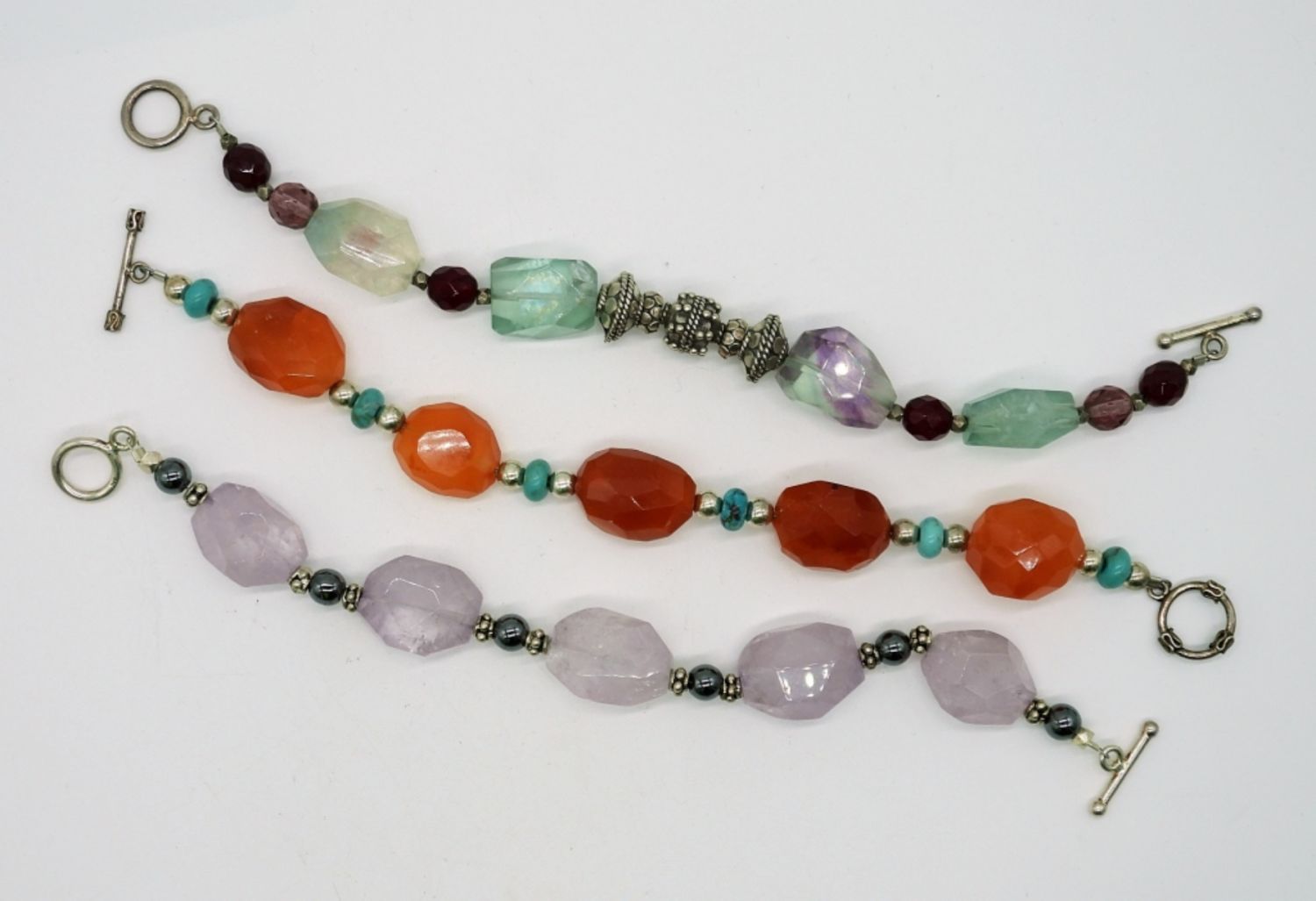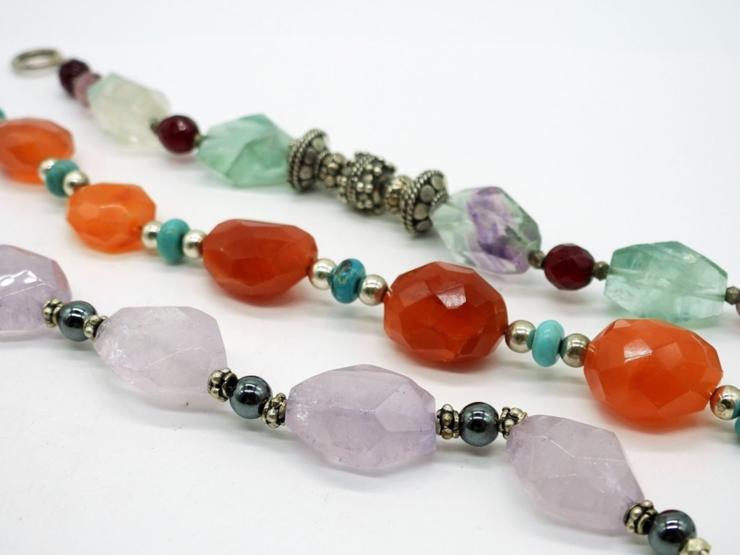 3 bracelets, all 8 inches long. One rainbow fluorite, one carnelian, and one amethyst. (DWT 65)
