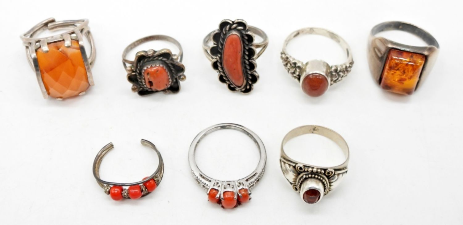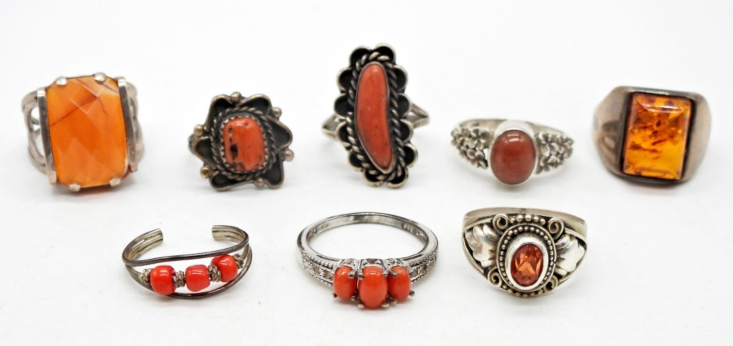 AMBER & ORANGE COLORED GEMSTONES & SMOOTH NATURAL STONES; STAMPED 925; SIZES VARY 5-9; 22 DWT