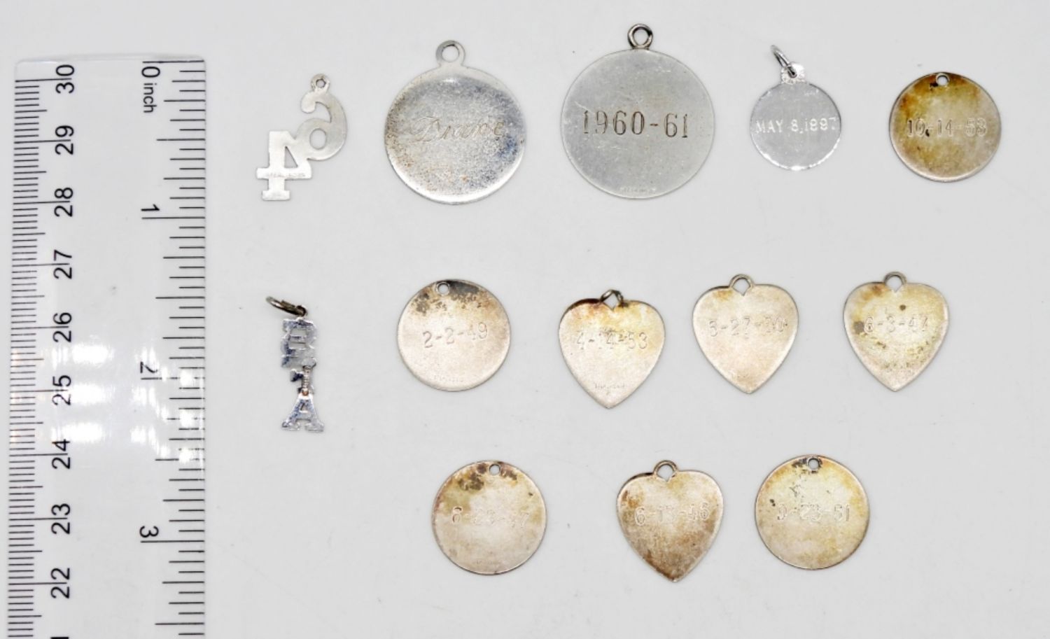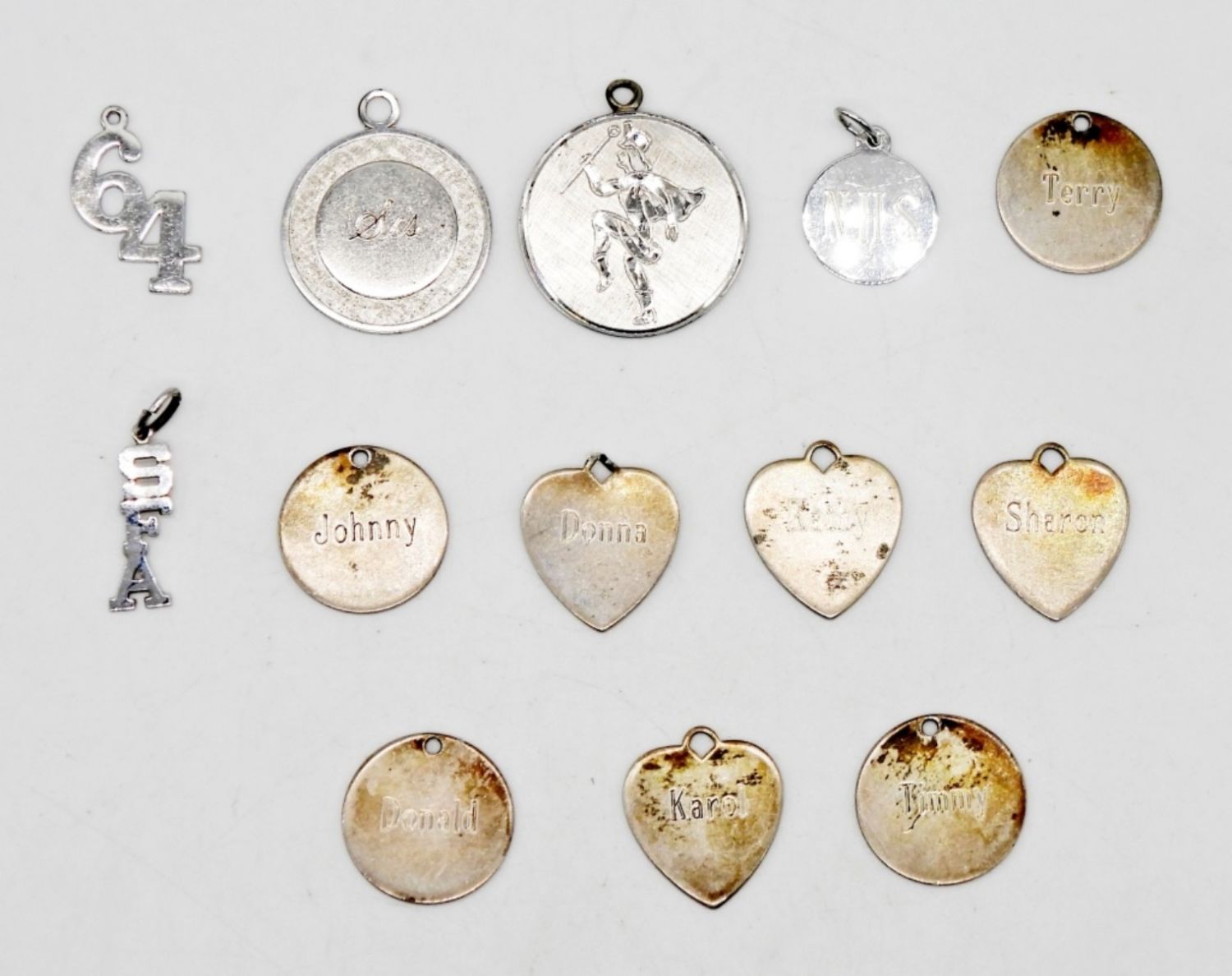ANTIQUE STERLING SILVER CHARMS & PENDANTS ENGRAVED WITH NAMES, DATES & MORE; STAMPED STERLING; 17 DWT