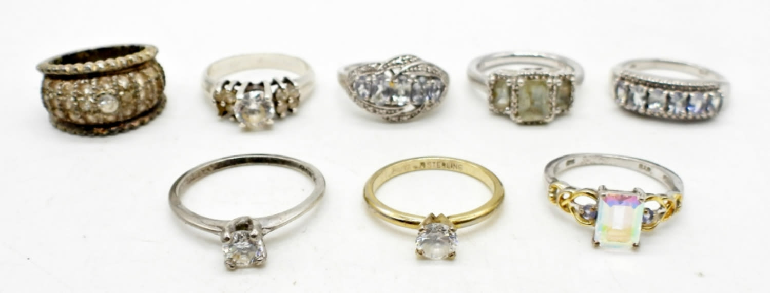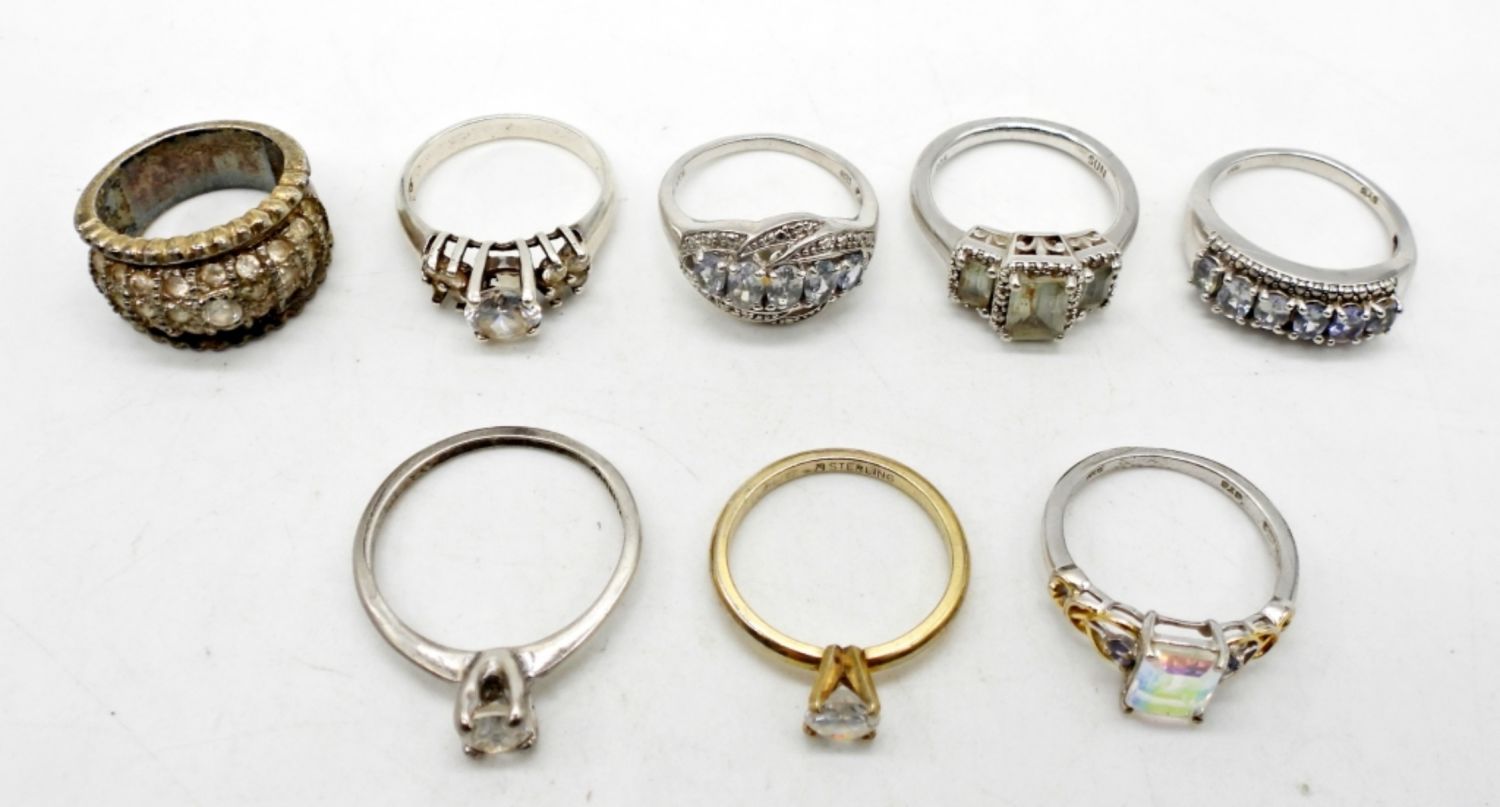 SILVER & GOLD TONE STERLING WITH CLEAR GEMSTONES; STAMPED 925, STERLING; SIZES VARY 5-9; 18 DWT