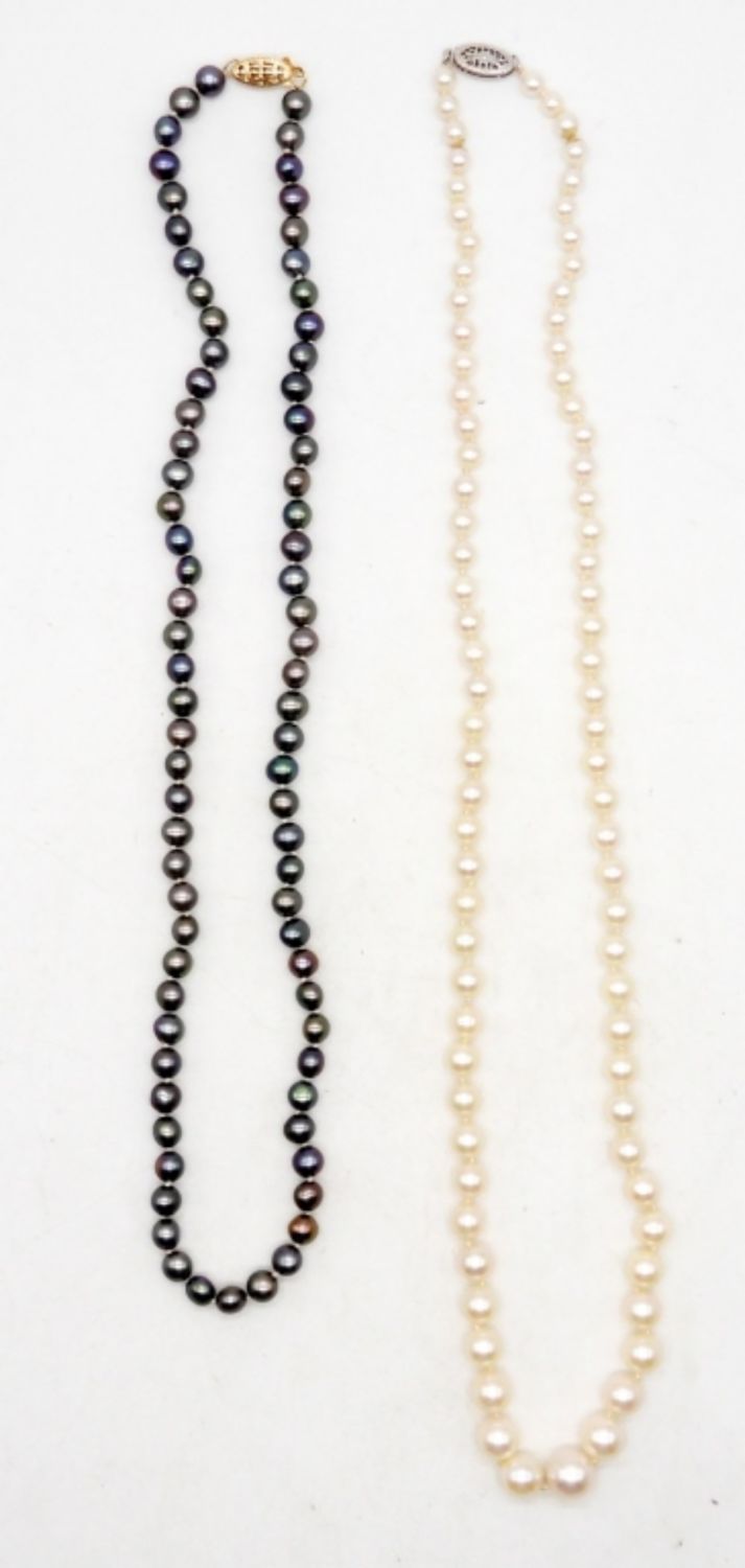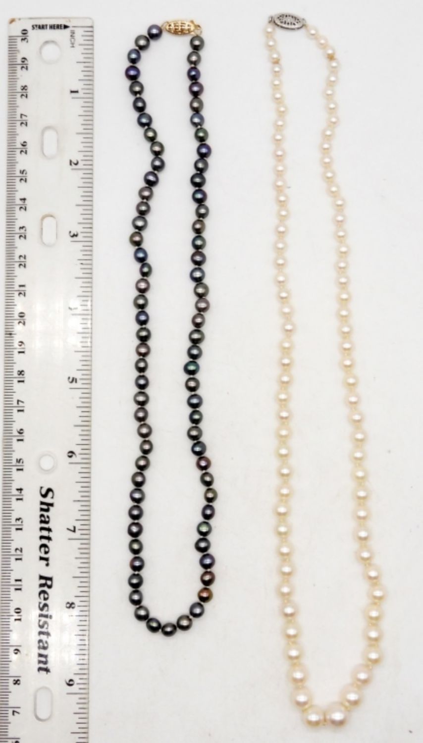 Peacock pearl necklace with 14K yellow gold clasp is 17 inches. Natural colored pearl necklace with 14K white gold clasp is 20 inches. Very pretty! (DWT 21.4)