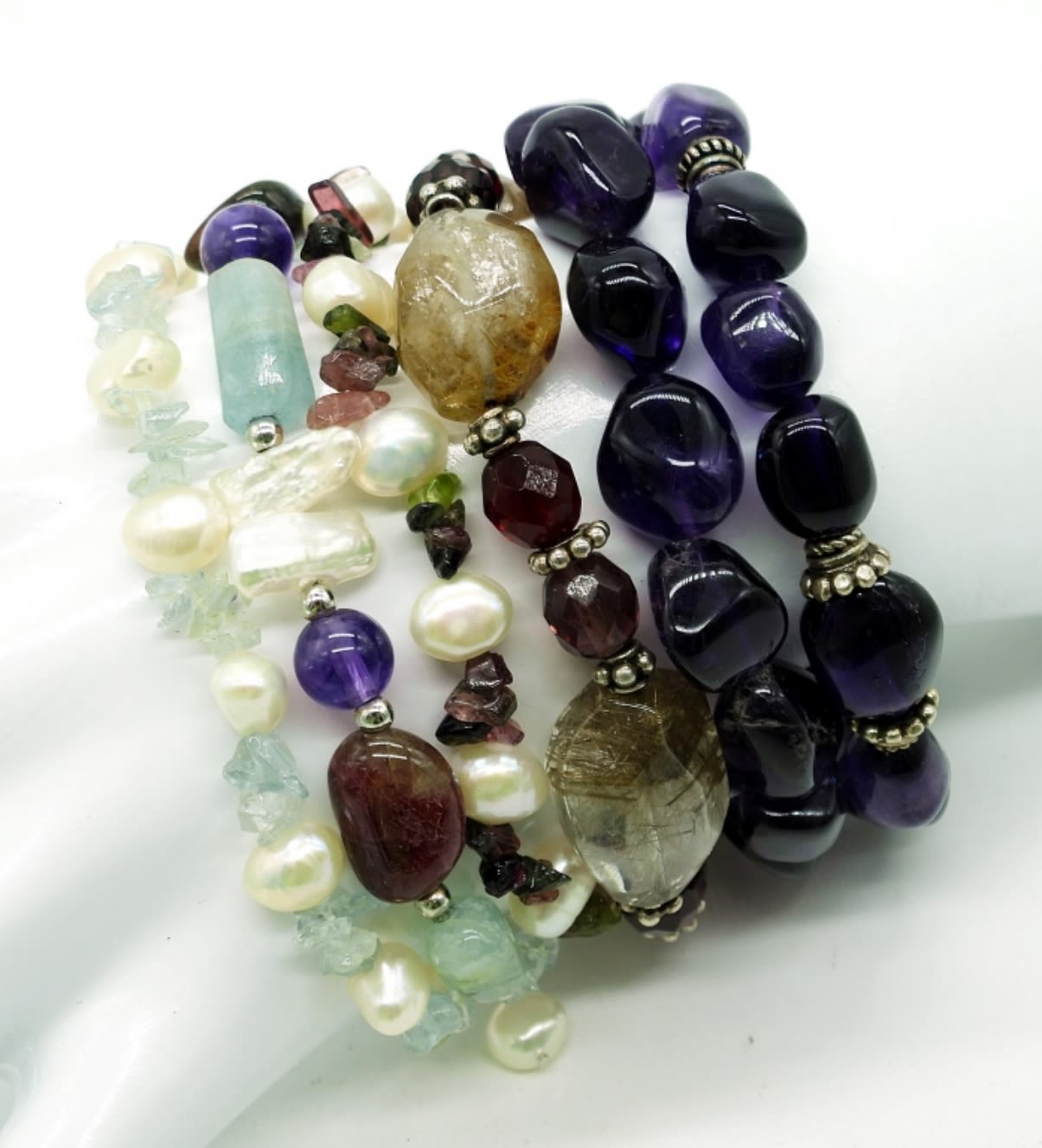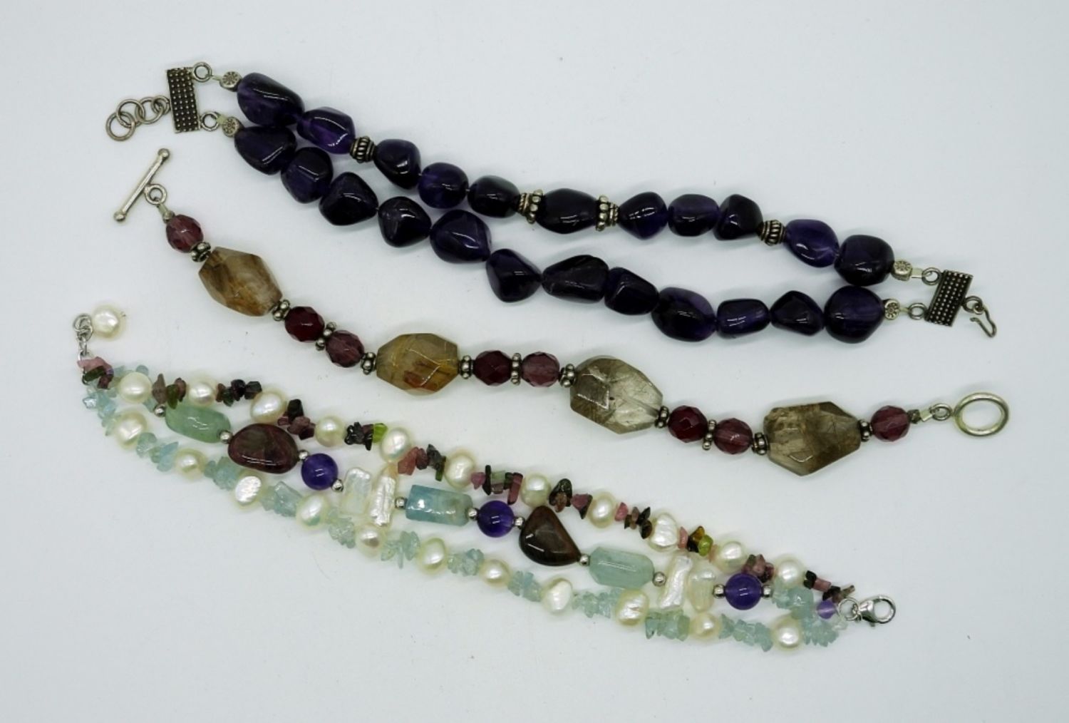 One amethyst nugget, one golden rutilated quartz nugget, and one pearl and mixed gemstone. All 8 inches long. (DWT 66.5)