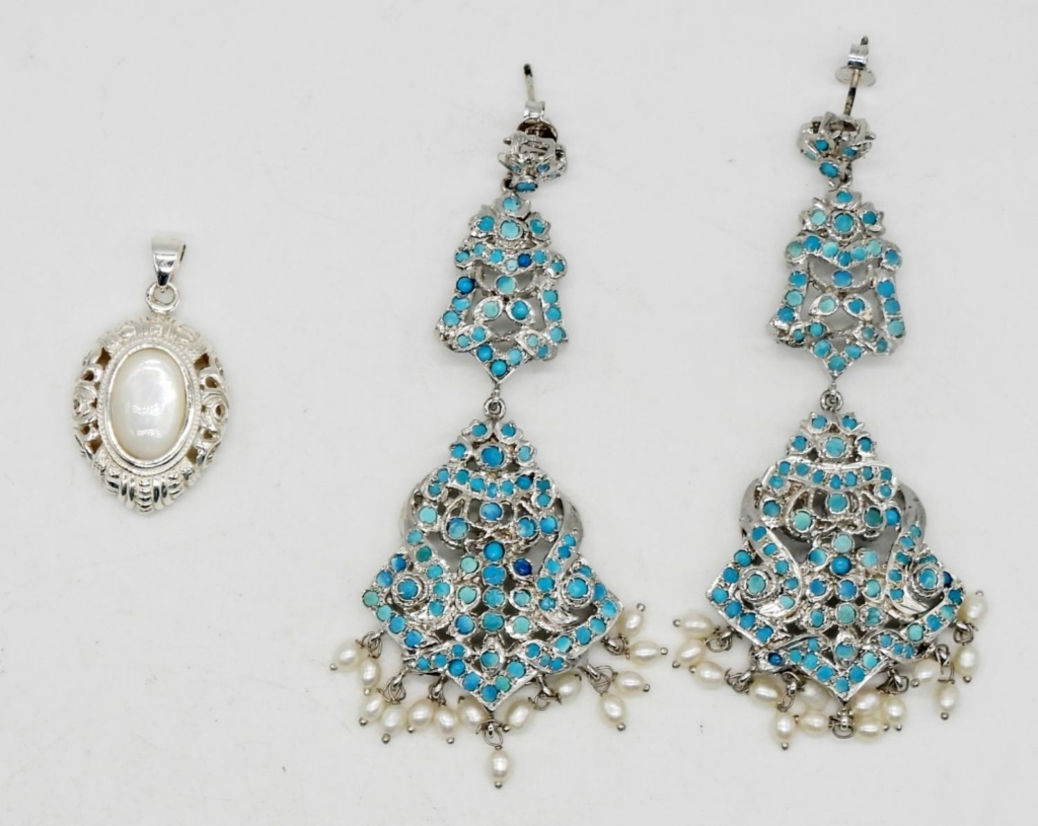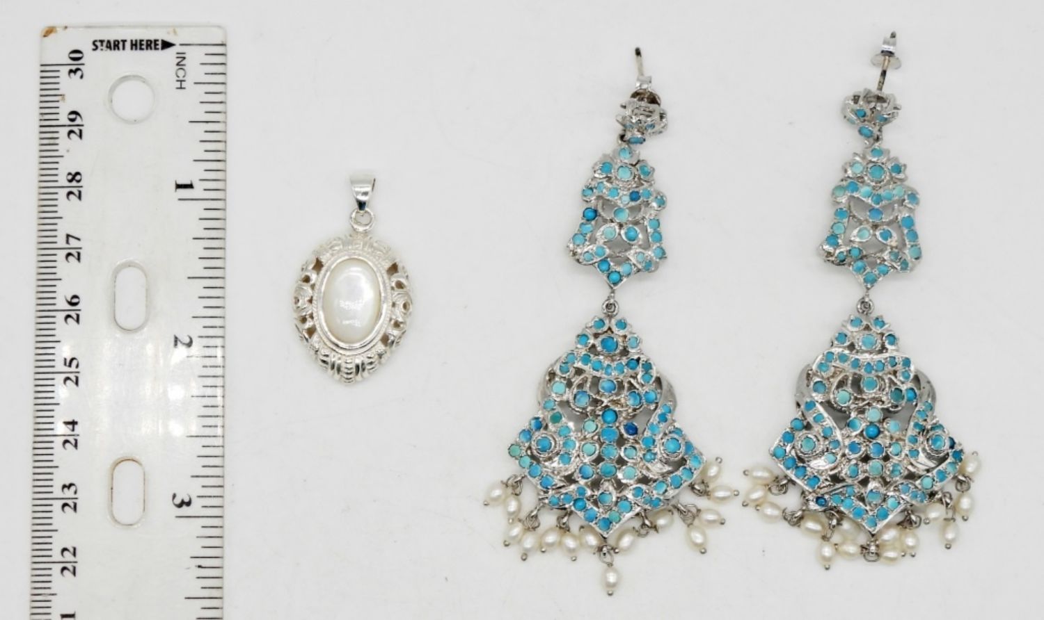Earrings measure 3 inches long. Shell pendant measures 1 inch. Very showy! (DWT 21.9)