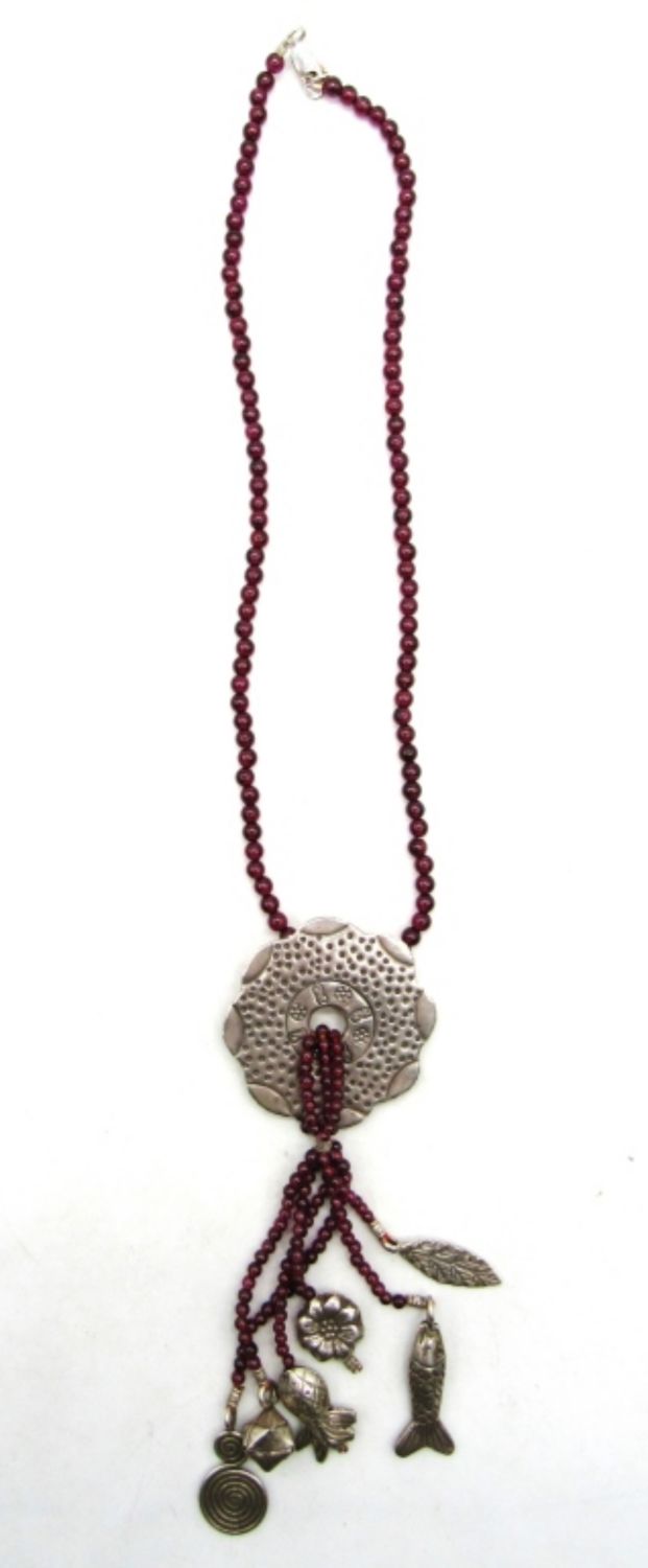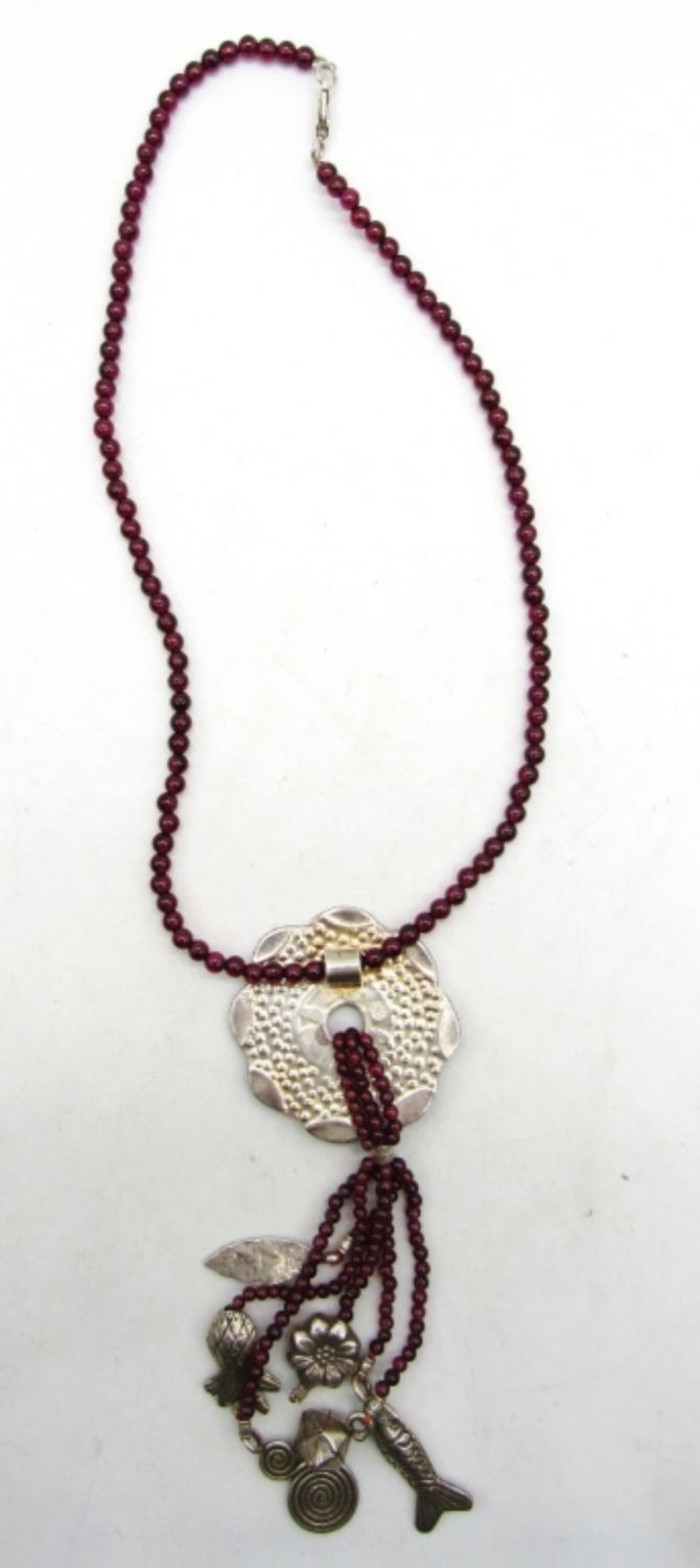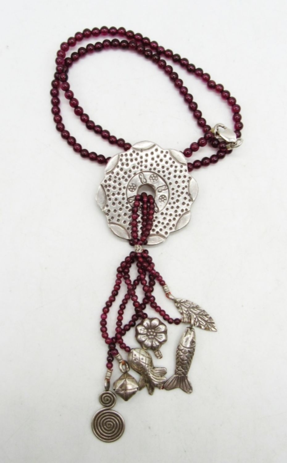 3mm round garnet beaded 15 inch necklace with Sterling pendant and charms. Lovely Boho style! (DWT 25.2