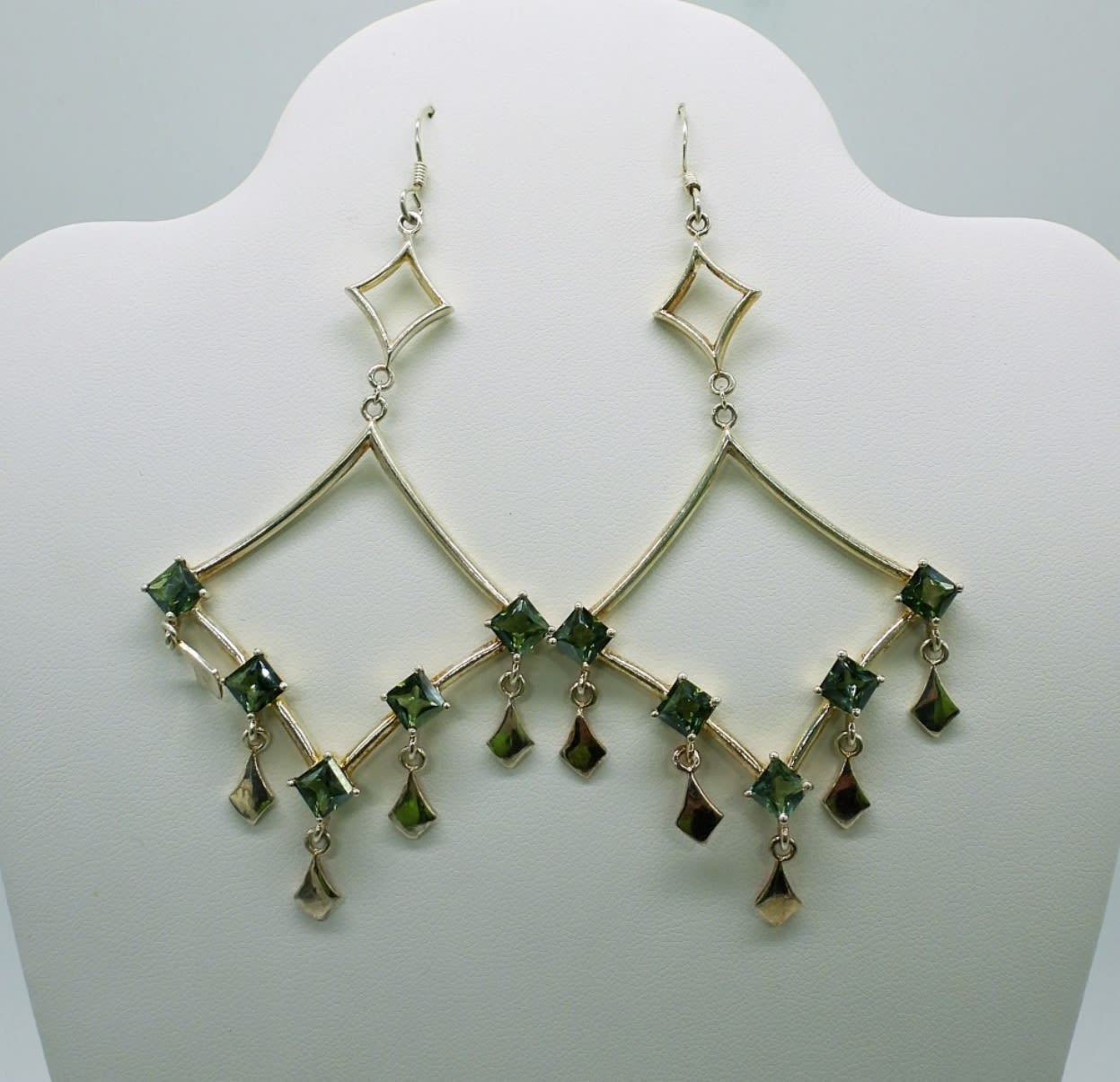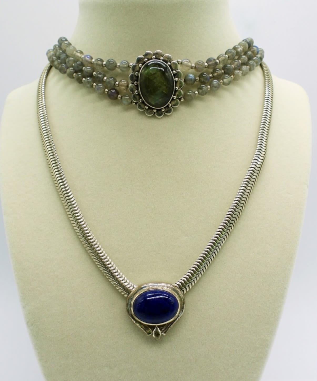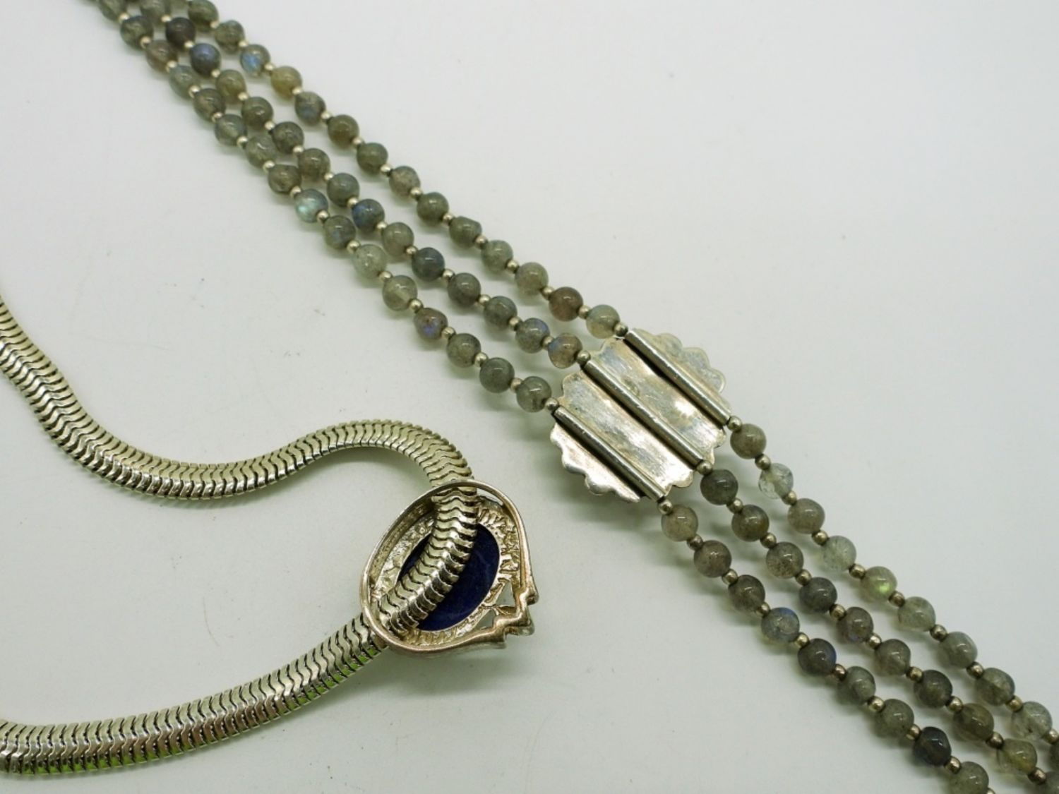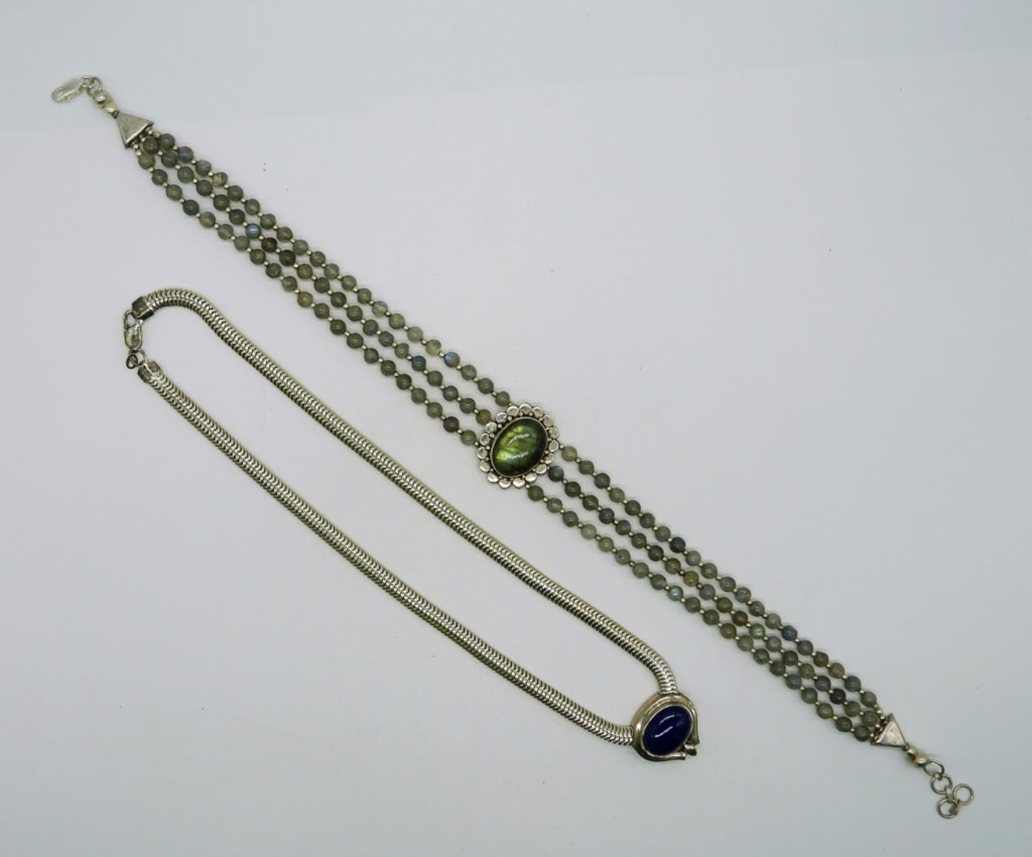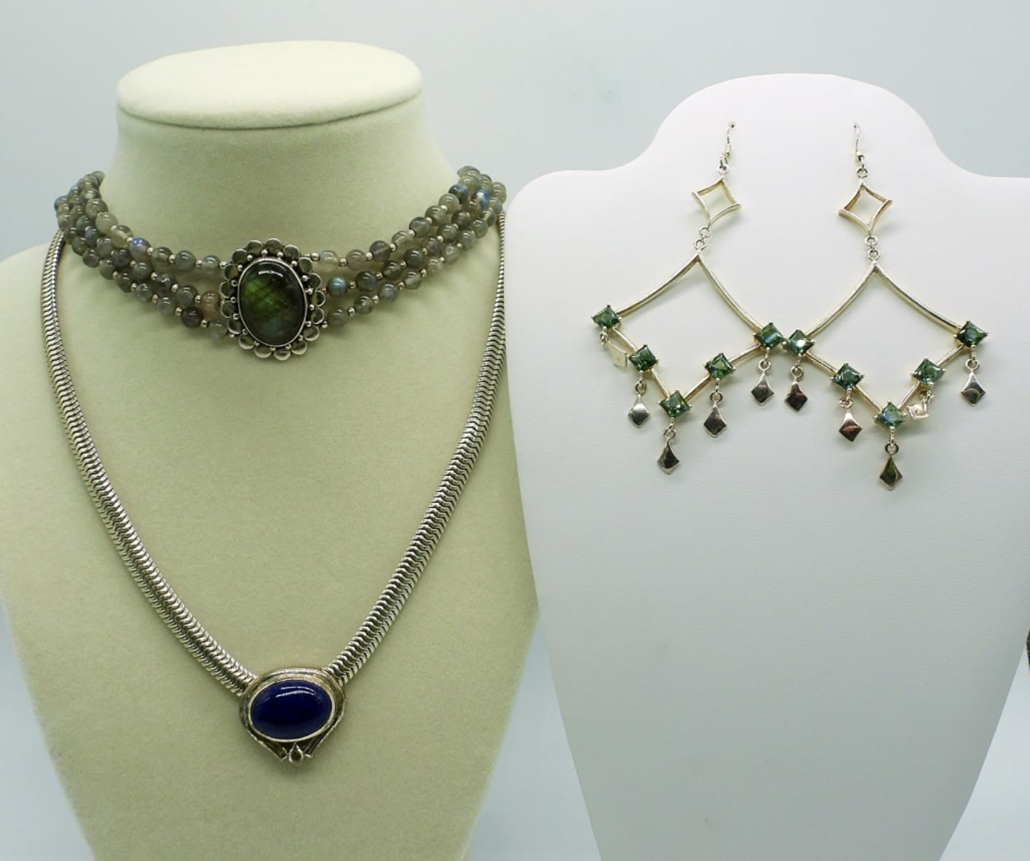 One 17.5 inches large snake chain necklace with lapis lazuli stone slide pendant, one genuine labradorite triple strand beaded choker necklace 14 inches with extender, plus diamond shaped green stone chandelier earrings 3.5 inches. This lot is very beautiful! (DWT 59.3)