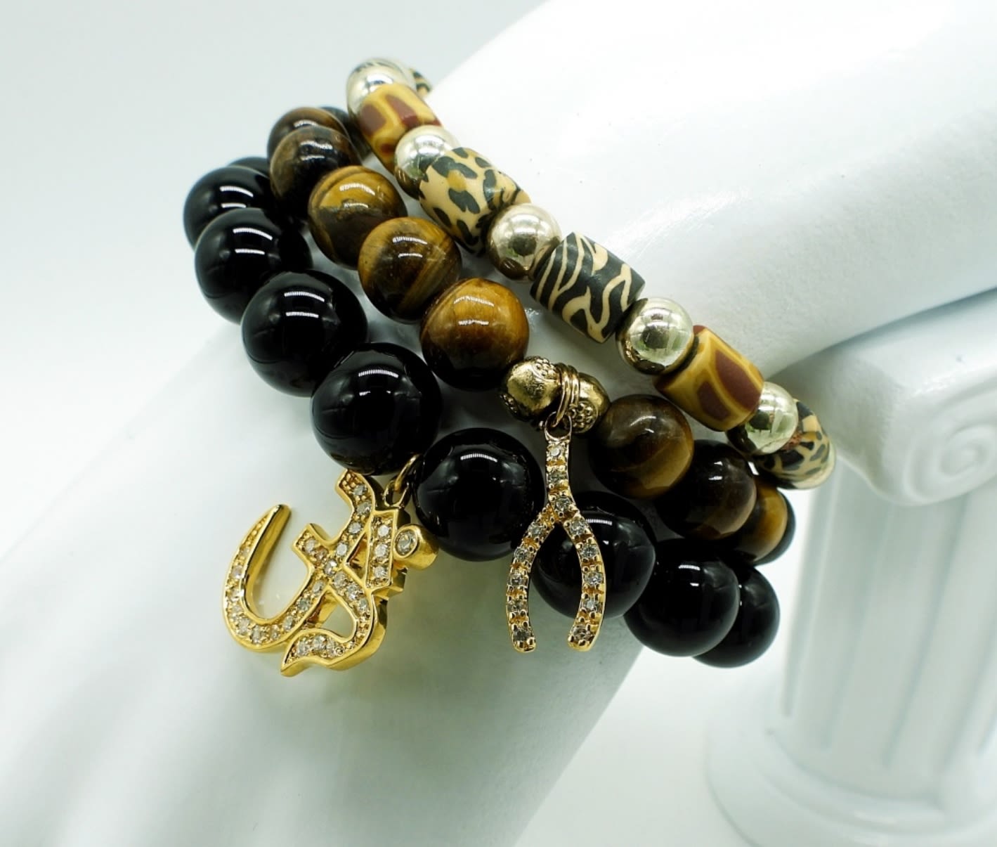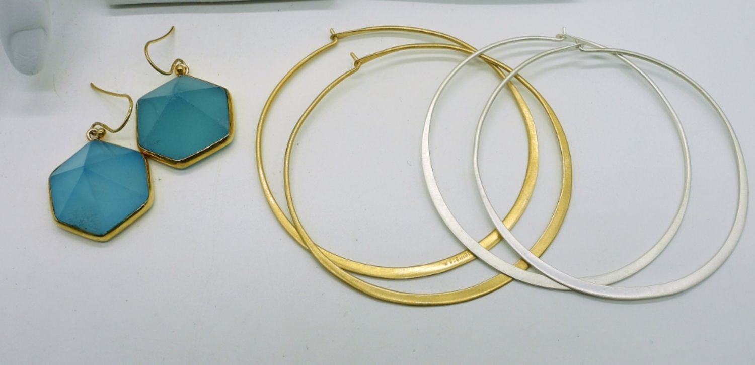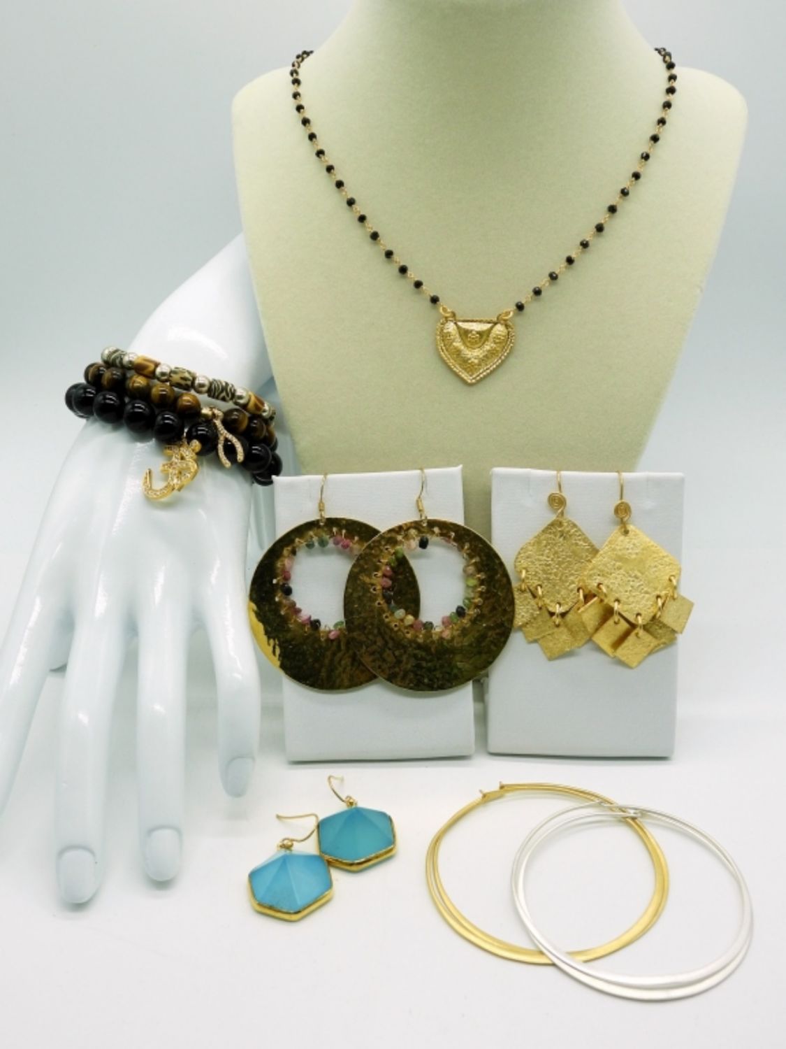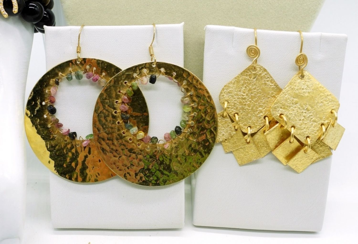 Large hoop earrings, tourmaline earrings, drop earrings, and three stretch bracelets in various natural stone varieties. (DWT 47.6)