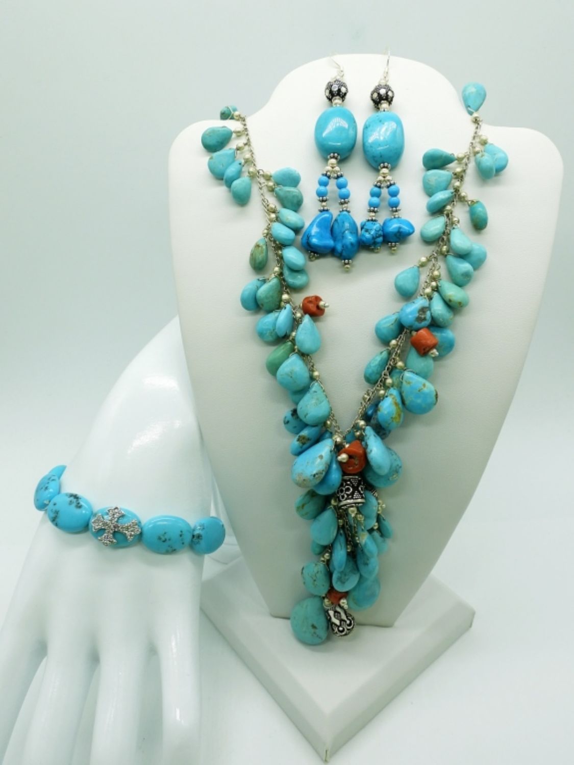 Necklace 18 inches, earrings are 3.25 inches, stretch bracelet is 7 inches. (DWT 98.7) Very cute set!