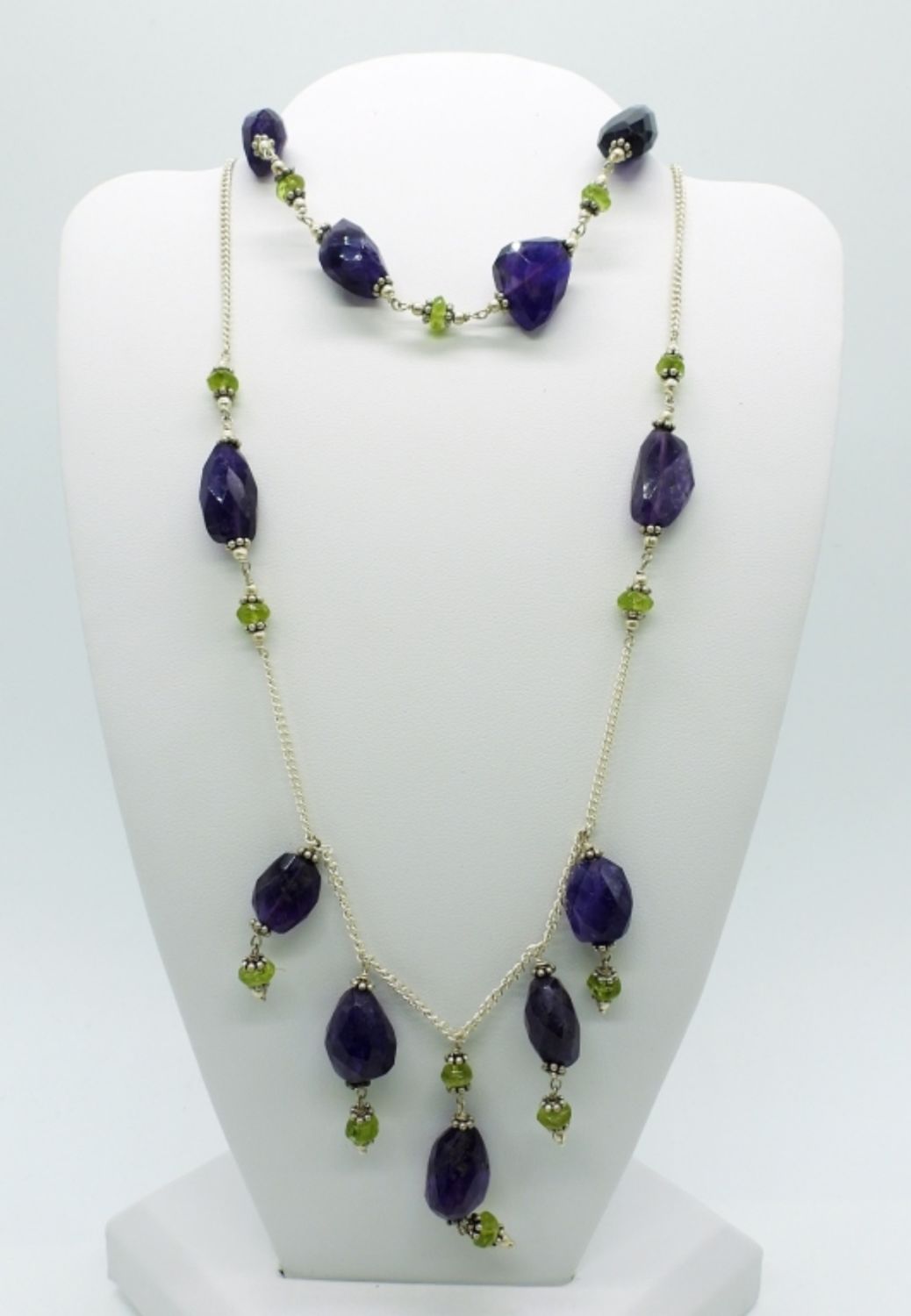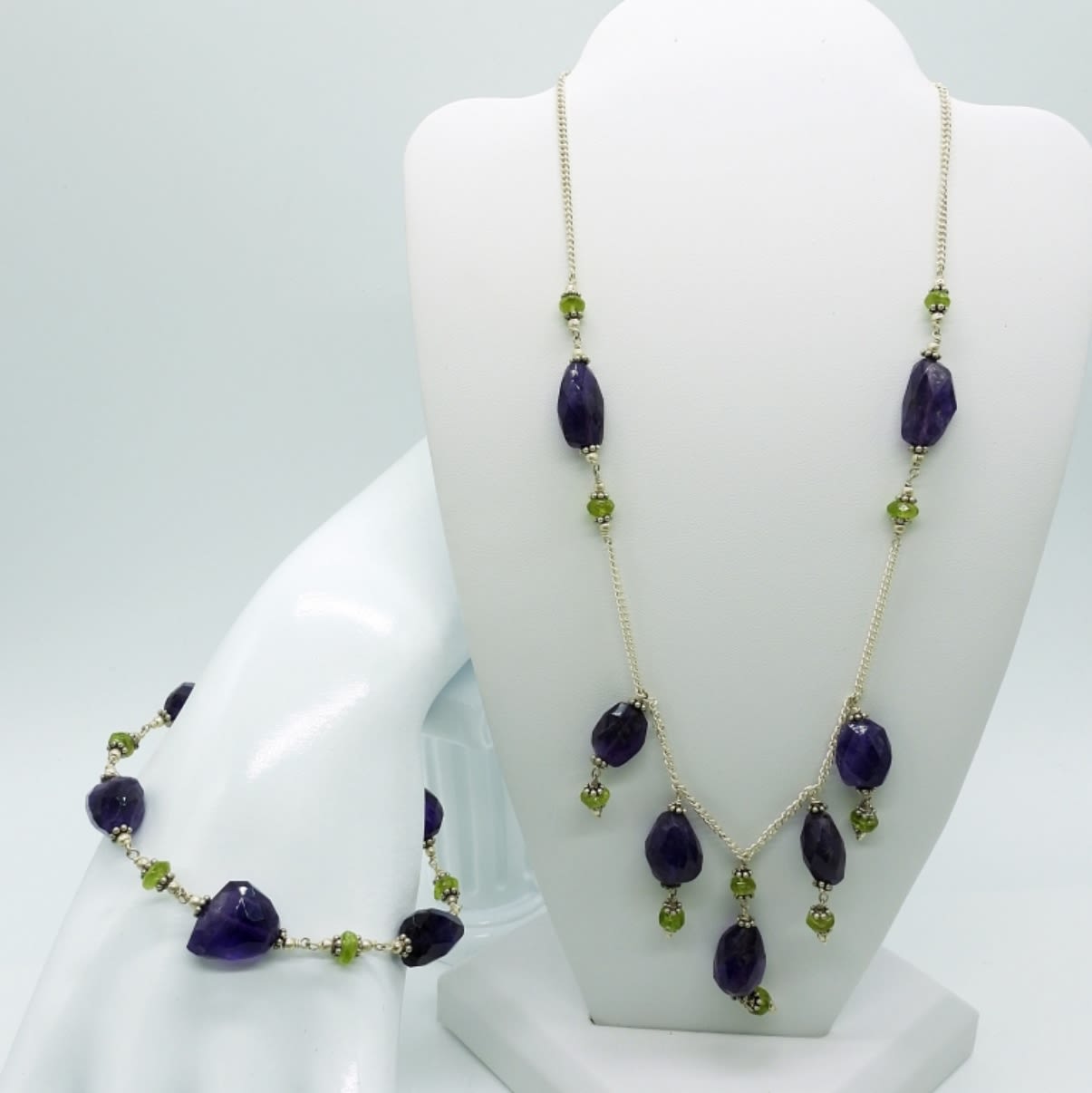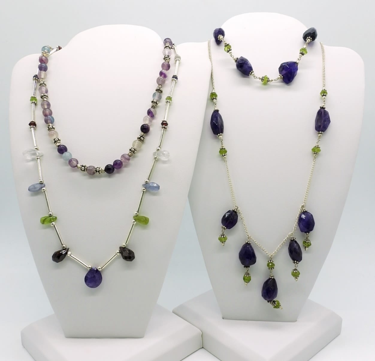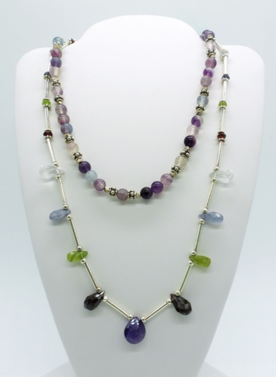 Amethyst & peridot 16 inch necklace and matching 8 inch bracelet, mixed gemstone necklace 16 inches, and rainbow fluorite necklace 15 inches. Very pretty! (DWT 52.9)