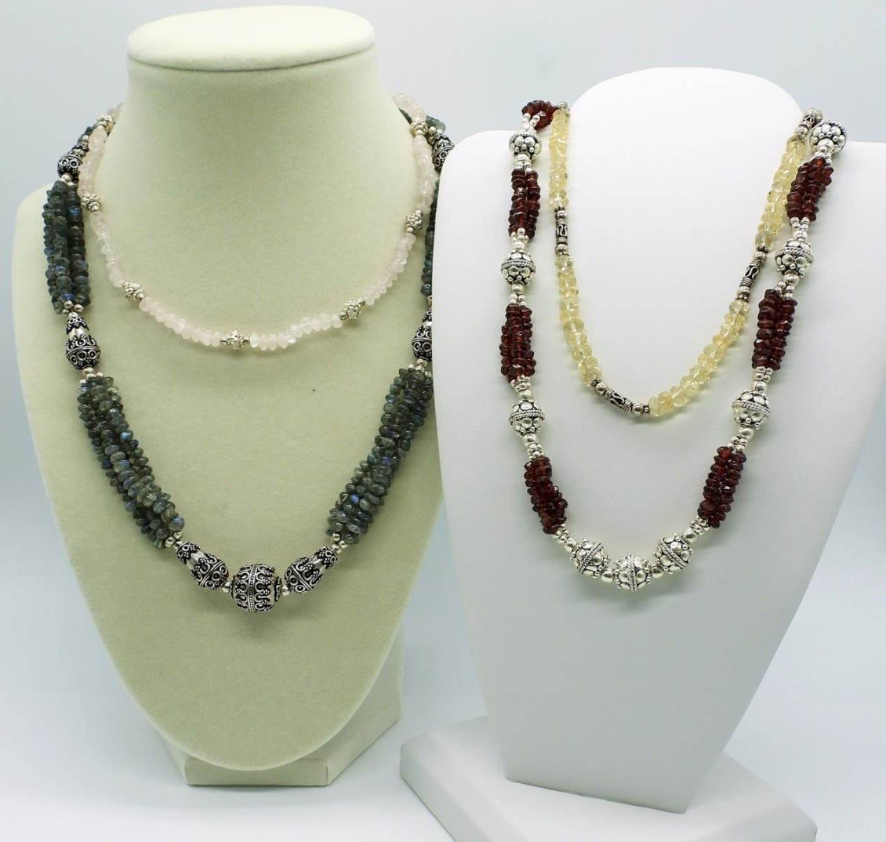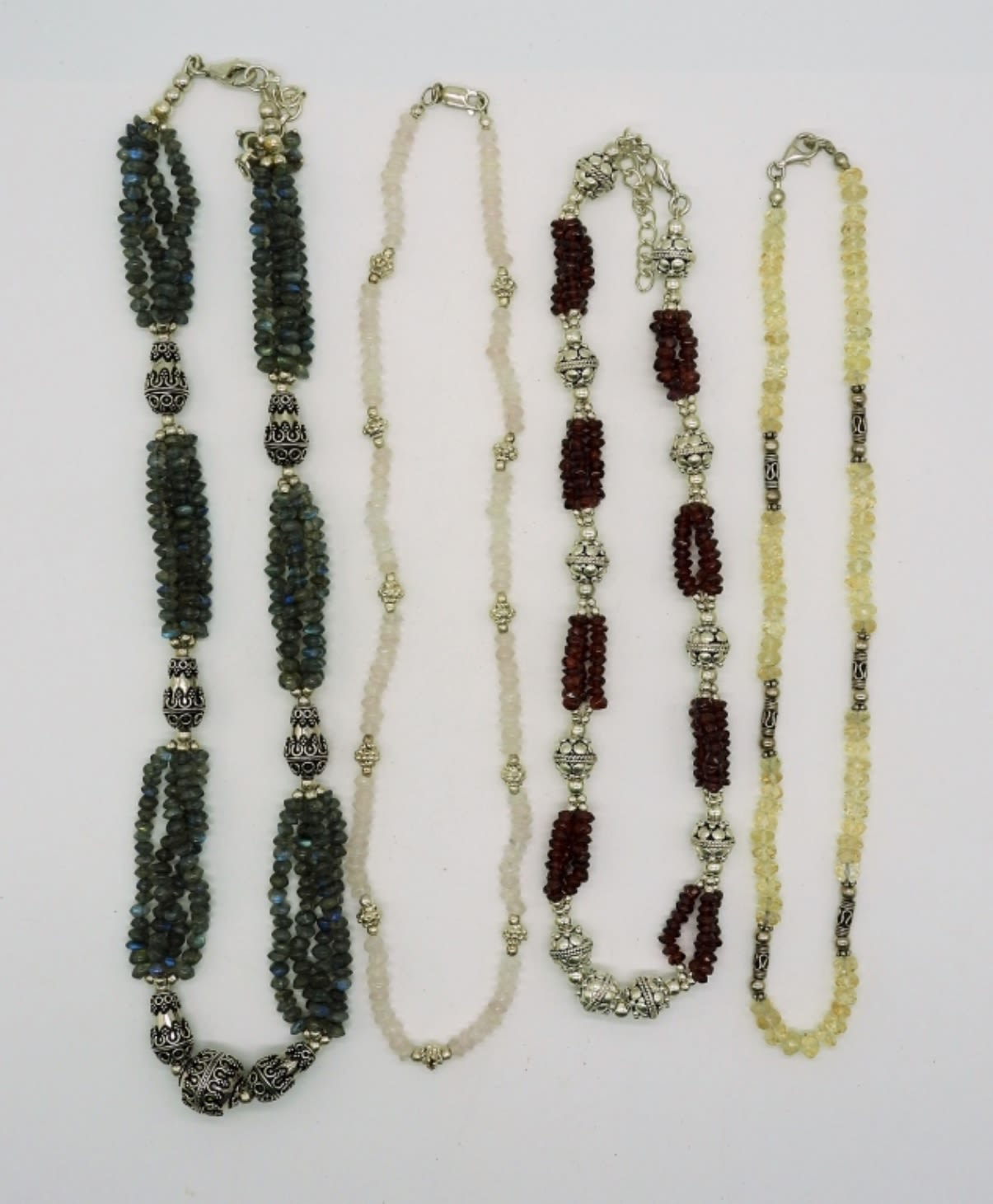 Various lengths 16-18. Flashy labradorite, deep garnet, rose quartz, and citrine. These are gorgeous Boho style pieces! (
