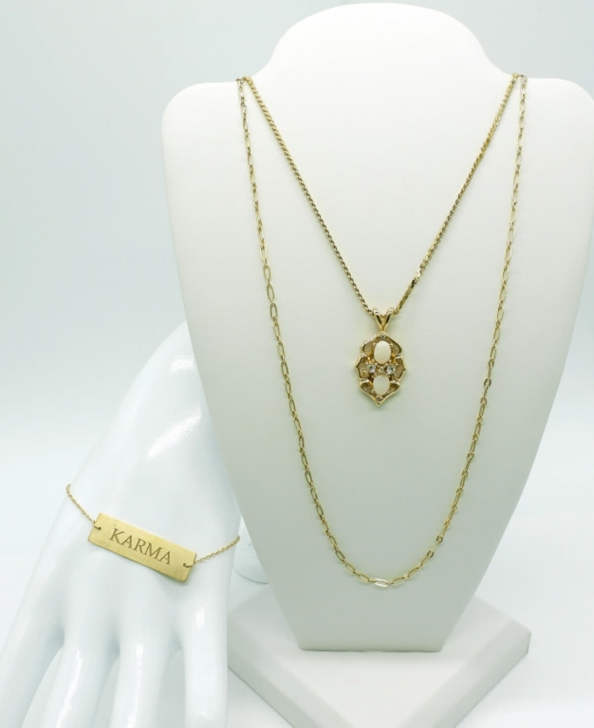 30 inch plain chain necklace, 17 inch opal pendant necklace, and 7 inch ‘KARMA’ bracelet. (DWT 9.3)