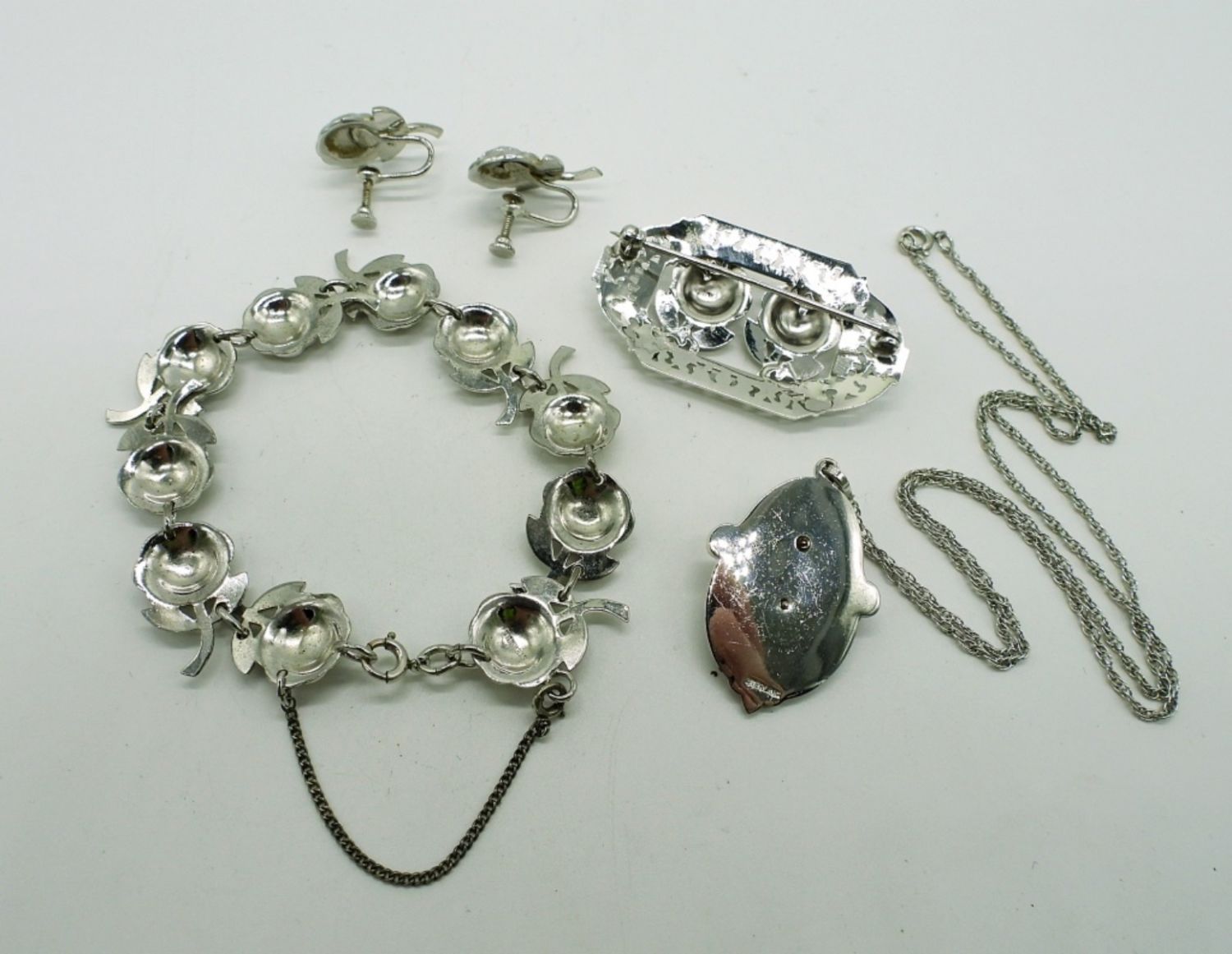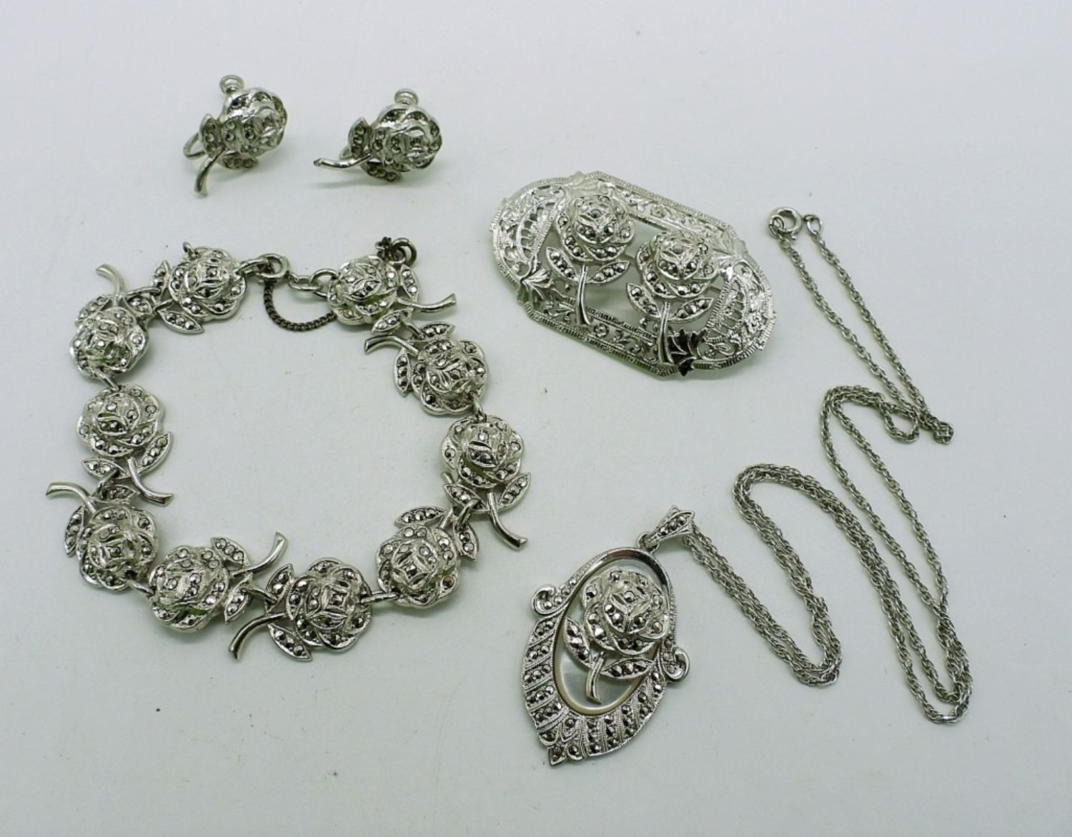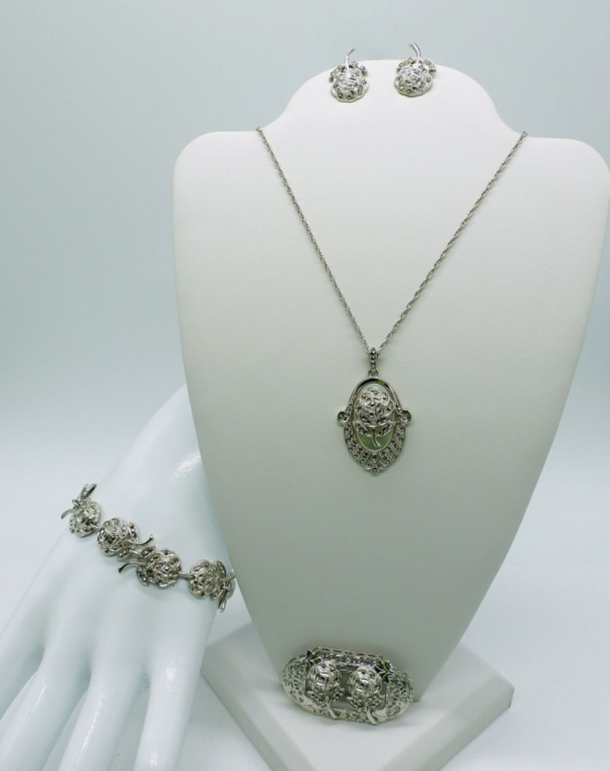 18 inch necklace, 7 inch bracelet, screw back earrings, and 2 inch broach pin. Beautiful rose motif on this stunning matching set! (DWT 29.8)