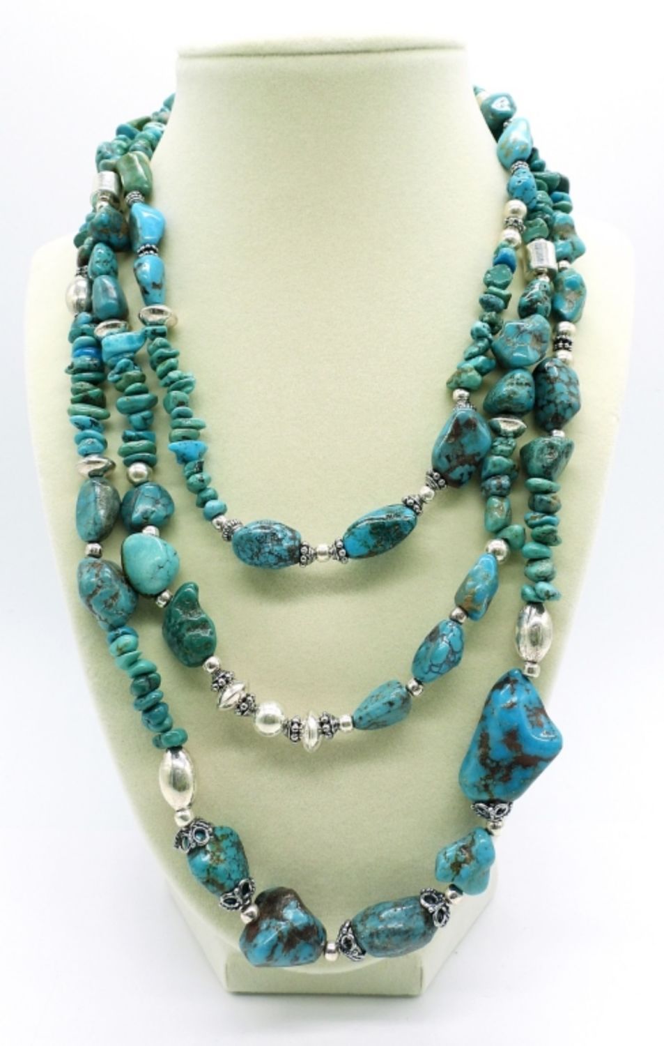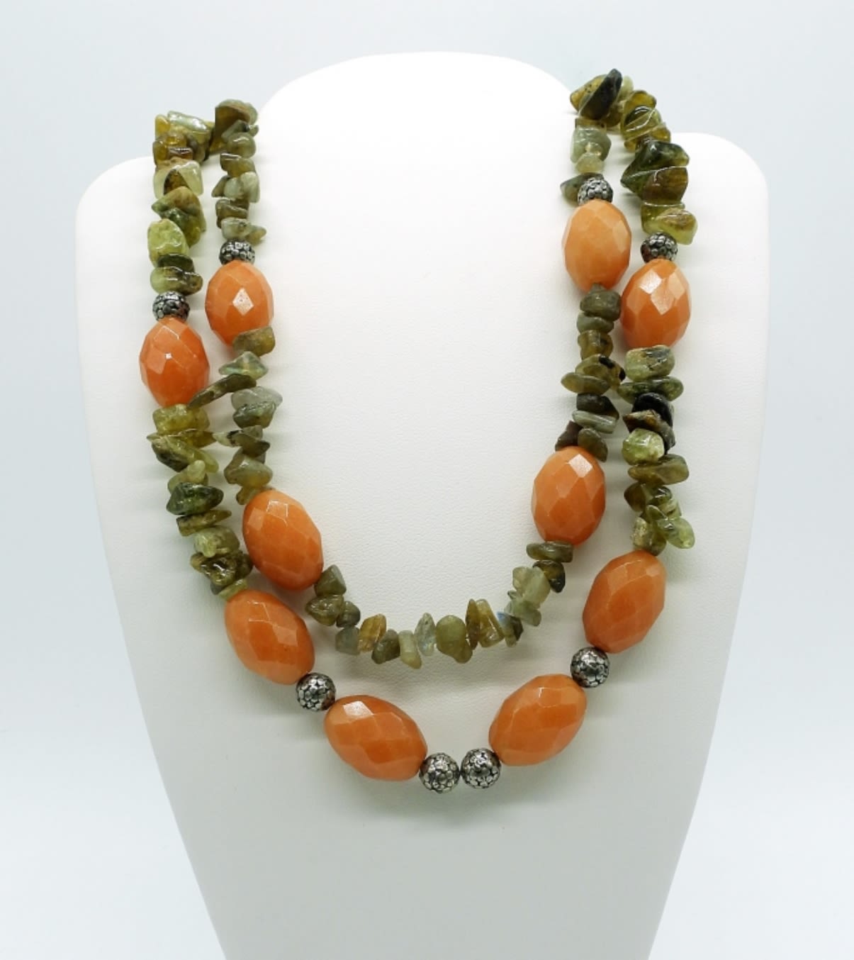 14 inch double strand labradorite & orange aventurine necklace, 17 inch triple strand graduated turquoise colored stone necklace. Lovely set! (DWT 150.2)
