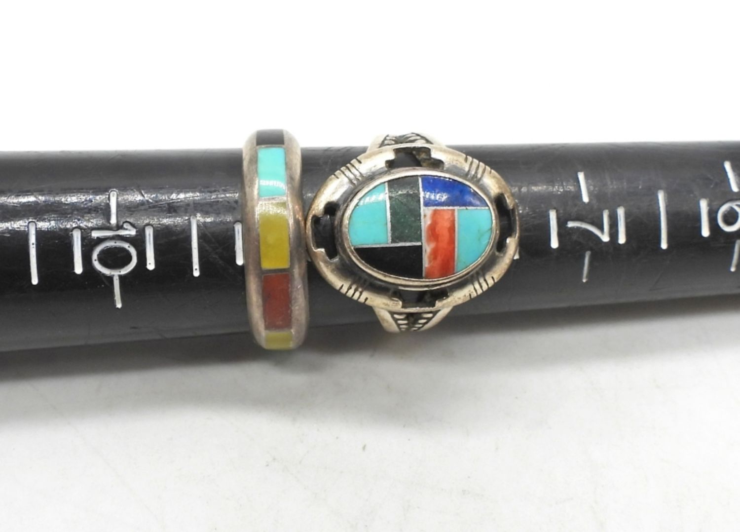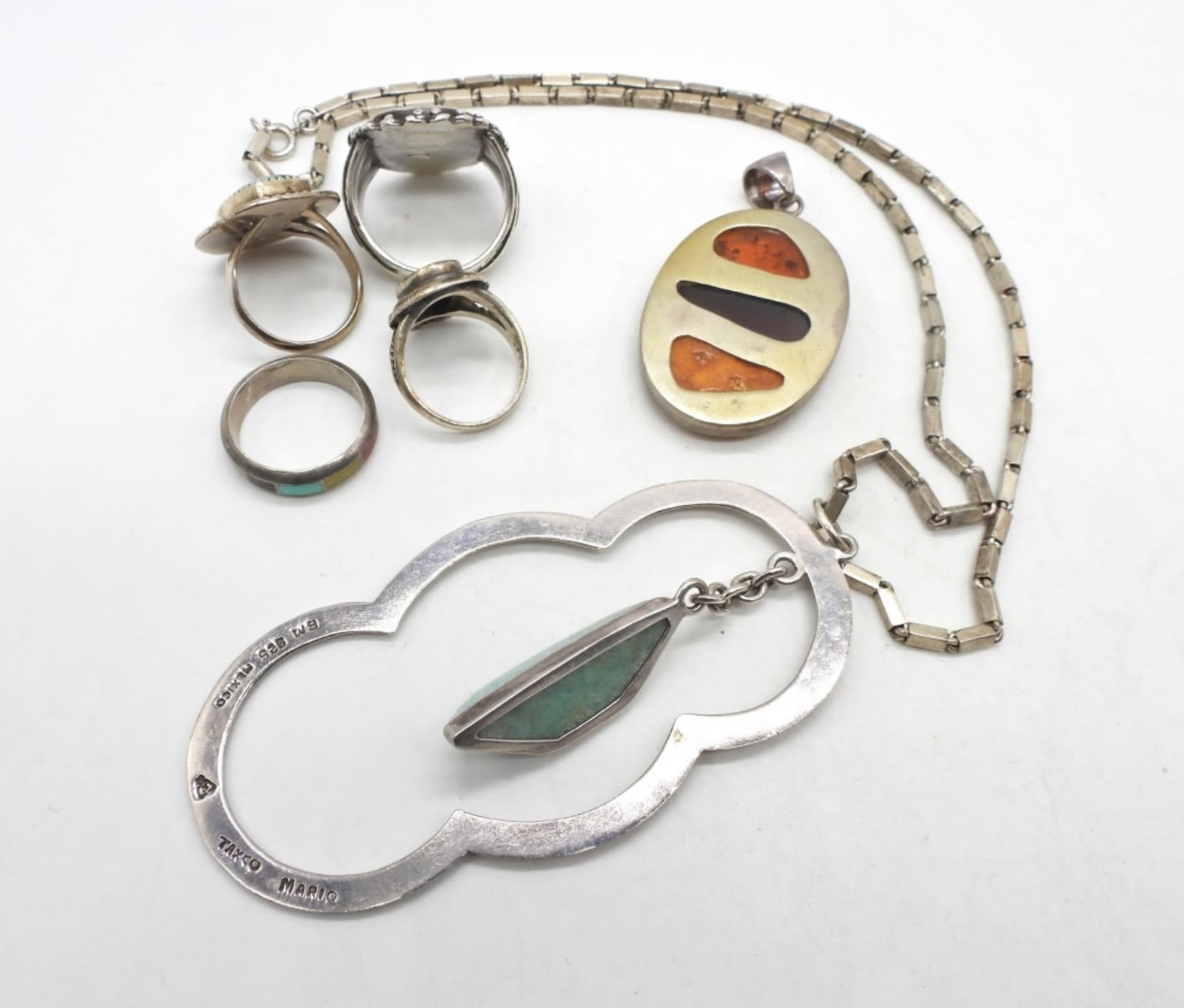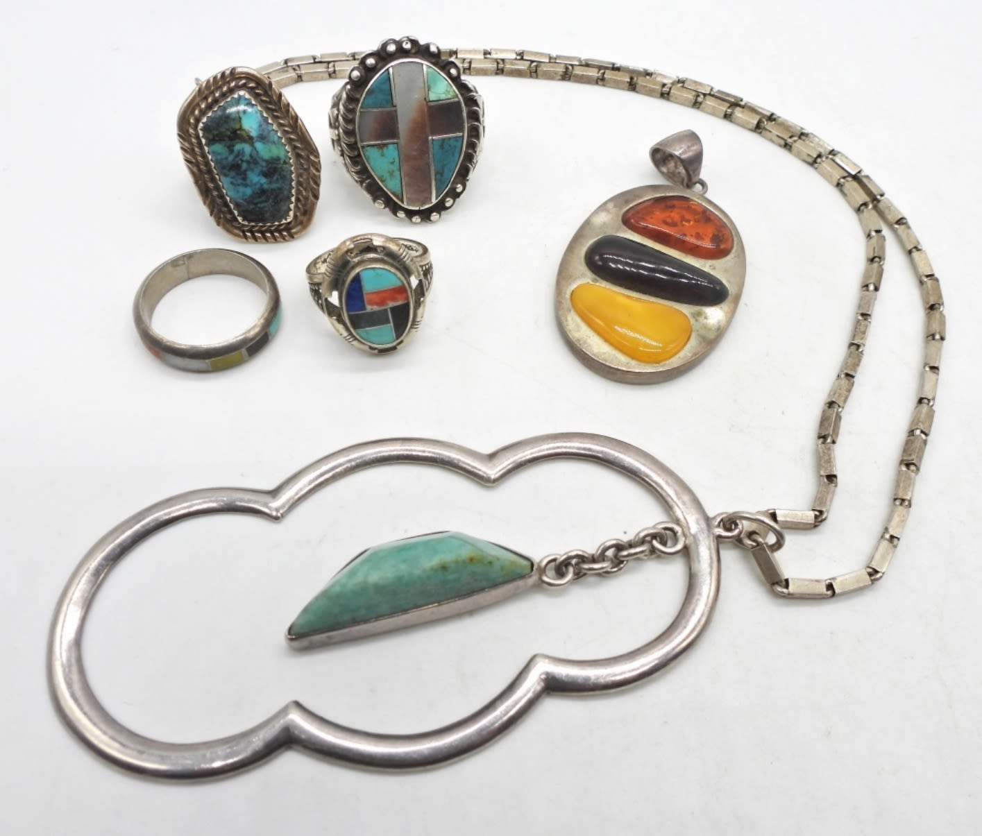Amazonite pendant necklace chain length 19 inches, pendant measures 3.5 inches. Amber pendant measures 1.75 inches. Rings vary in size from 8-10. Nice vintage lot! (DWT 56.7)