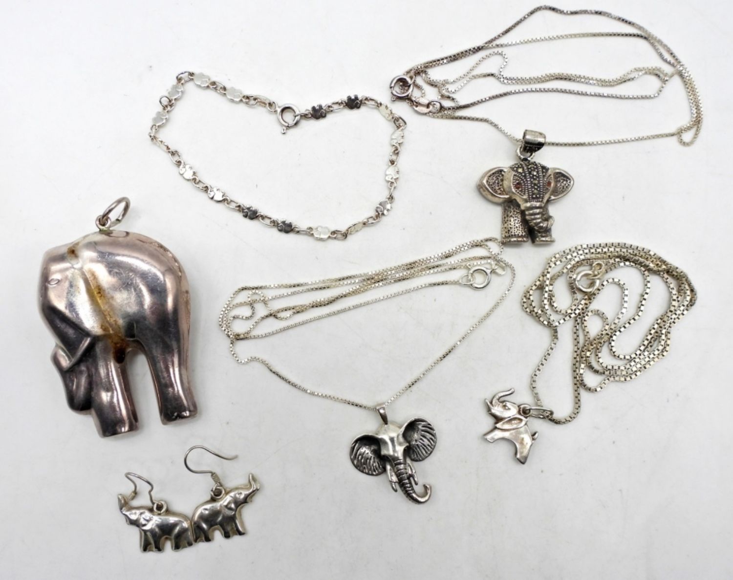Three necklaces 18-24 inches with elephant pendants, one large pendant without chain, one pair of earrings, and one 7 inch bracelet. Adorable set! (DWT 26)