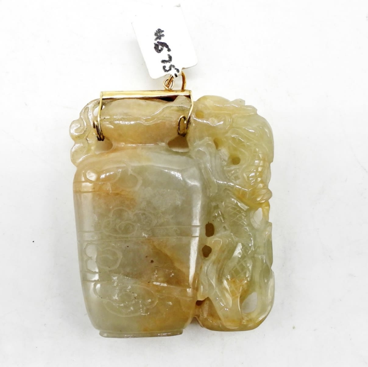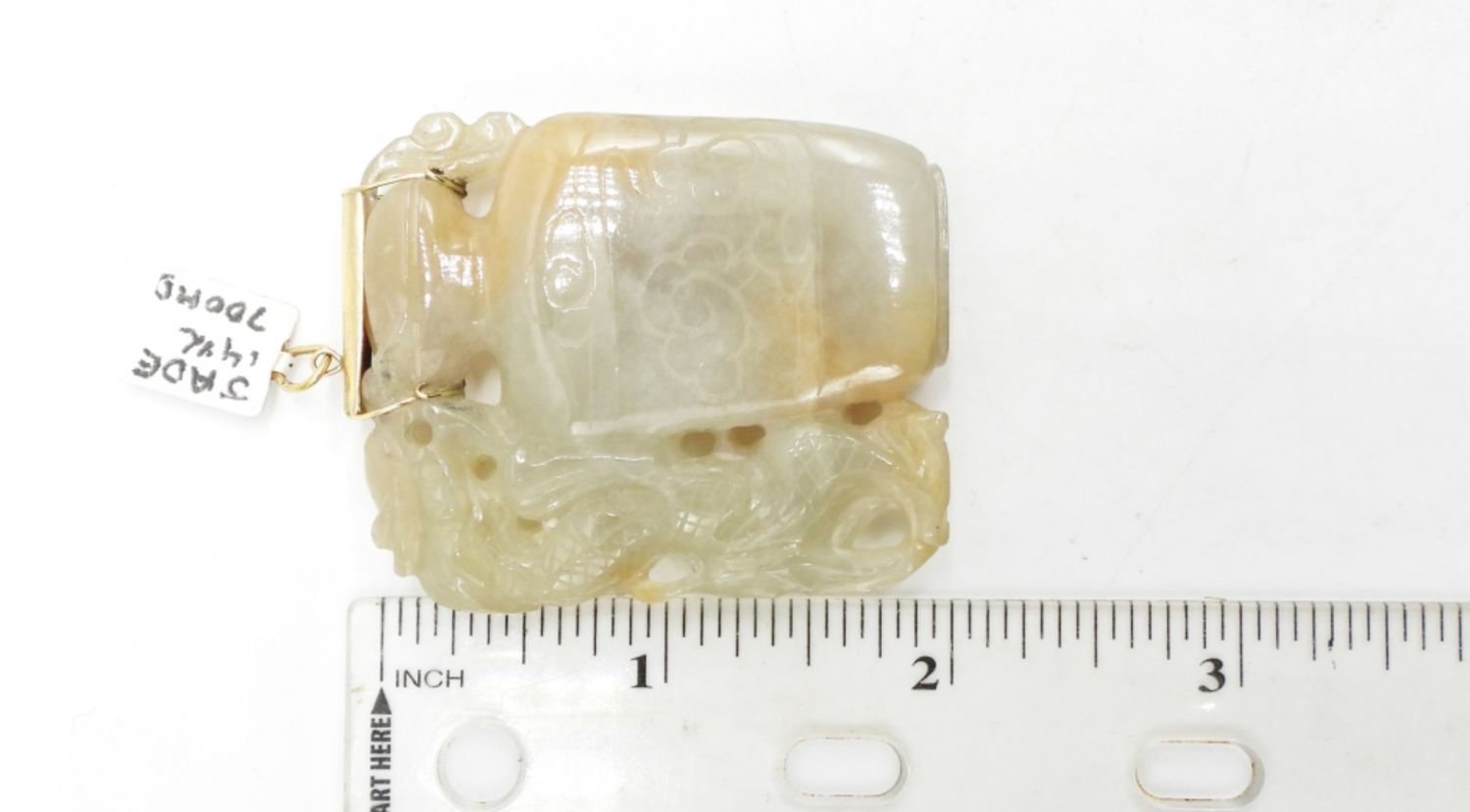 Carved jade pendant measures 2 inches high by 1.5 inches wide with 14K gold handmade bail. (DWT 32.2)