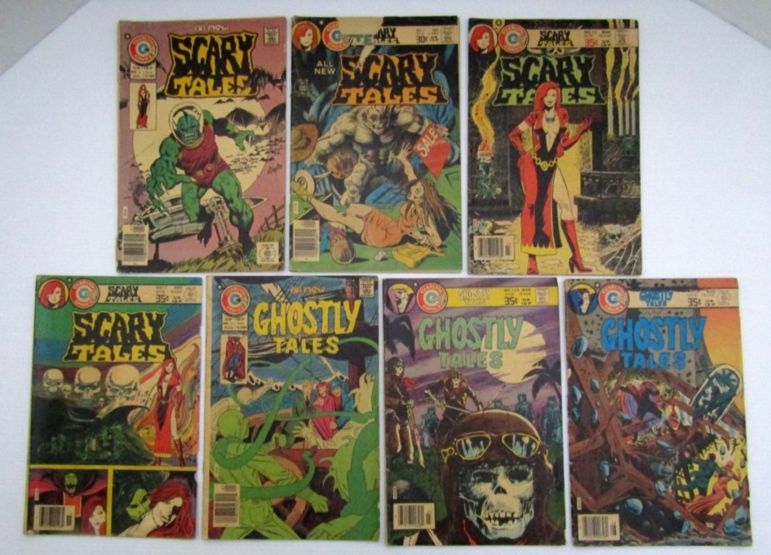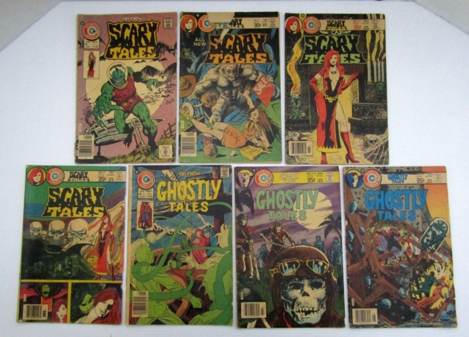 Ghostly Tales #122, 128, 131; Scary Tales #6, 7, 12, 17; 1976 – 1978 Bronze Age Comics – Fair Conditions.