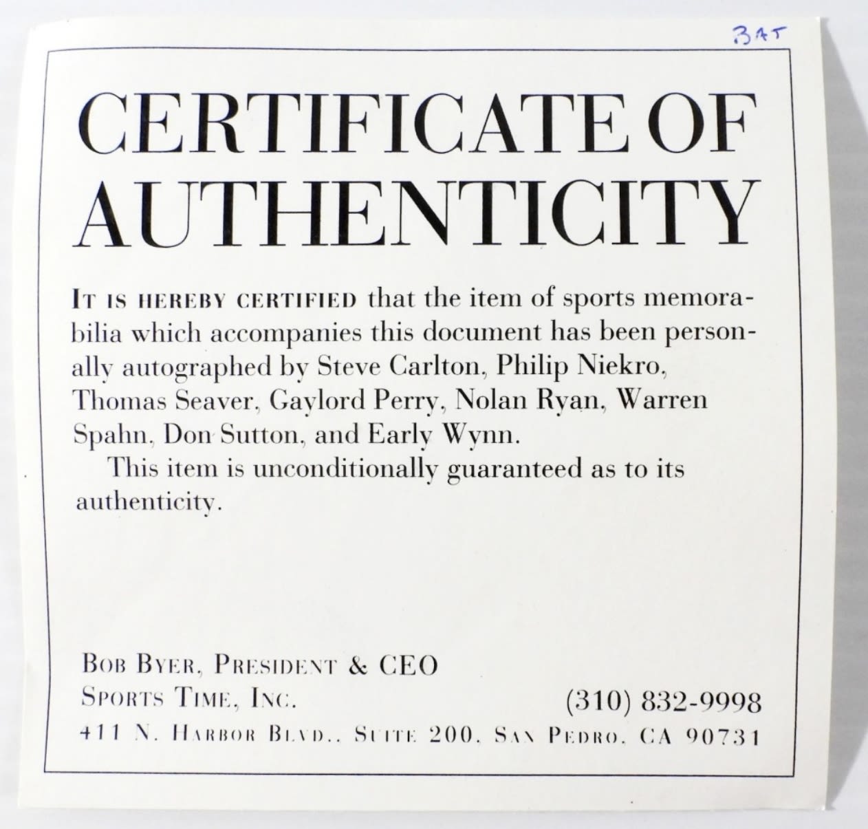 8 SIGNATURES INCLUDING NOLAN RYAN, STEVE CARLTON, PHILIP NIEKRO, THOMAS SEAVER, GAYLORD PERRY, WARREN SPAHN, DON SUTTON, & EARLY WYNN; LIMITED EDITION 199 OF 300; INCLUDES COA BY SPORTS TIME INC.