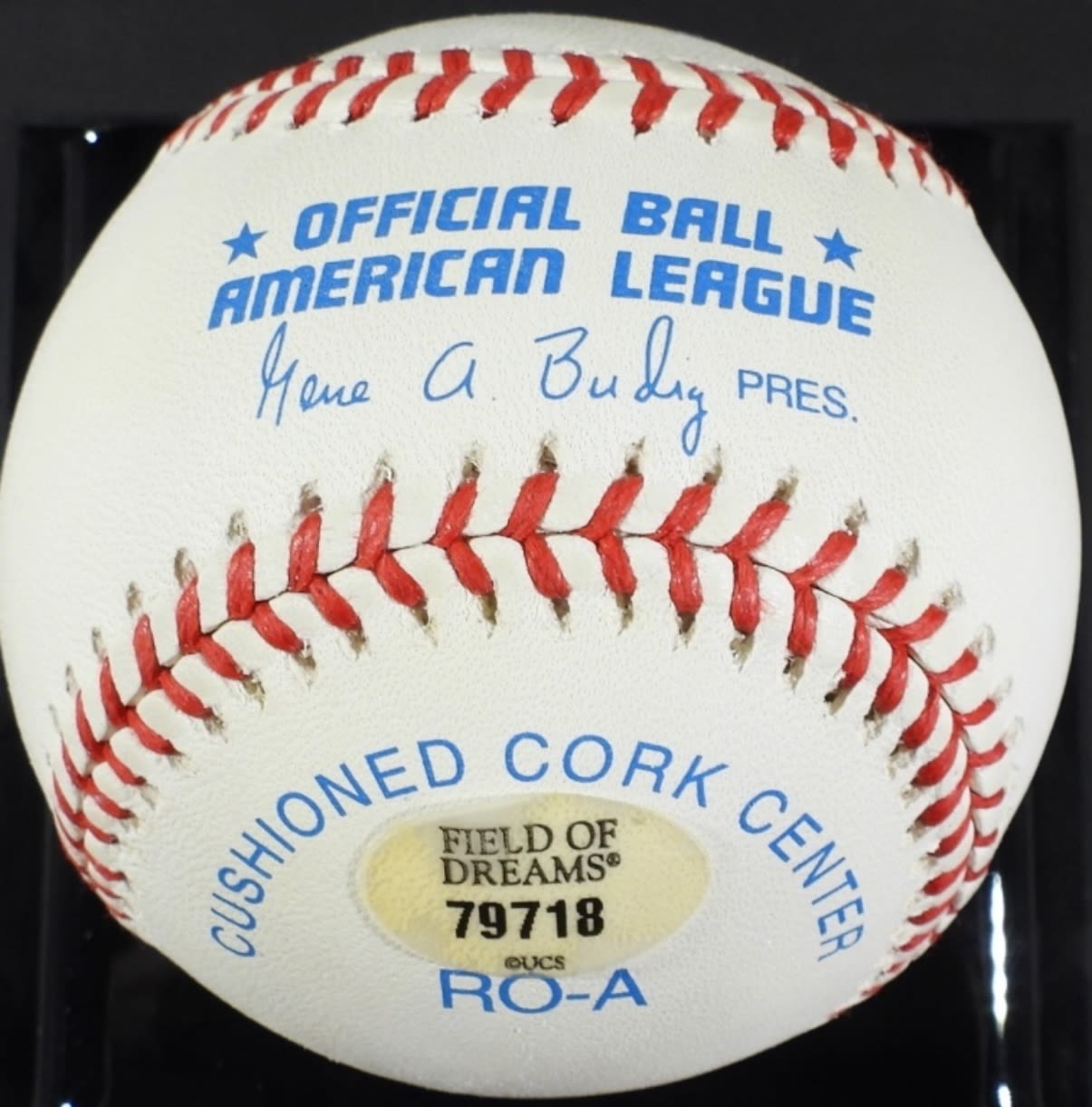 COA BY FIELD OF DREAMS, AMERICAN LEAGUE OFFICIAL BALL, IN PLASTIC CUBE BALL HOLDER
