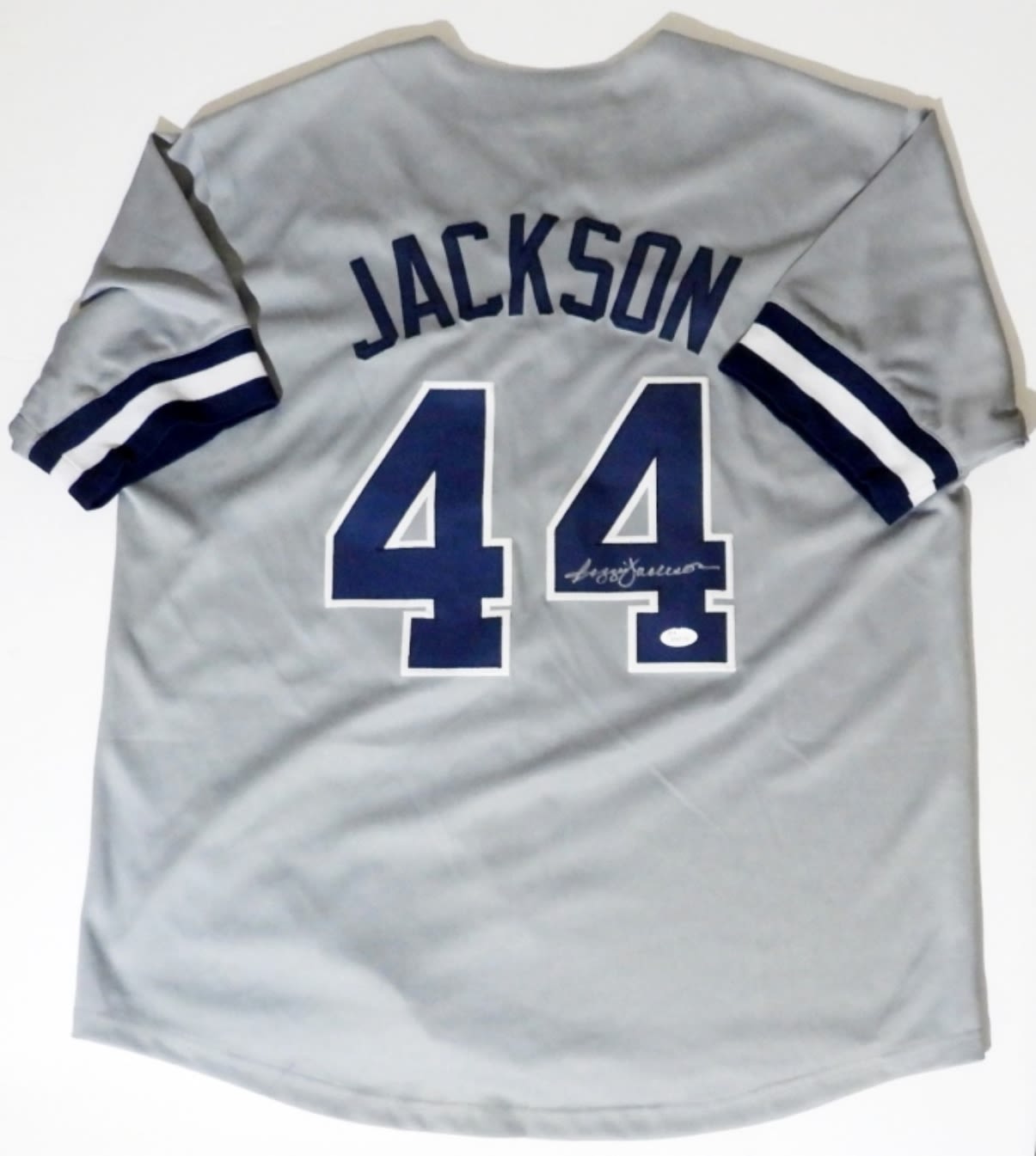 REGGIE JACKSON SIGNED GRAY GAME USED CUSTOM BASEBALL JERSEY; COA BY JSA (NO PAPER COA INCLUDED)