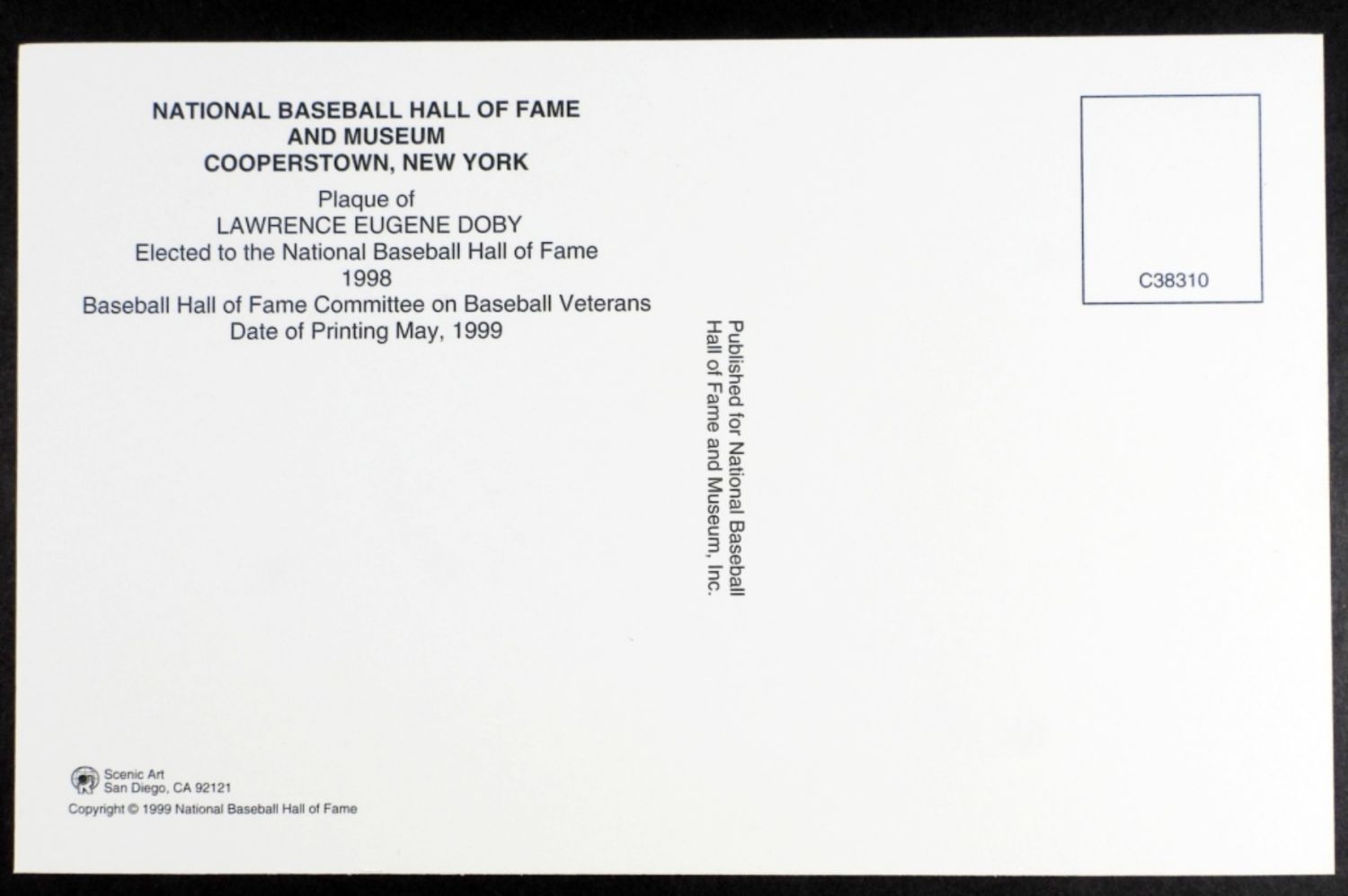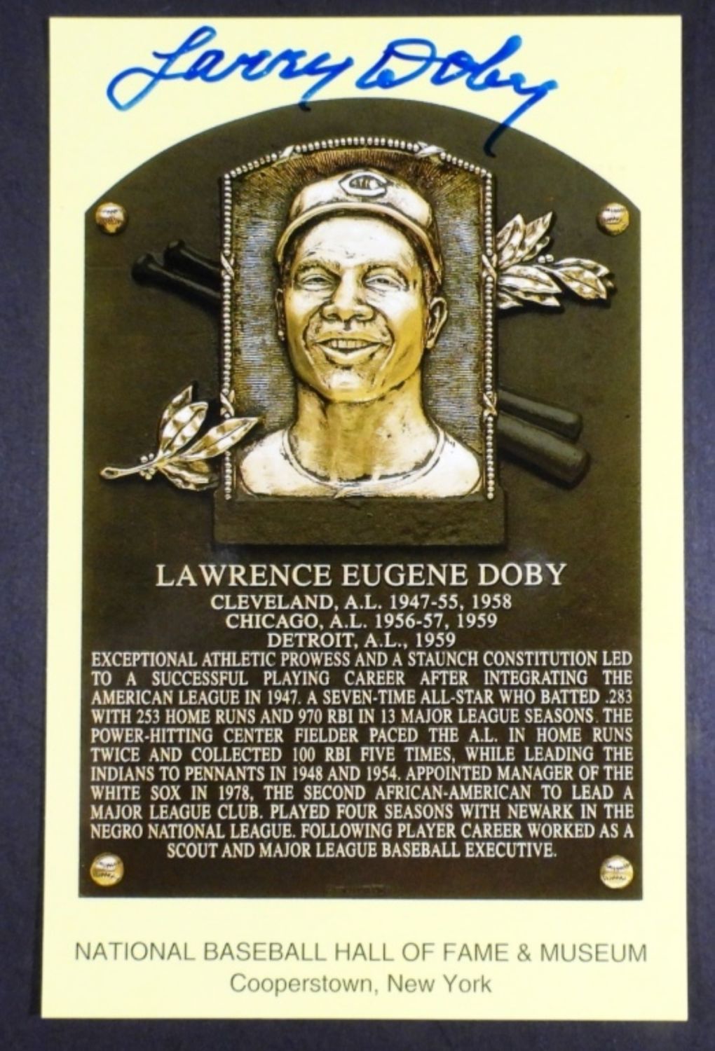 NATIONAL BASEBALL HALL OF FAME SIGNED PLAQUE POSTCARD, SIGNED LARRY DOBY