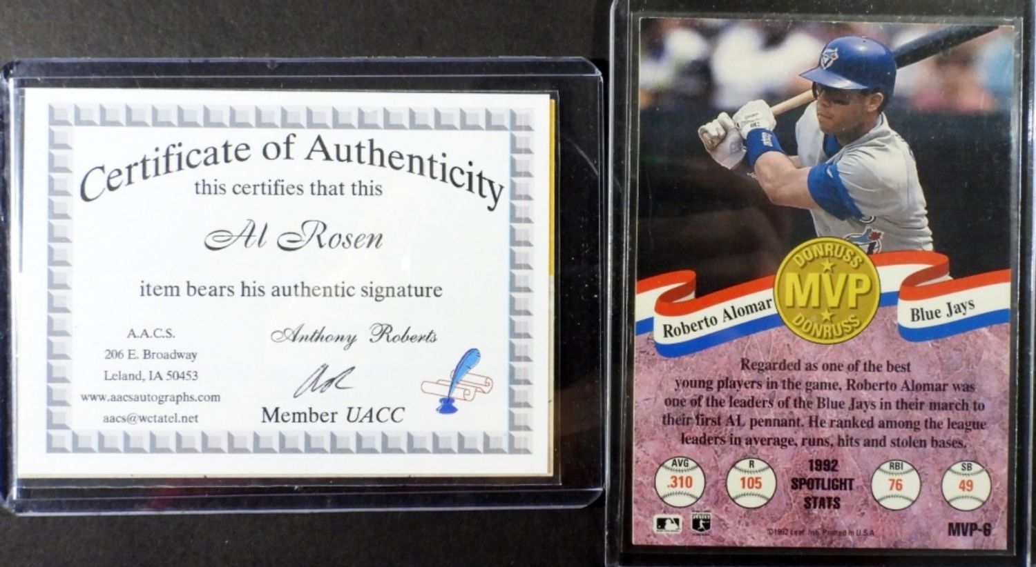 AL ROSEN WITH COA BY A.A.C.S. AUTOGRAPHS; ROBERTO ALOMAR, NO COA