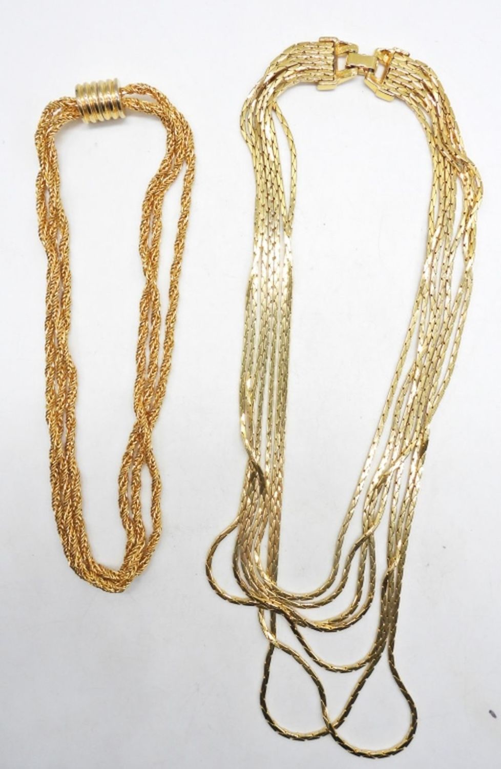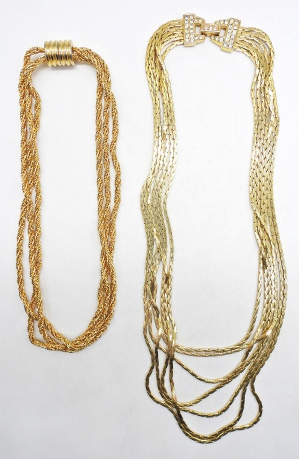 1-16″ ROPE STYLE CHOKER WITH MAGNET CLASP, 1- 18″ COBAR CHAIN WITH OPEN BOX CLASP AND CLEAR STONES, NO MARKINGS FOR ANY
