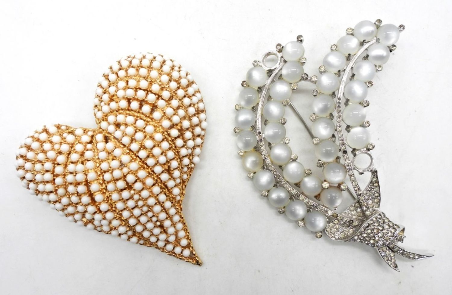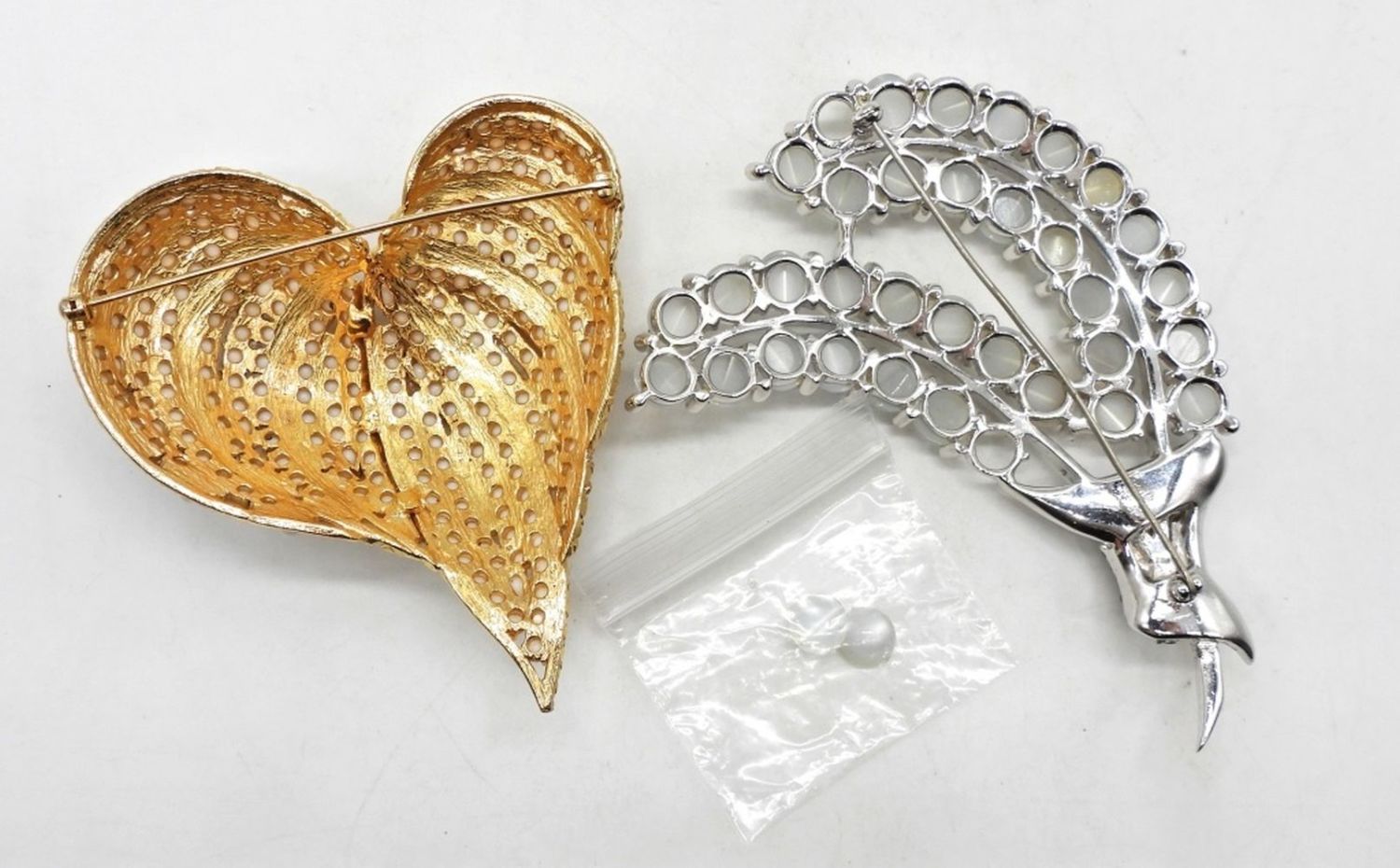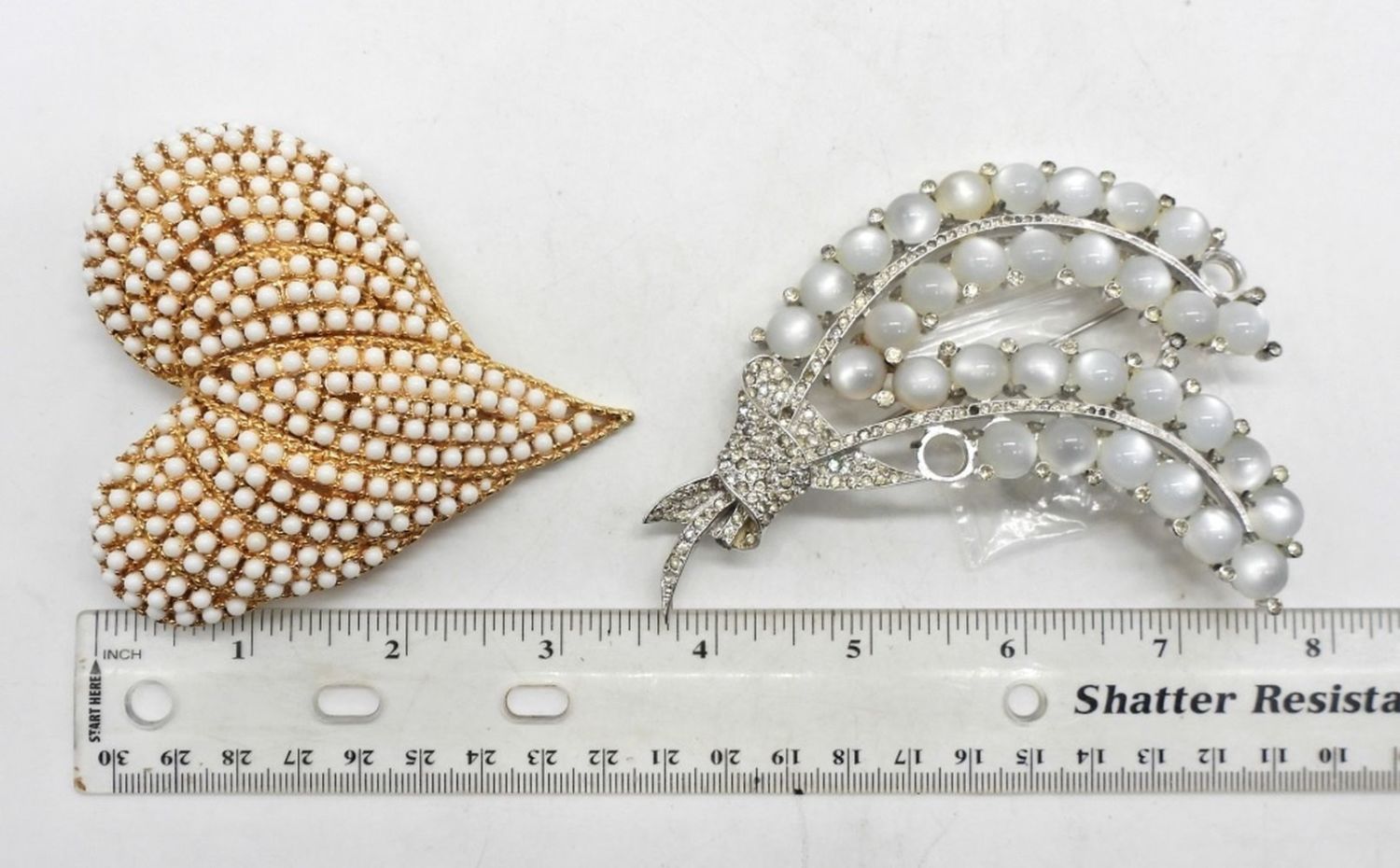 4″ LONG FOR BOTH, 1- GOLD TONE HEART WITH WHITE BEADING, 1- FEATHER STYLE DESIGN (MISSING 3 LITTLE RHINESTONE, AND 2 OF LARGER BEADING BUT DO HAVE ATTACHED FOR REPAIR)