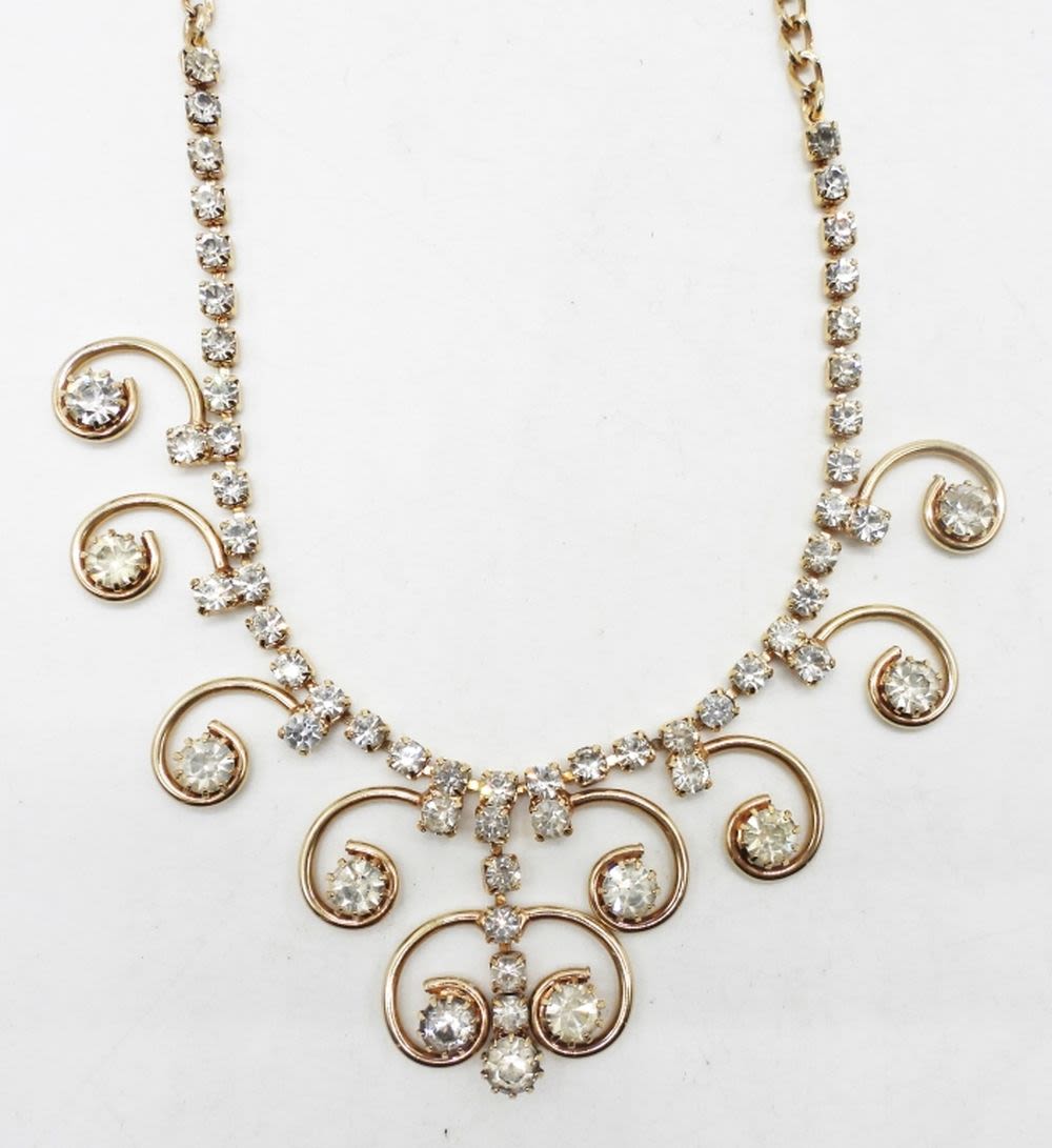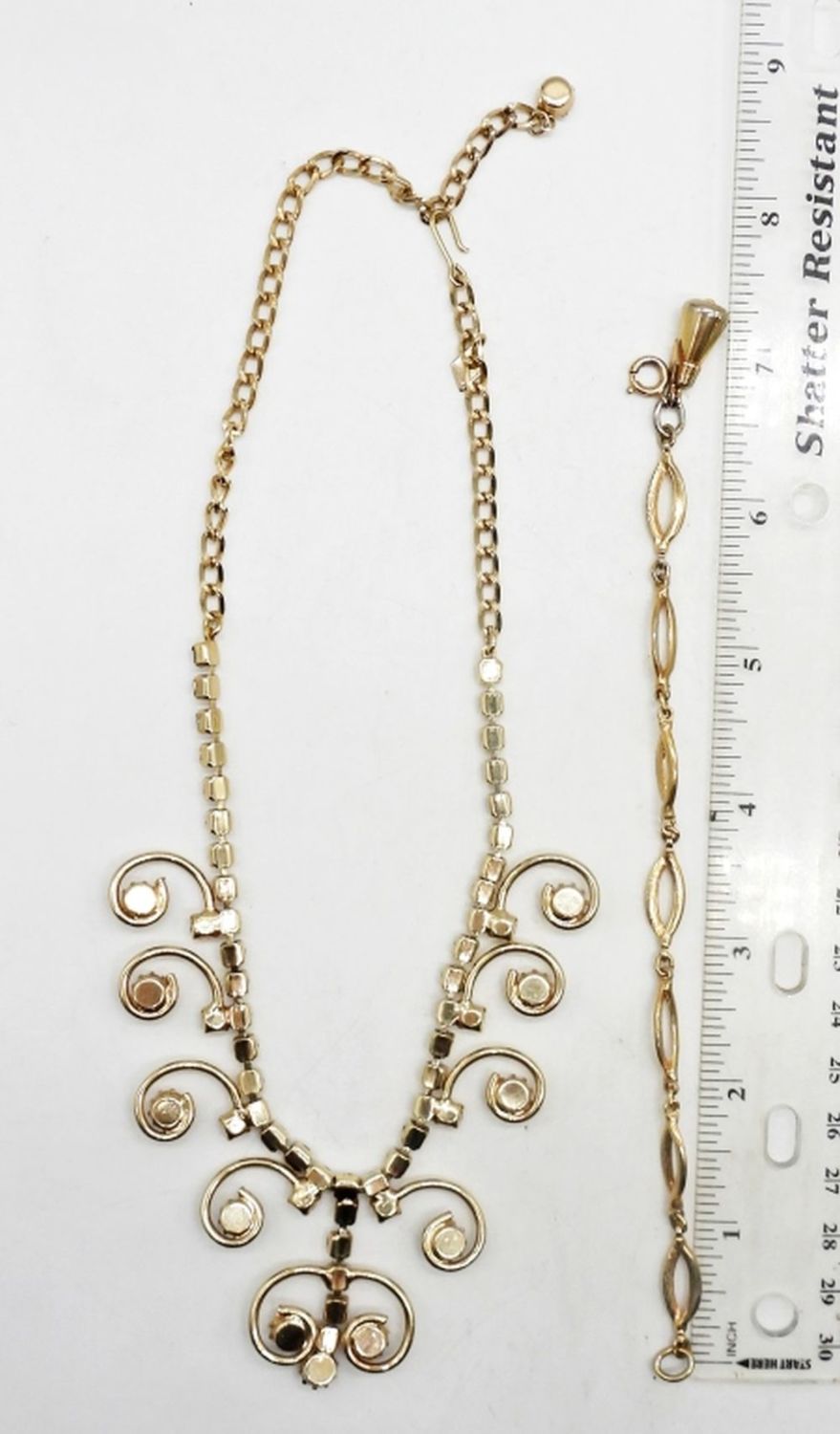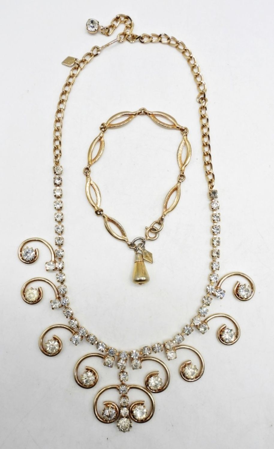 17″ LONG, GOLD TONE WITH CLEAR STONES, STAMPED SARAH COV NEAR HOOK CLASP, 7 1/2″ LONG STAMPED NEAR LOBSTER CLASP